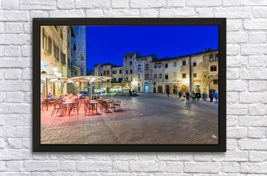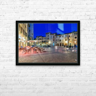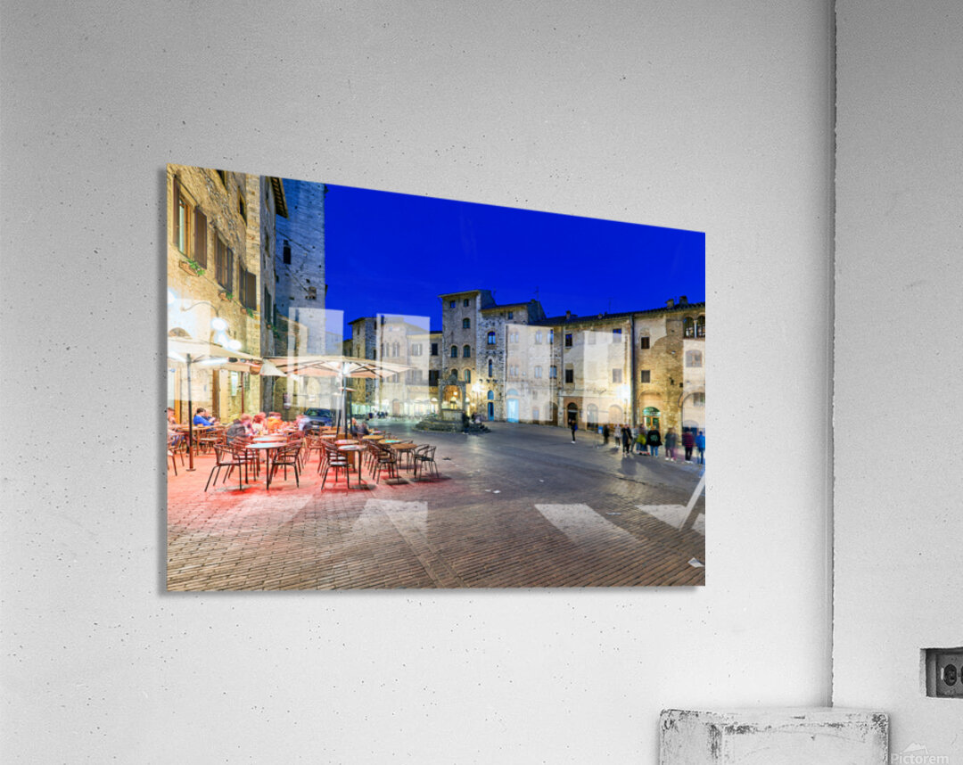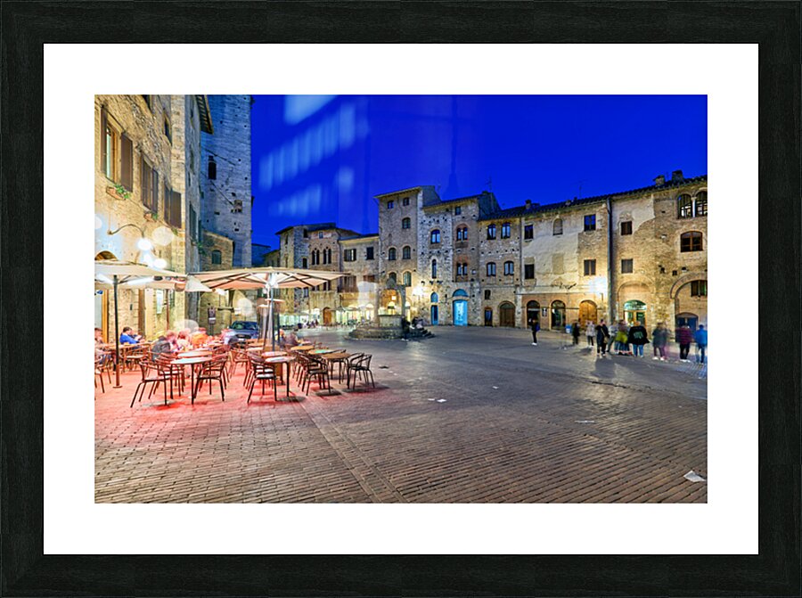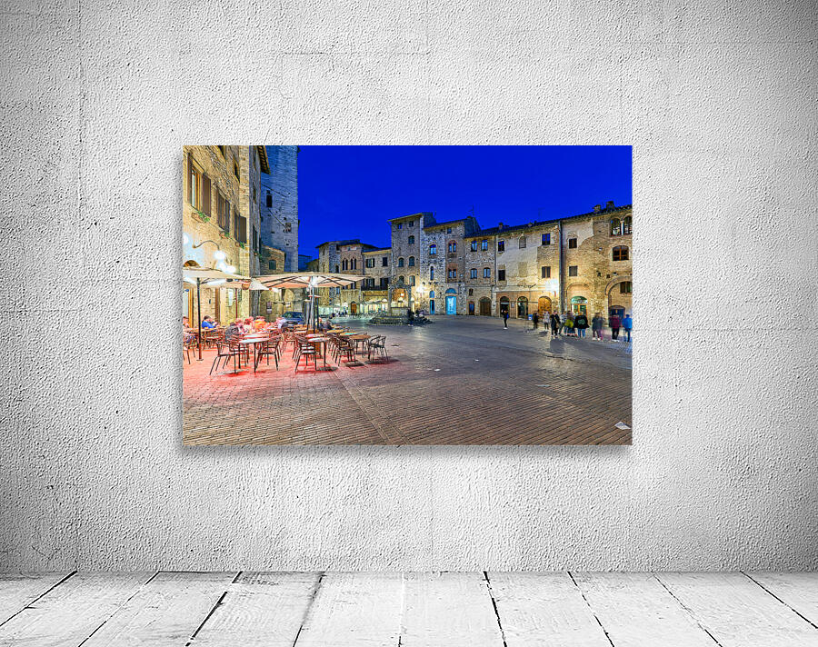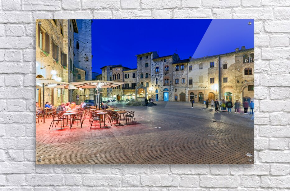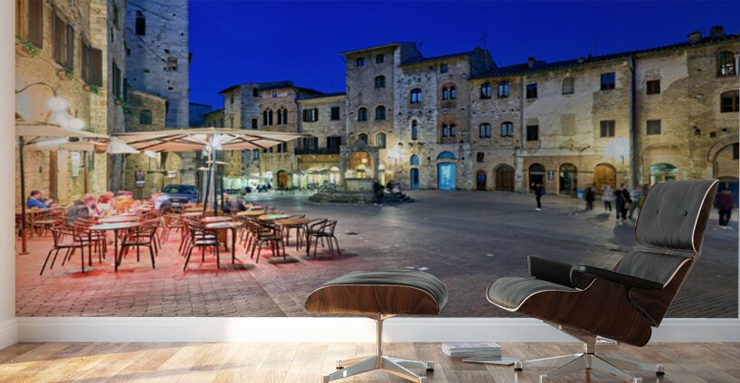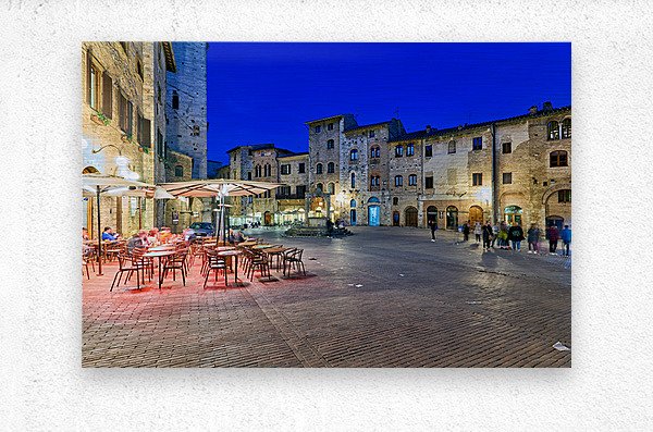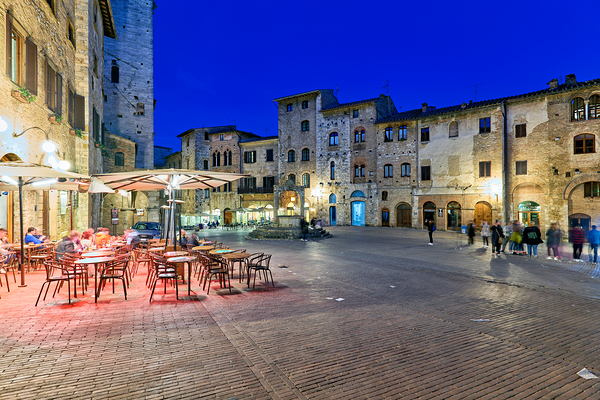 People walk through Piazza della Cisterna as the sun sets over San Gimignano creating a lively atmosphere in this historic square.