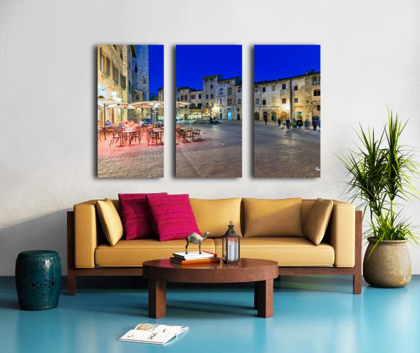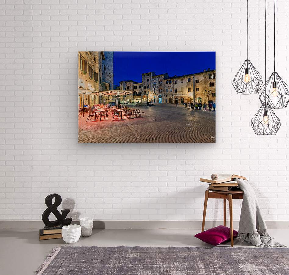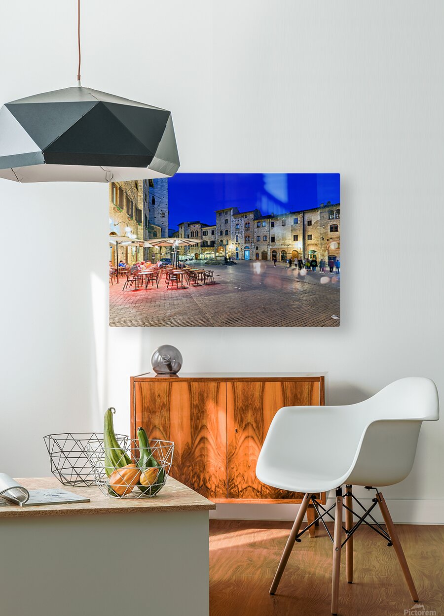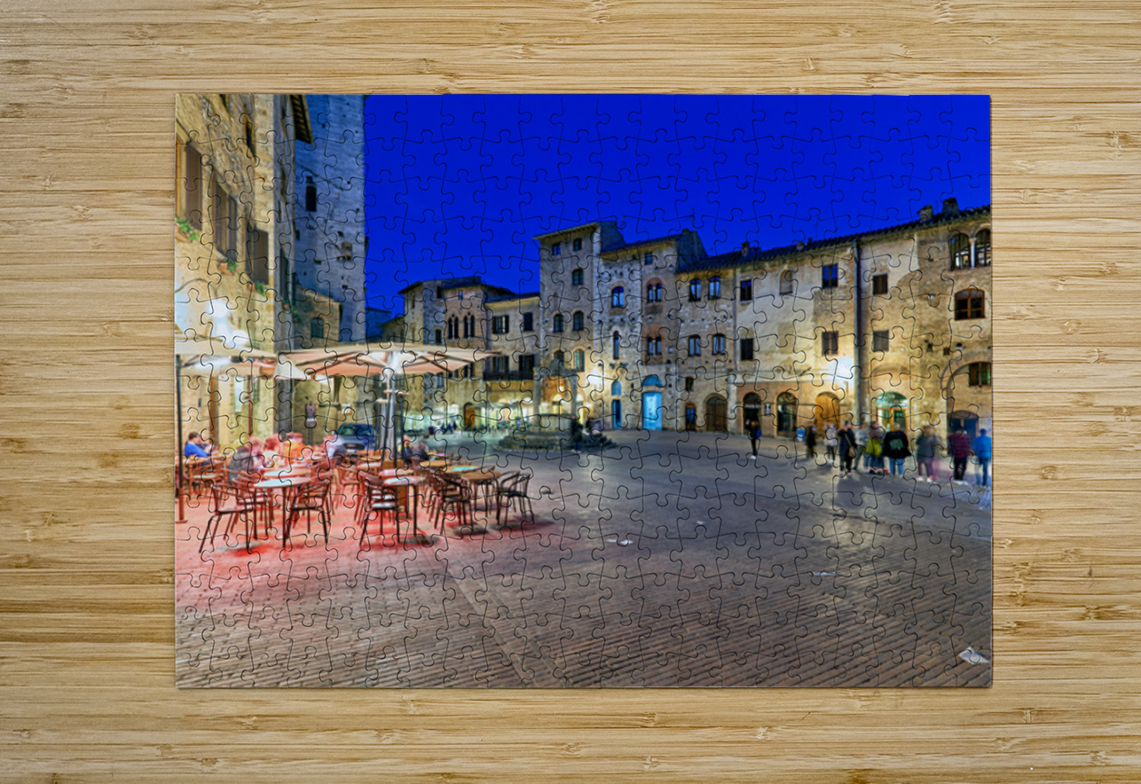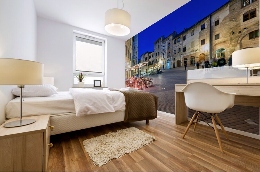 People walk through Piazza della Cisterna as the sun sets over San Gimignano creating a lively atmosphere in this historic square.