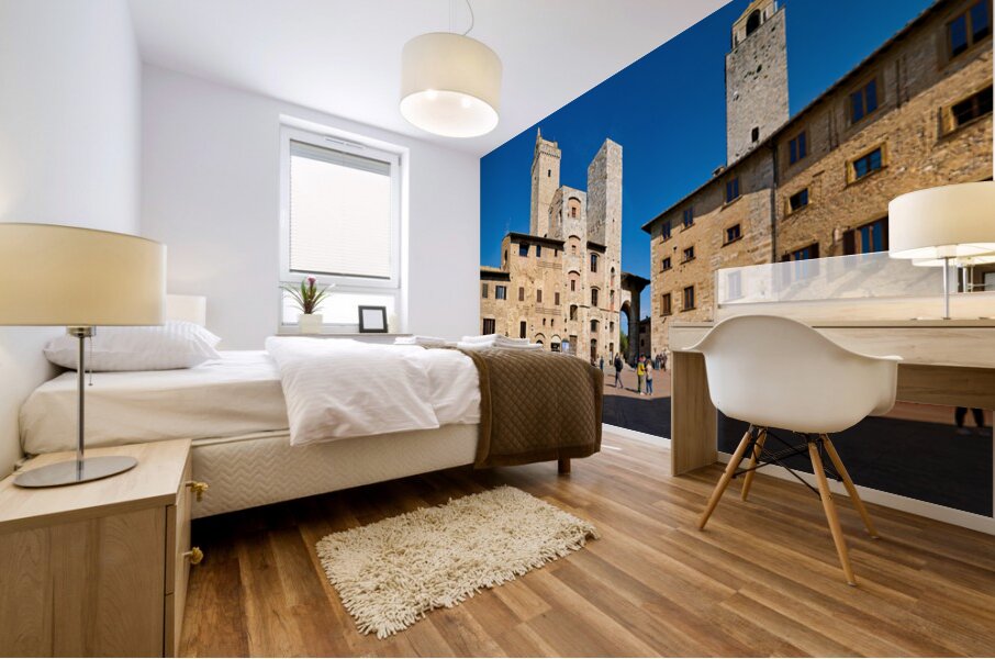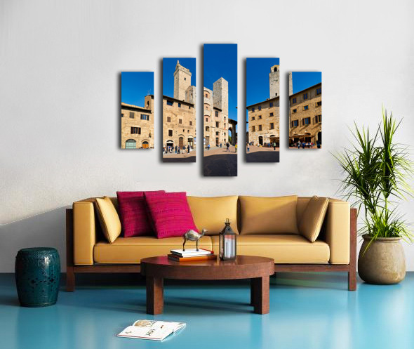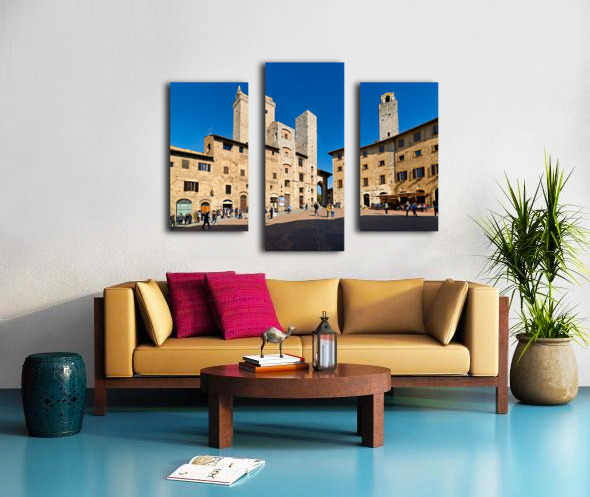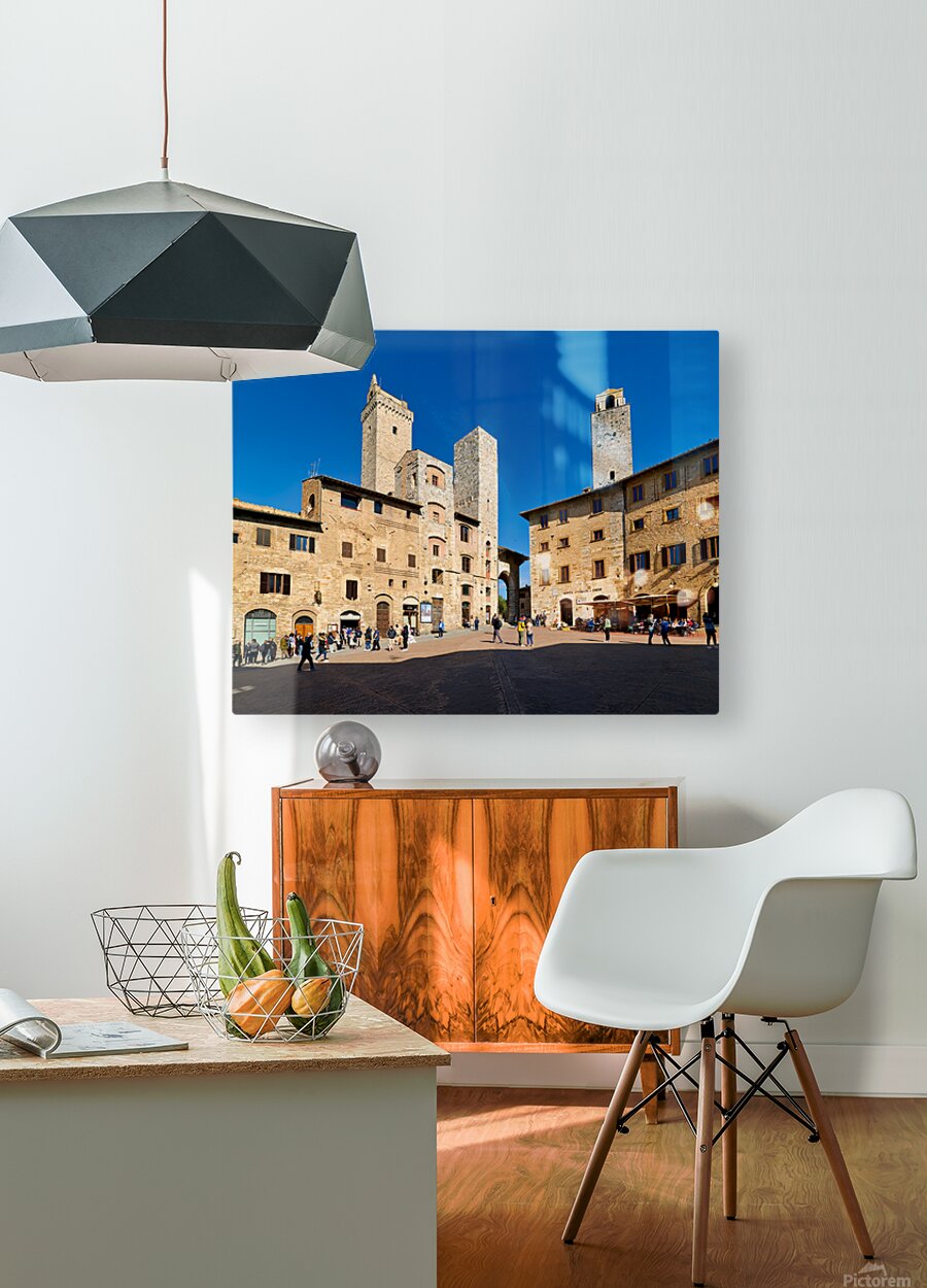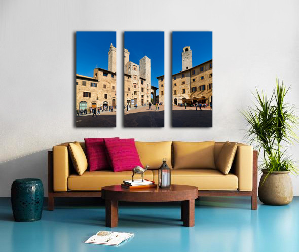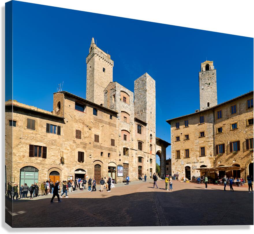 Get this artwork "Visitors explore Piazza della Cisterna in San Gimignano" in a framed print.