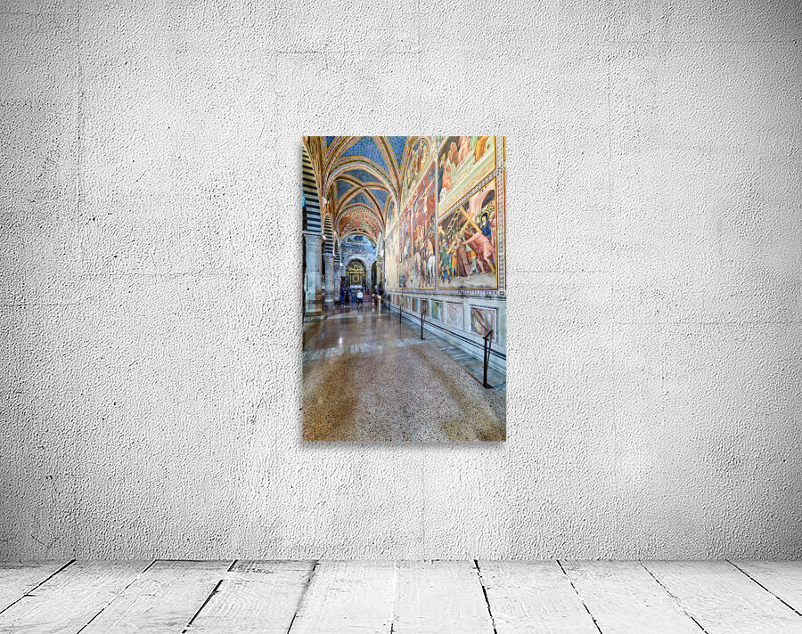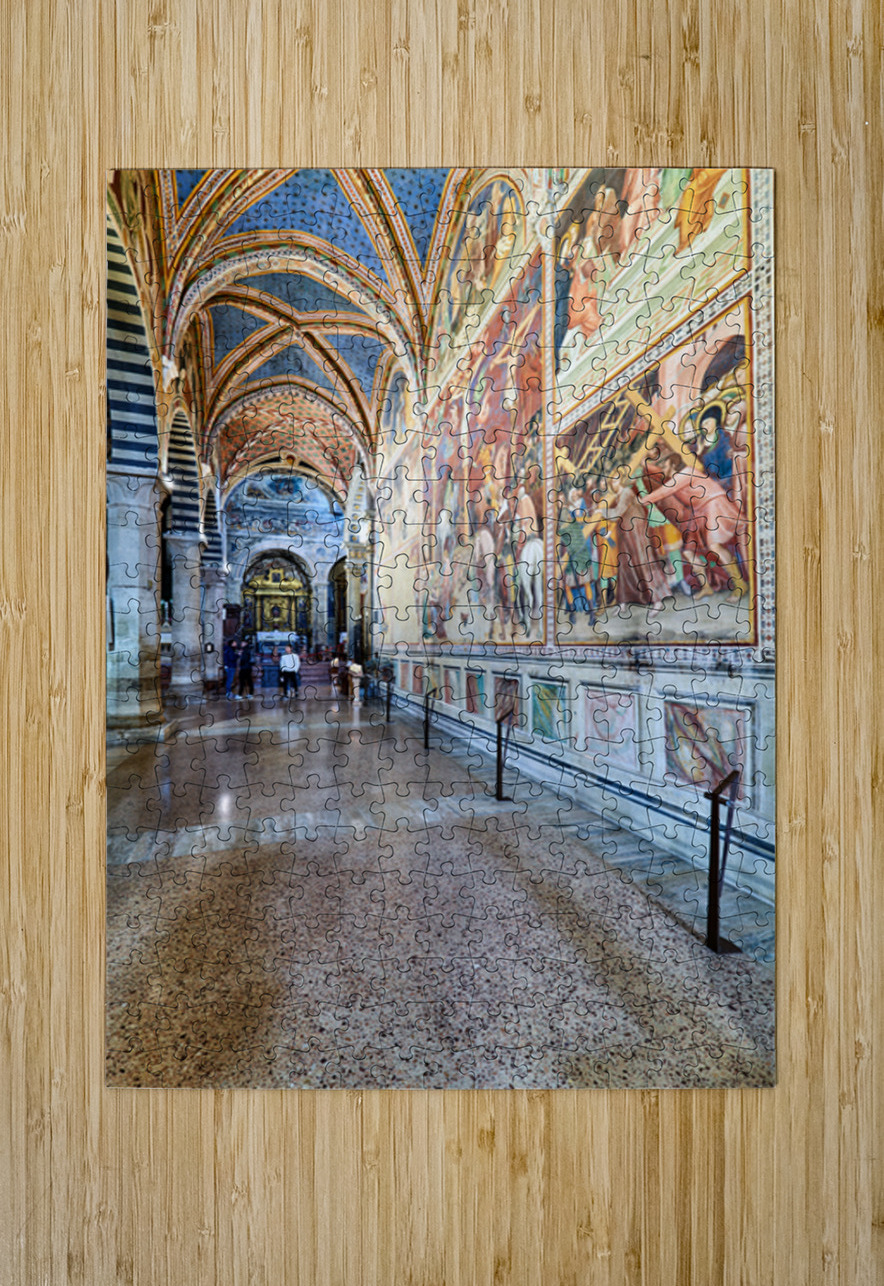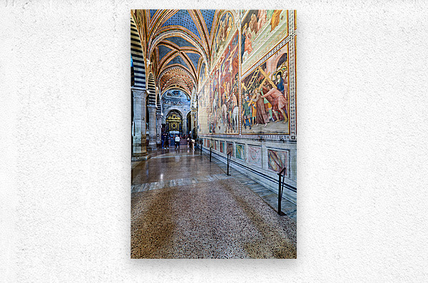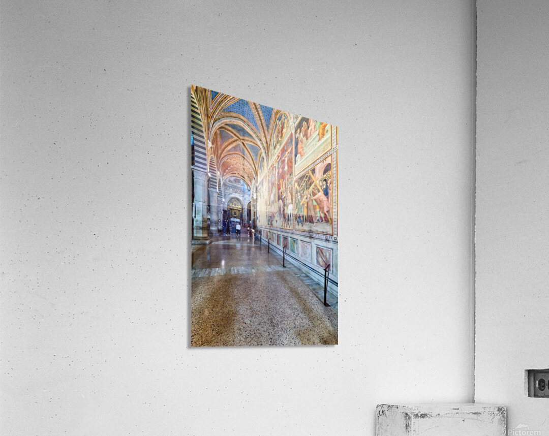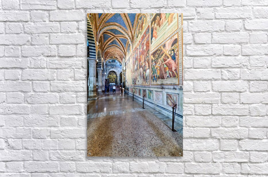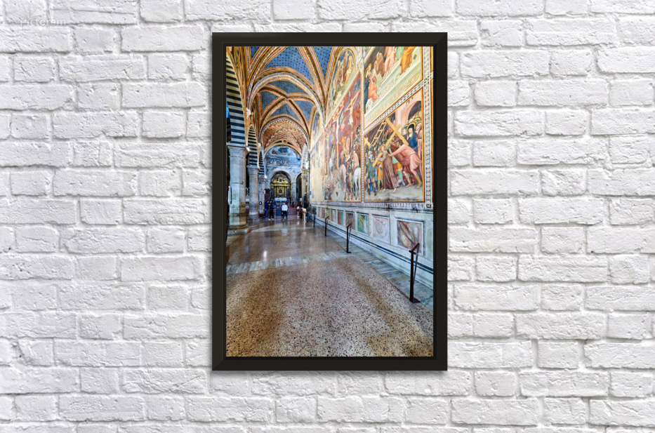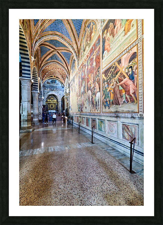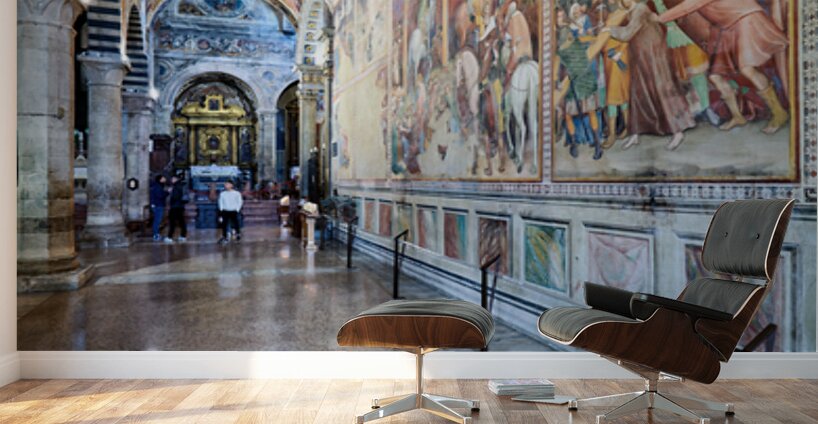Visitors walk through the Collegiata di Santa Maria Assunta in San Gimignano admiring the artwork and architecture of the cathedral.
