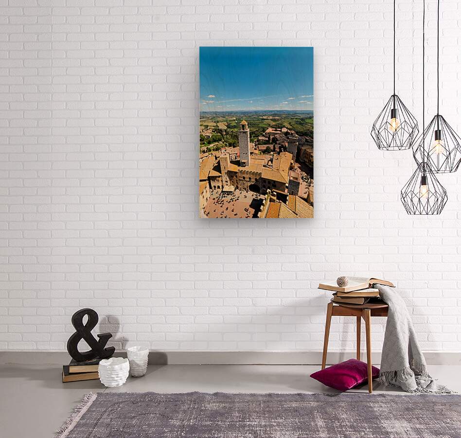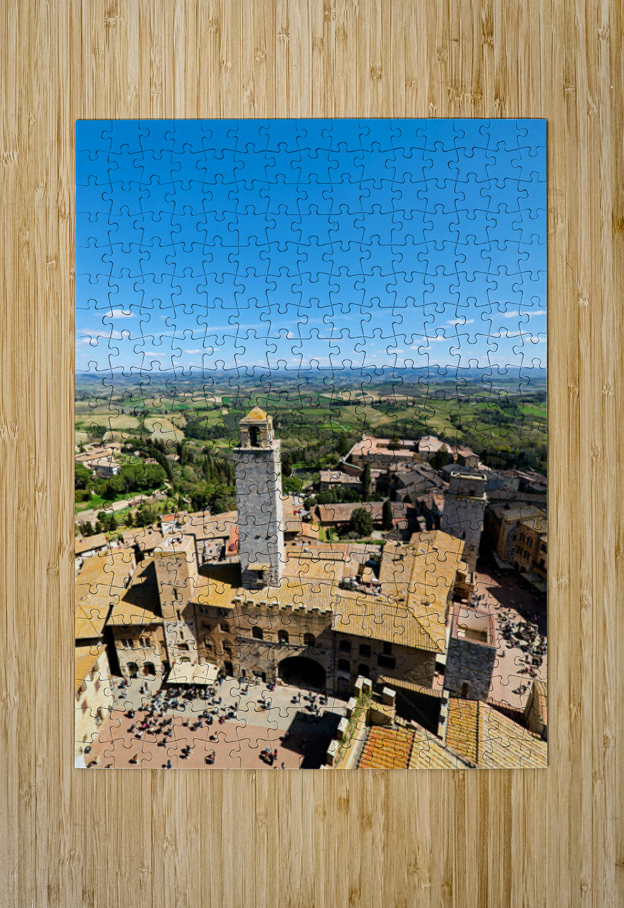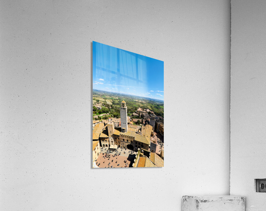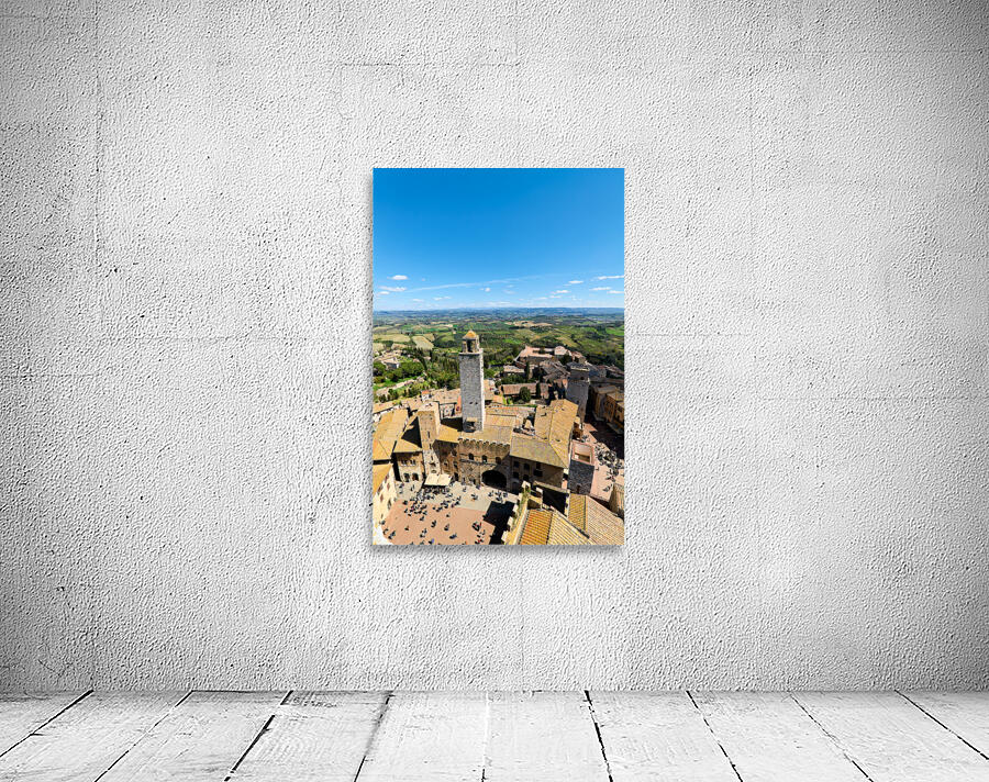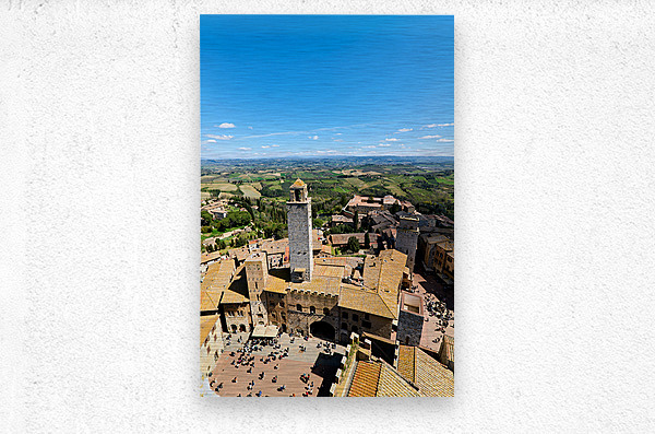 A view from above shows the historic center of San Gimignano with towers and buildings under a clear blue sky.