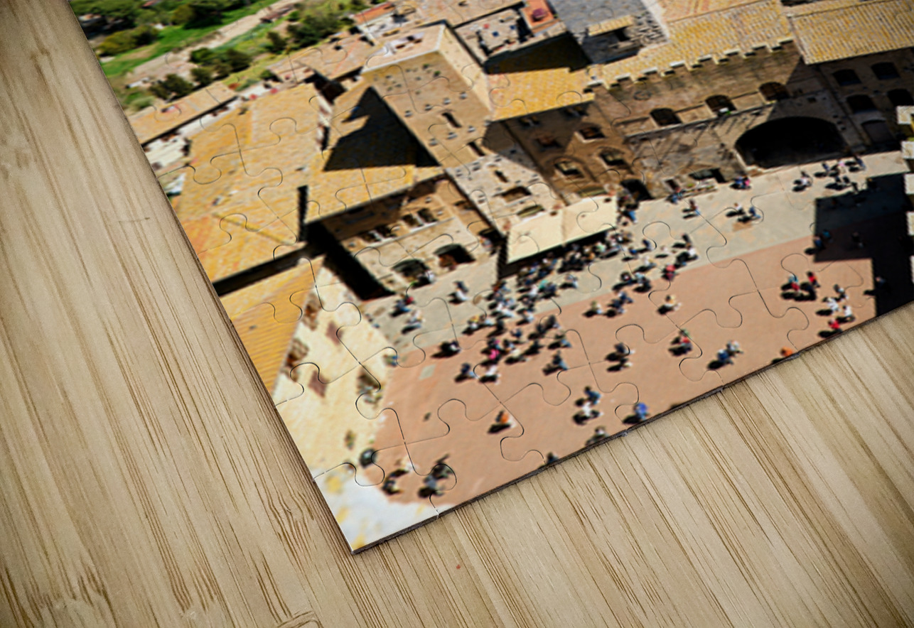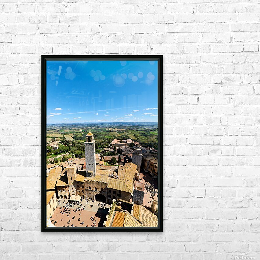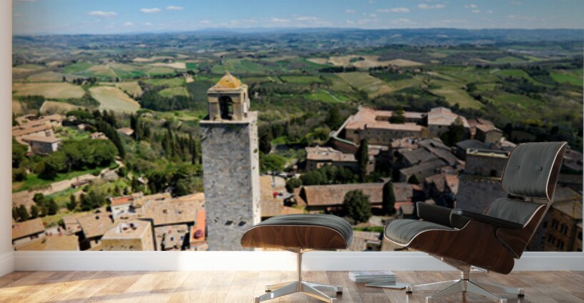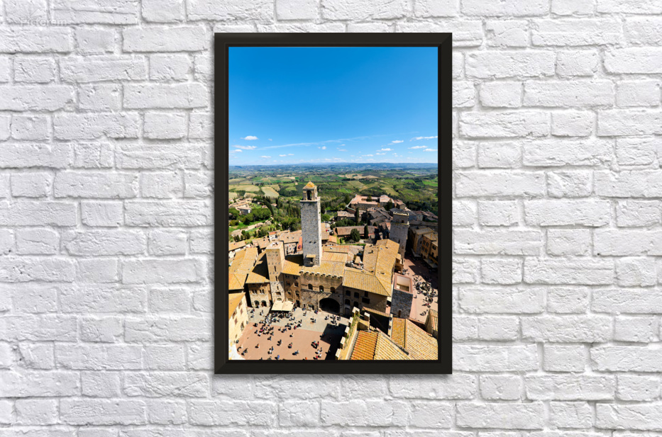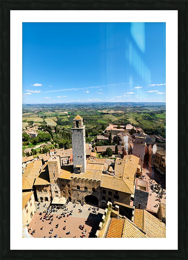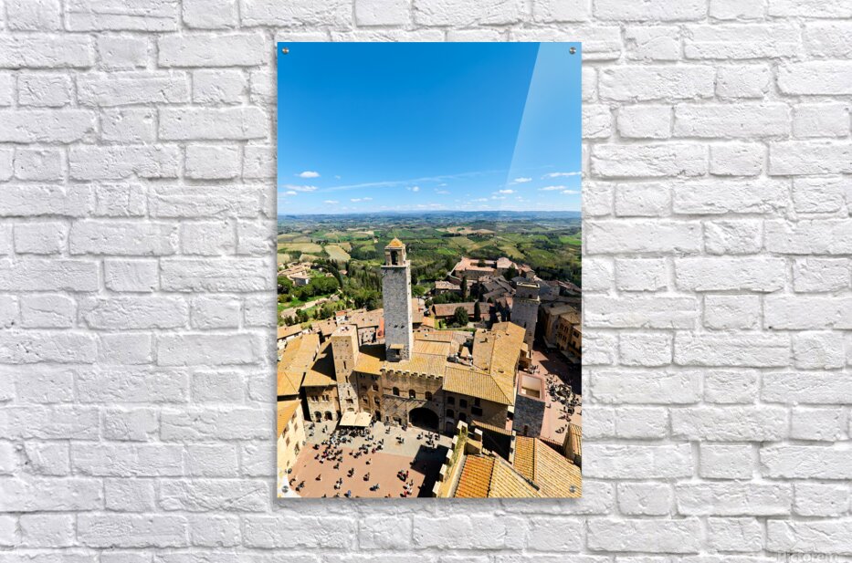 A view from above shows the historic center of San Gimignano with towers and buildings under a clear blue sky.