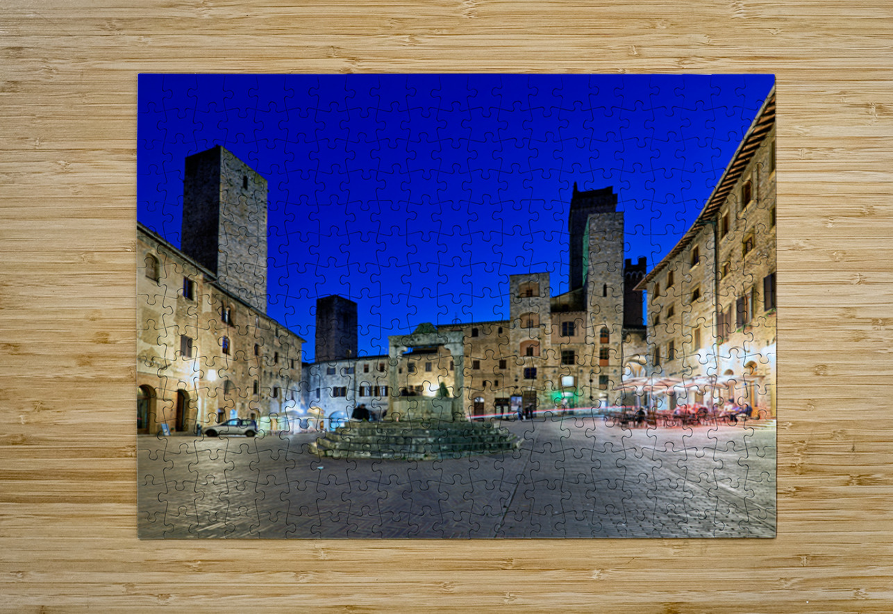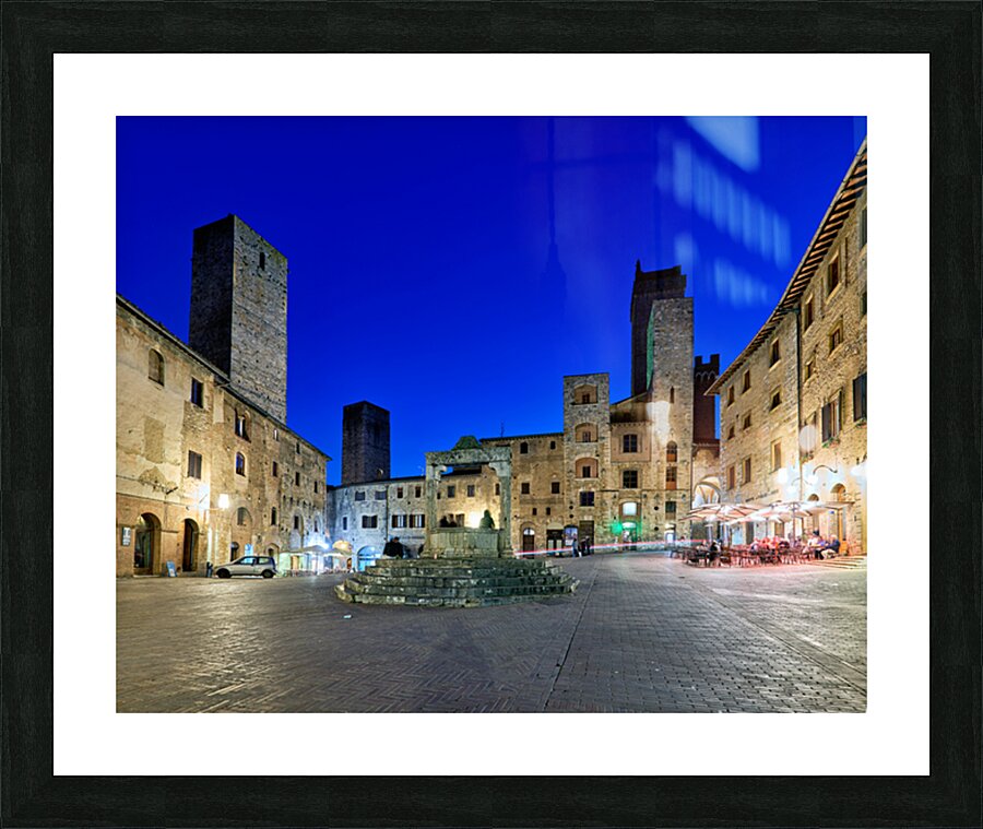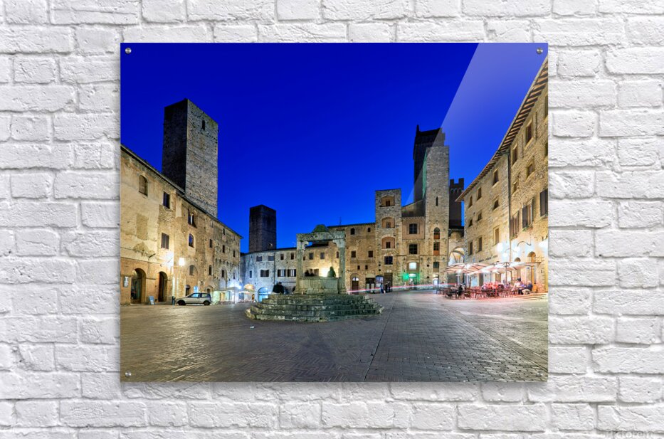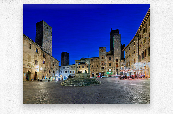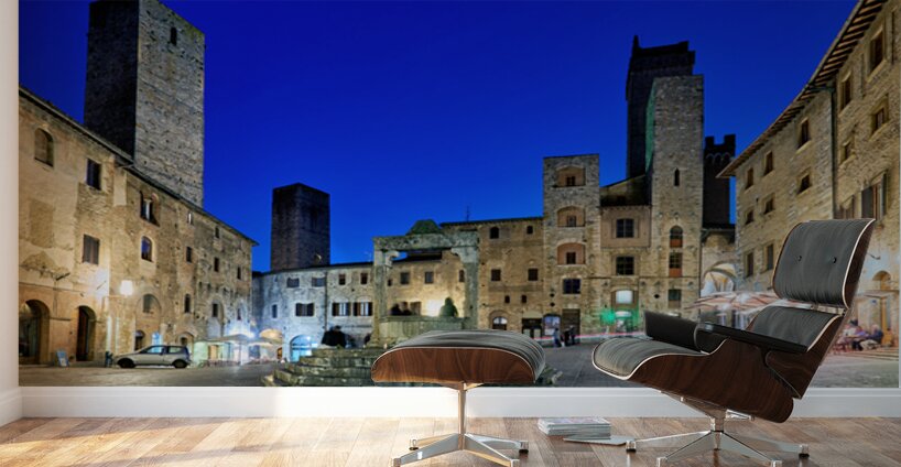 People gather in Piazza della Cisterna while the sun sets over San Gimignano. The tall towers stand above the historic buildings.