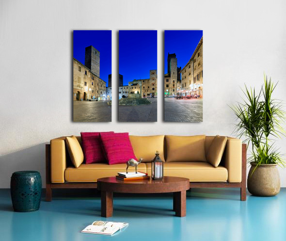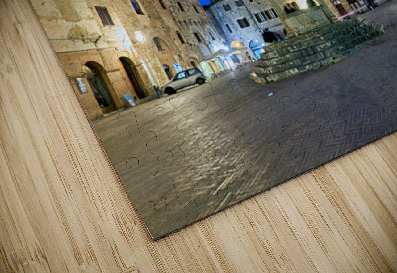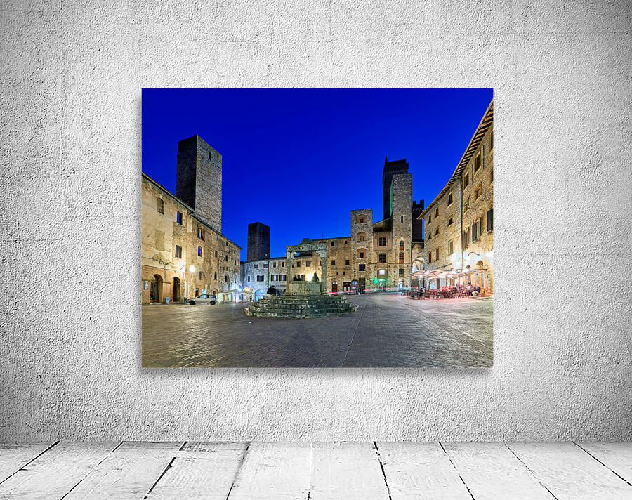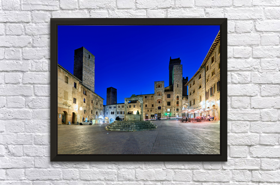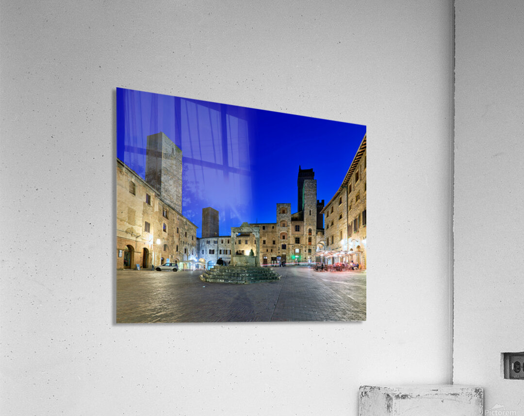 People gather in Piazza della Cisterna while the sun sets over San Gimignano. The tall towers stand above the historic buildings.