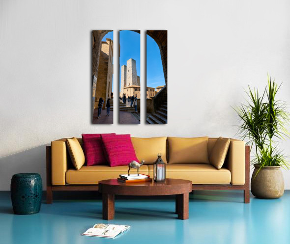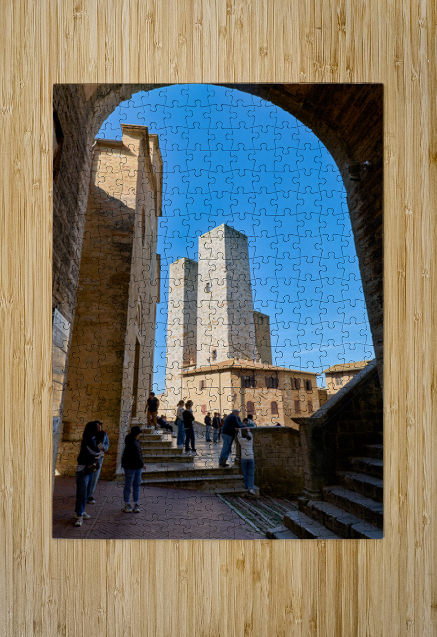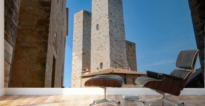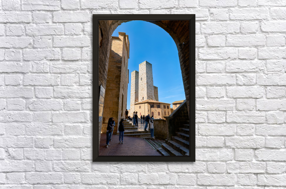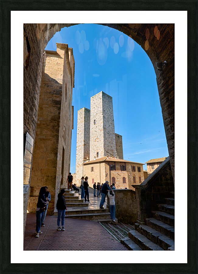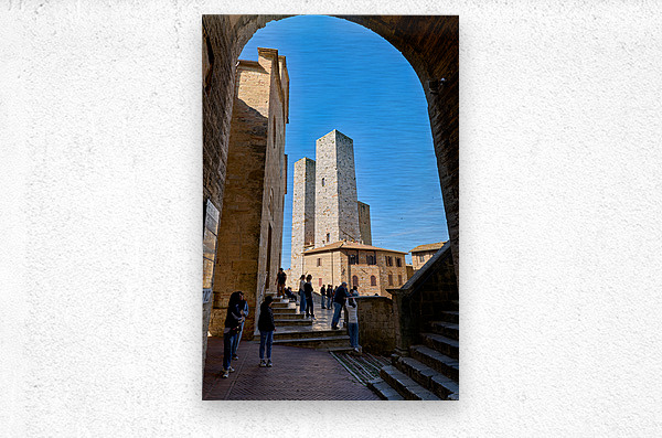 Tourists gather at Piazza del Duomo in San Gimignano looking at the buildings and towers under a clear sky in Tuscany Italy.