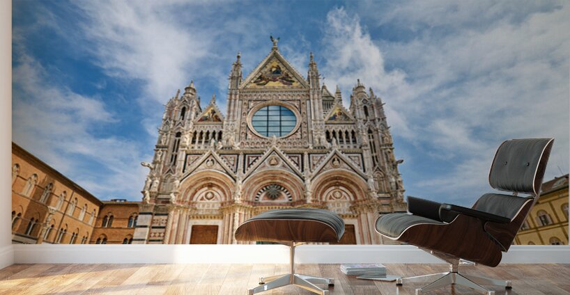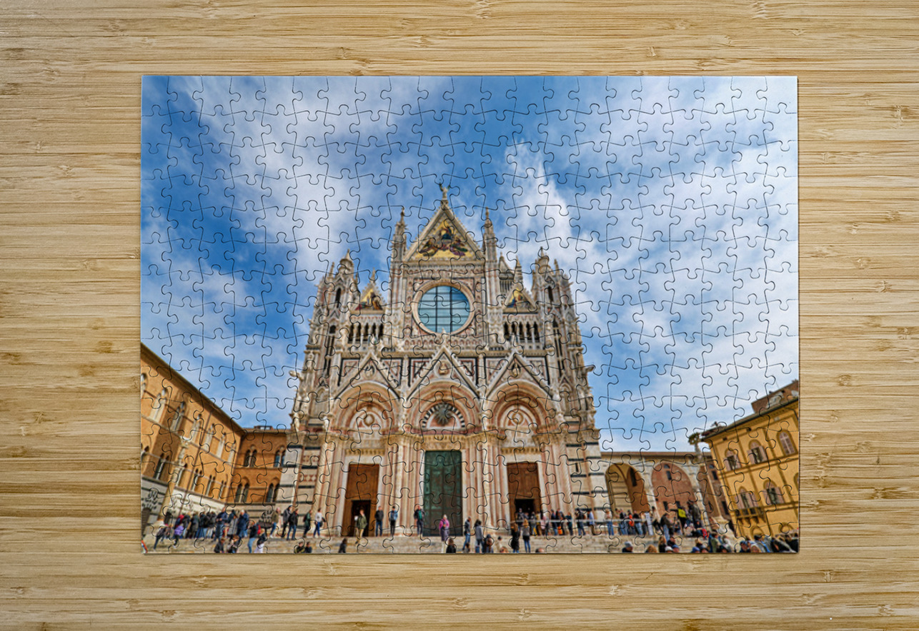 People explore the Cathedral in Siena Tuscany under a clear sky. The building features detailed architecture and rich history.