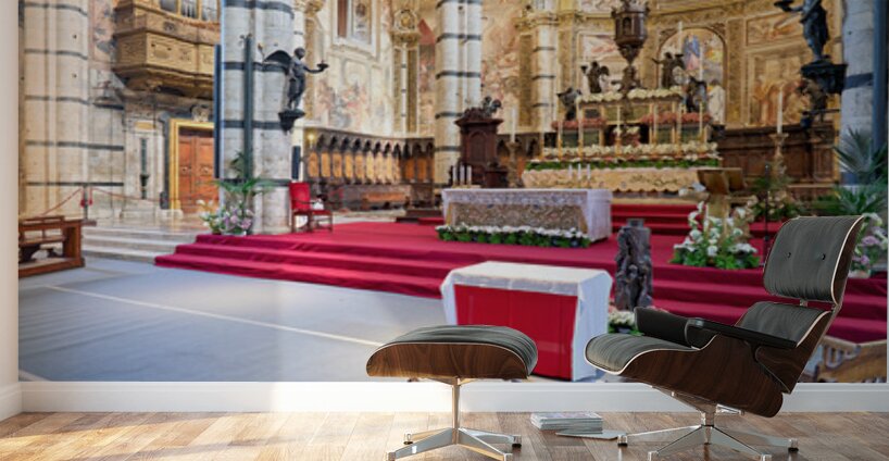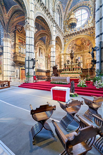 Inside the Siena Cathedral the altar is visible with decorations on the walls and colorful glass revealing church art and architecture.