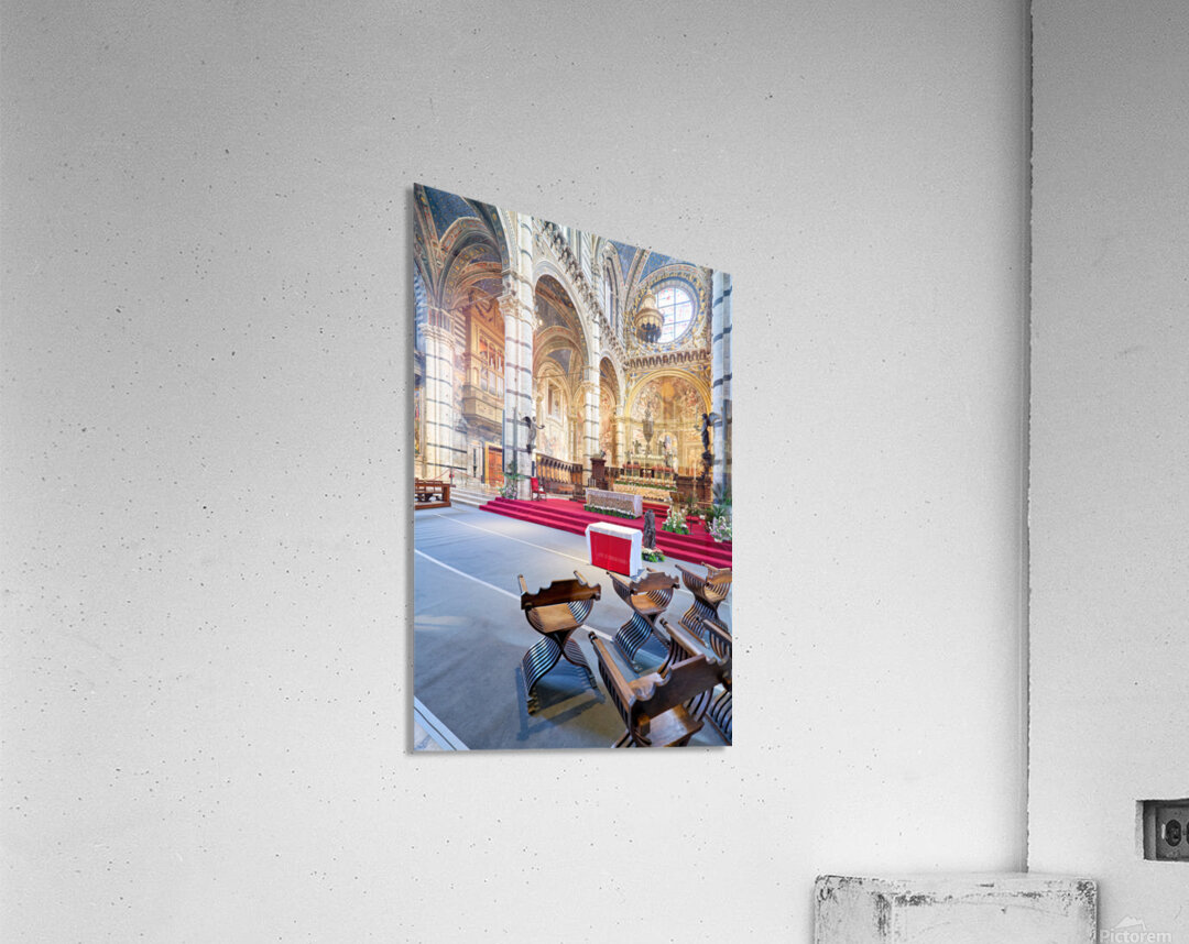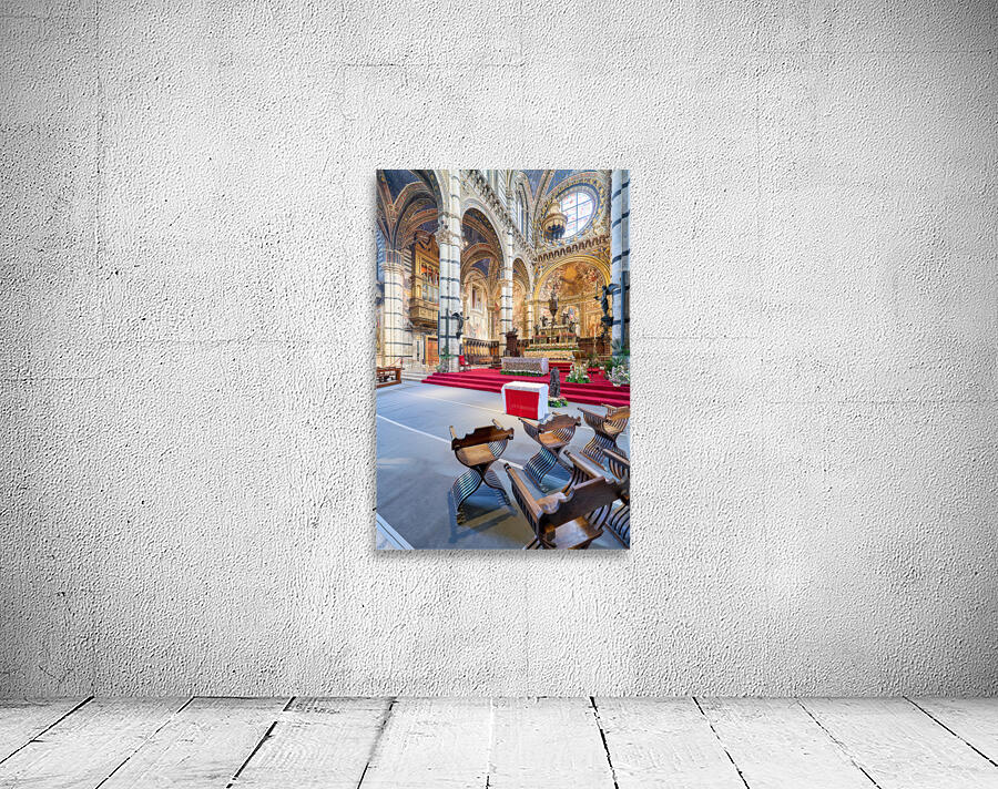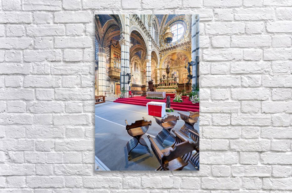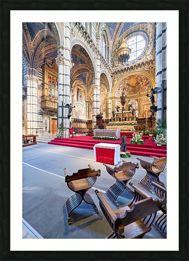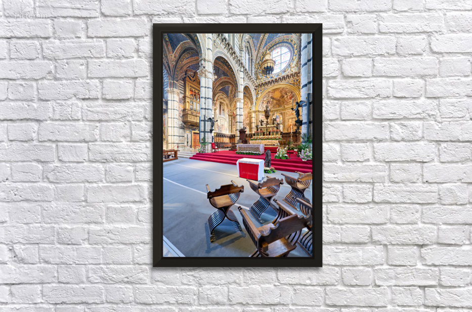 "Siena Cathedral features a stunning altar and designs" in a framed print.