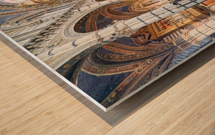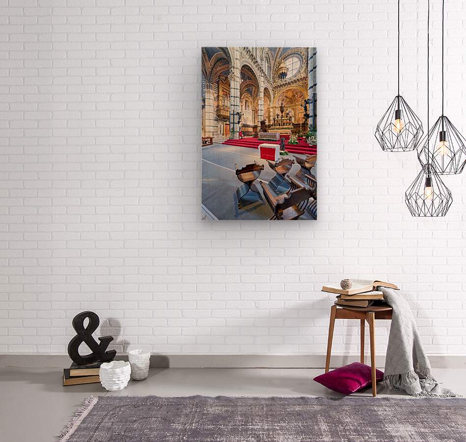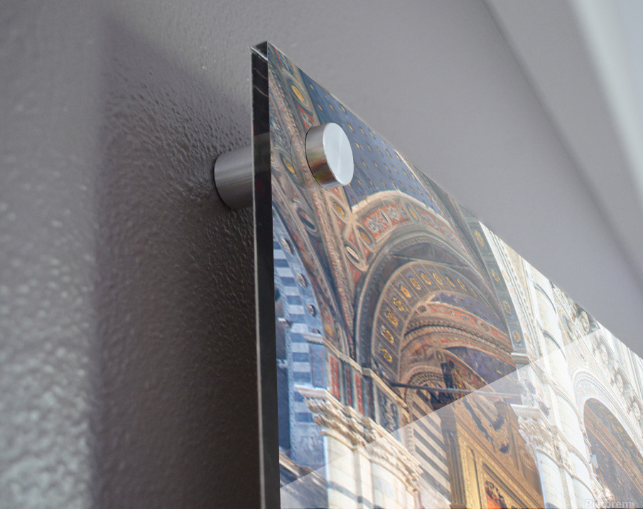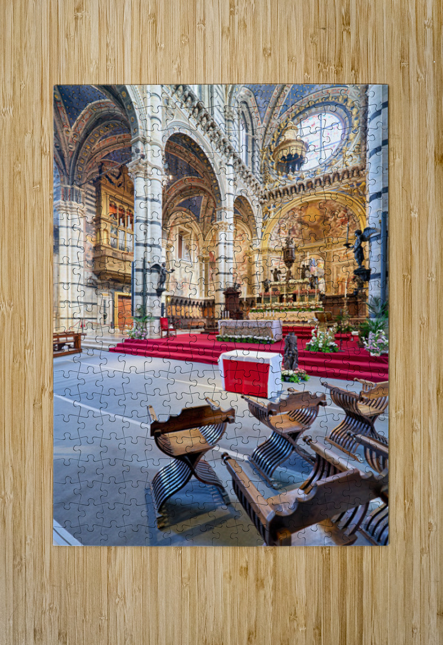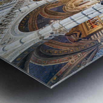 "Siena Cathedral features a stunning altar and designs" in a framed print.
