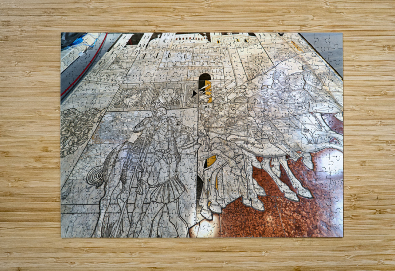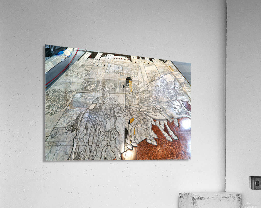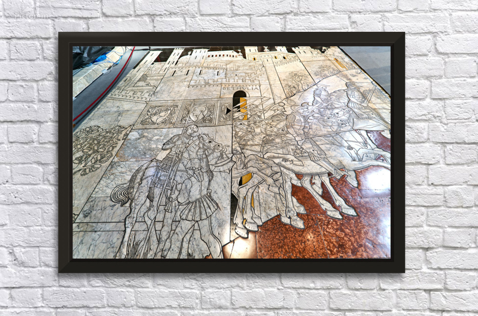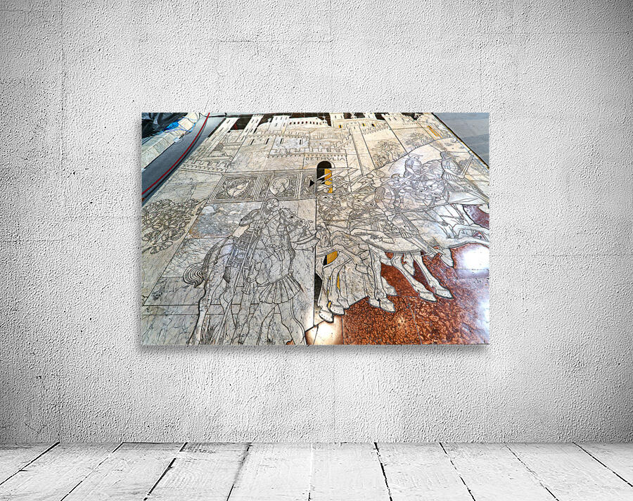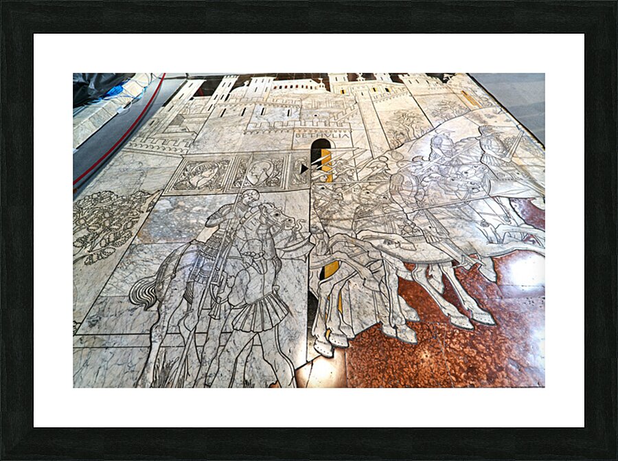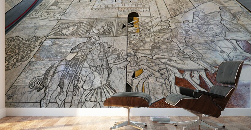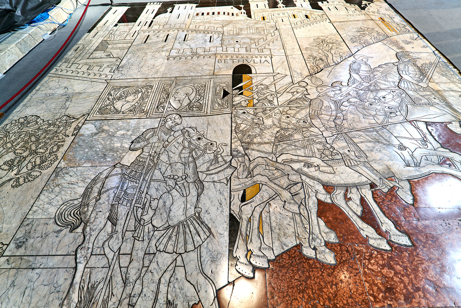 The marble mosaic floor shows historical scenes and figures in Siena Cathedral Tuscany. Skilled artisans created detailed artwork in stone.