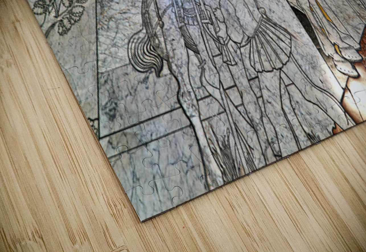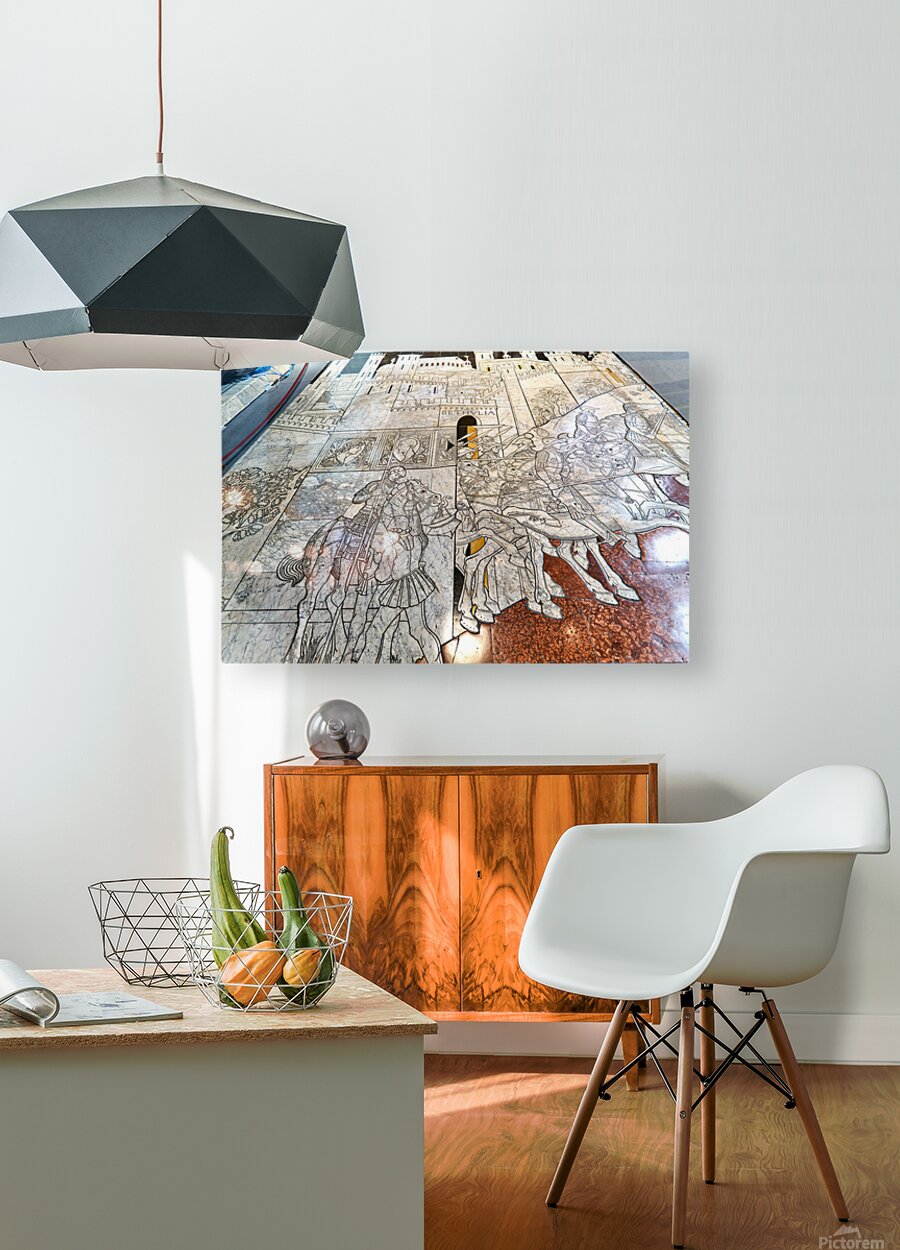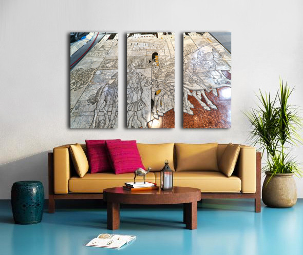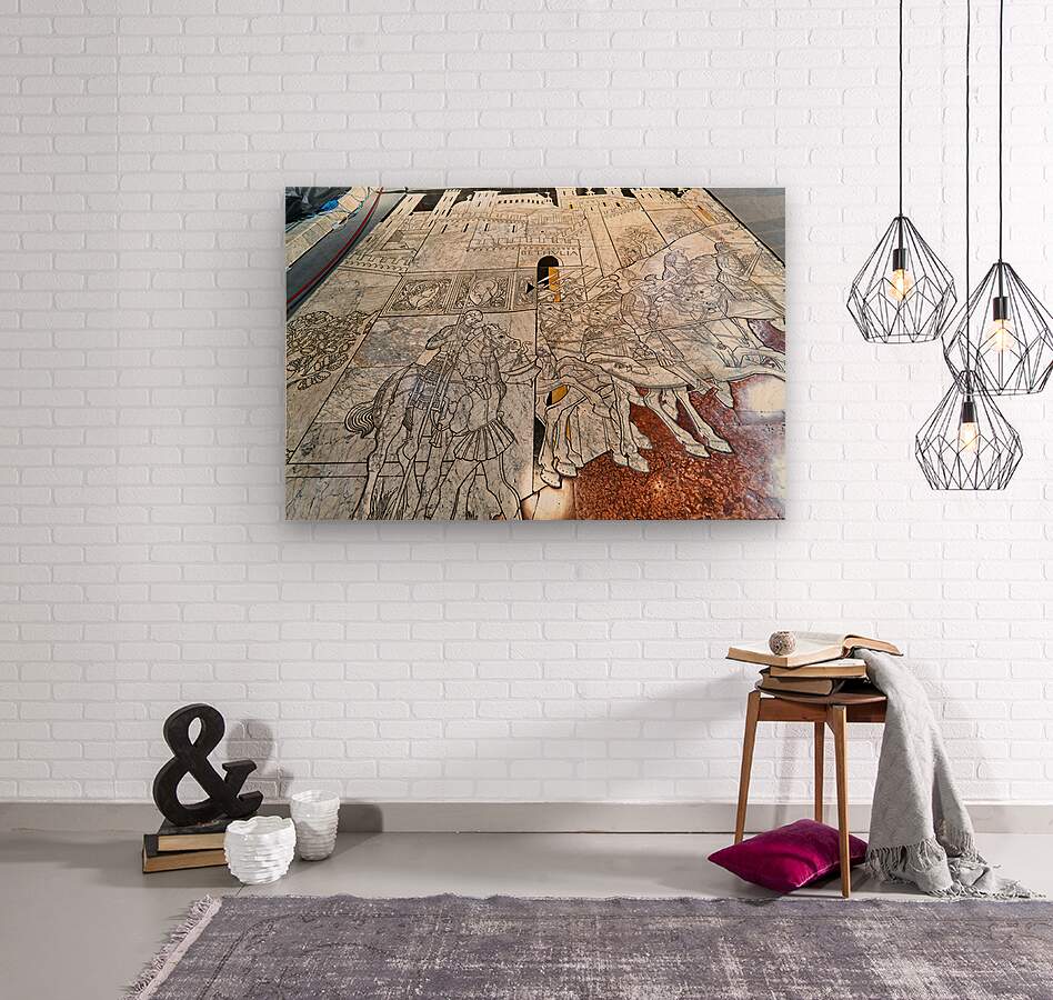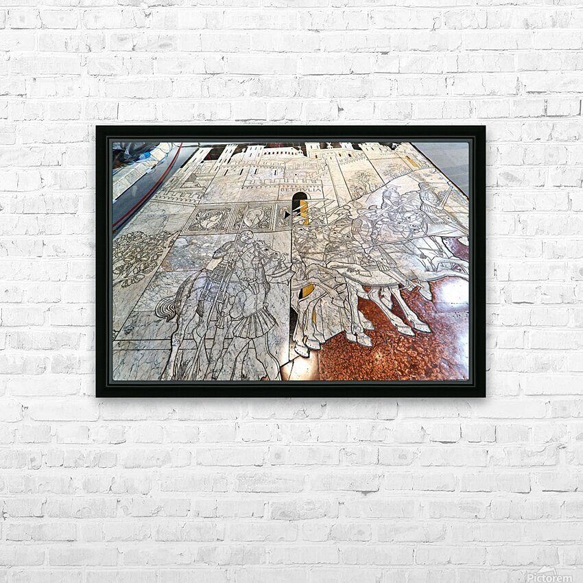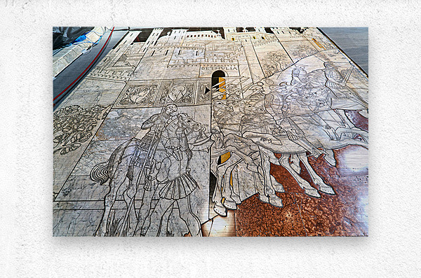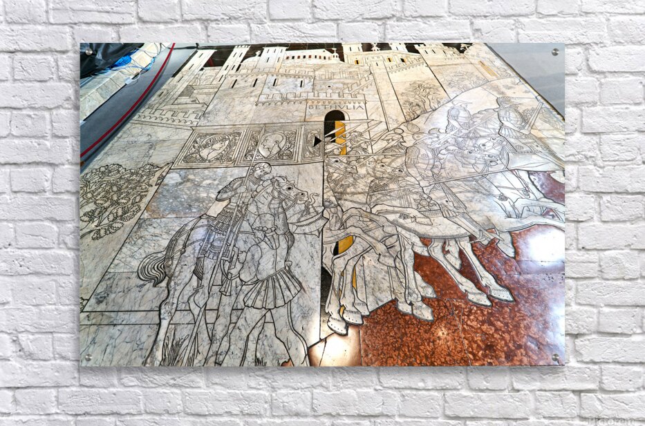 The marble mosaic floor shows historical scenes and figures in Siena Cathedral Tuscany. Skilled artisans created detailed artwork in stone.