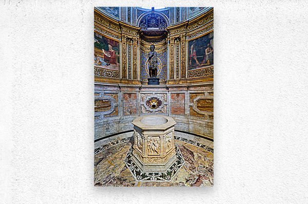 San Giovanni Battista statue stands inside the Siena Cathedral in Tuscany Italy. The setting includes ornate walls and a decorative baptismal font.