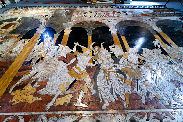 Visitors view the marble mosaic floor in Siena Cathedral showing the scene of the slaughter of the innocents.