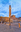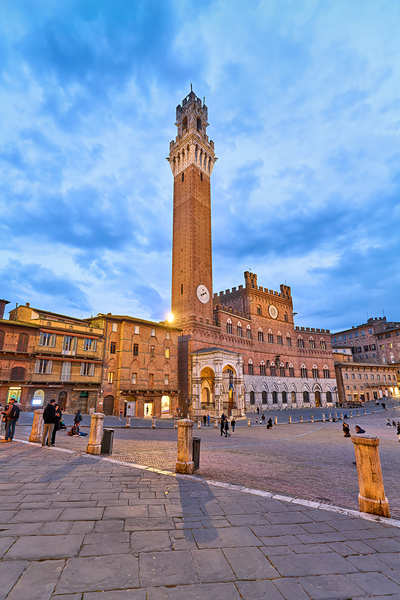 People walk around Piazza del Campo as the sun sets over Siena. The tall tower stands against the colorful sky.