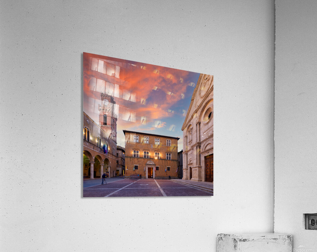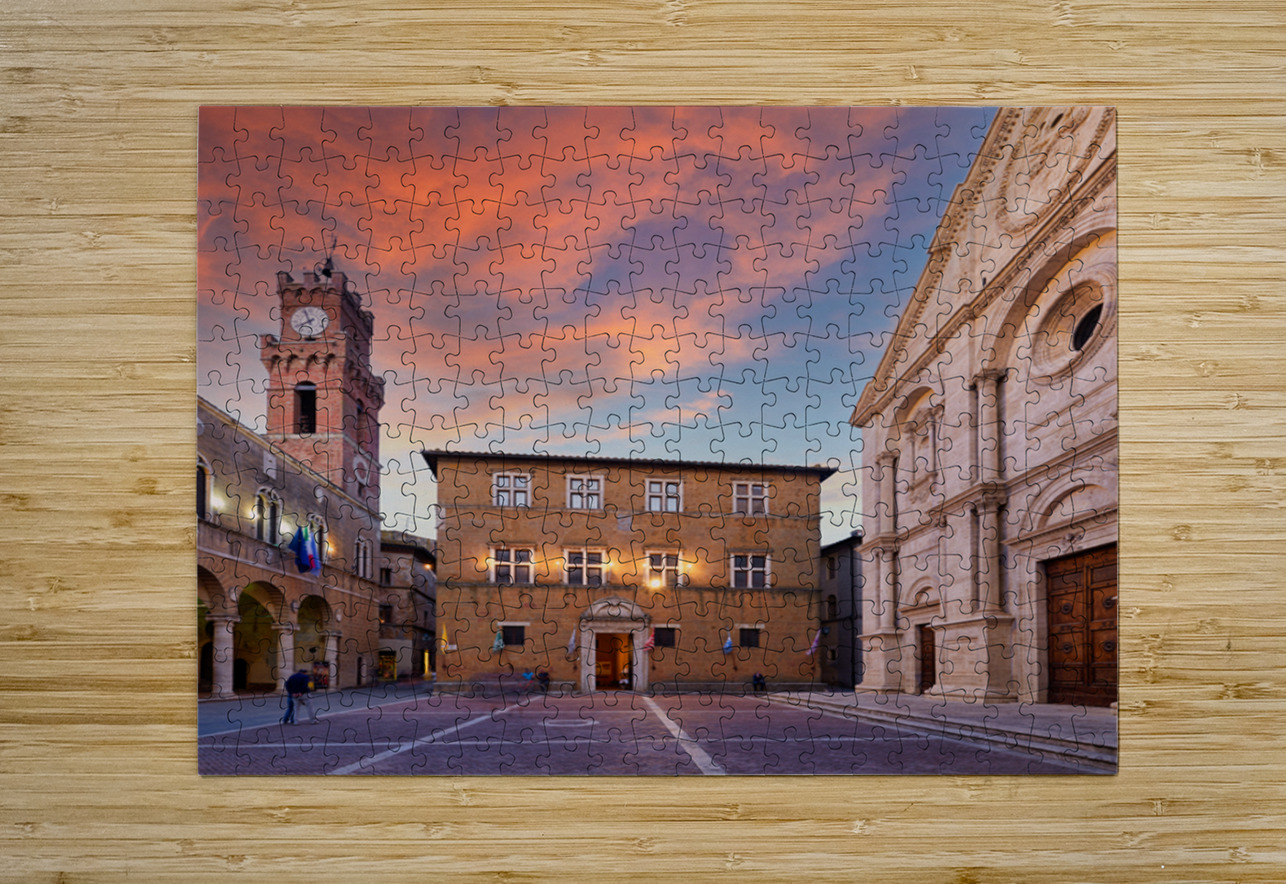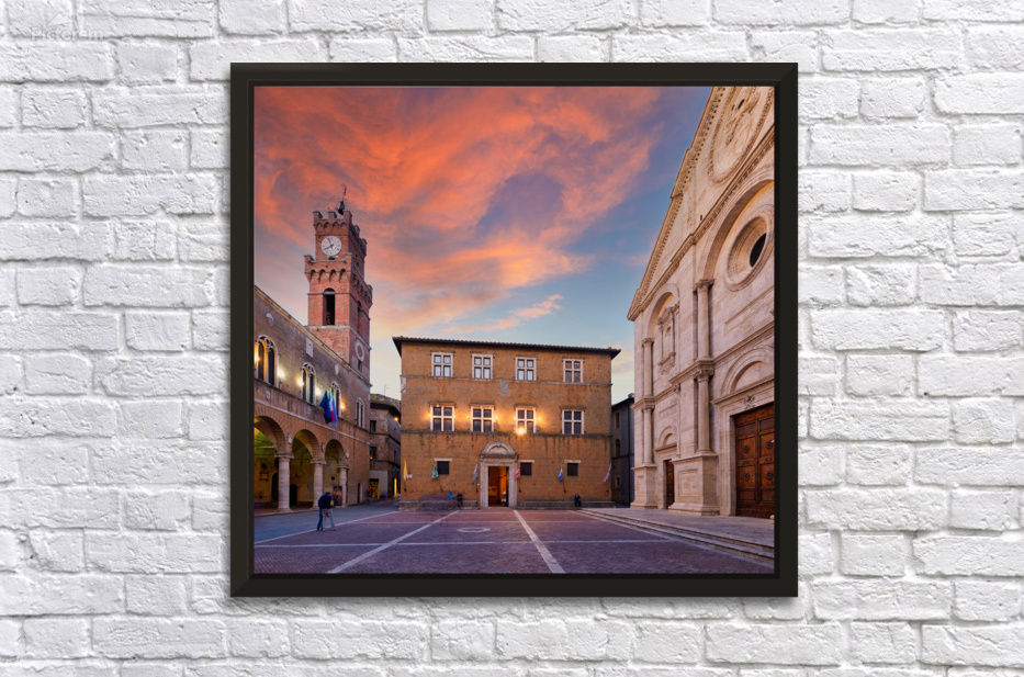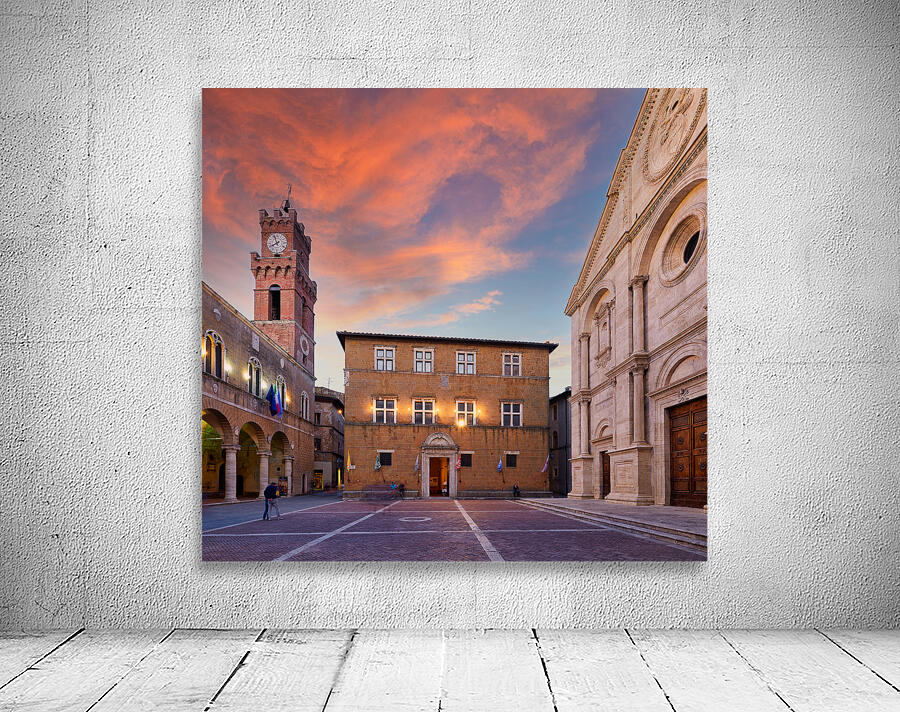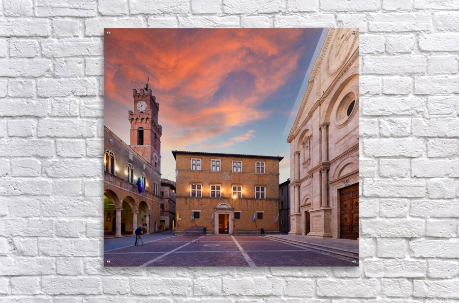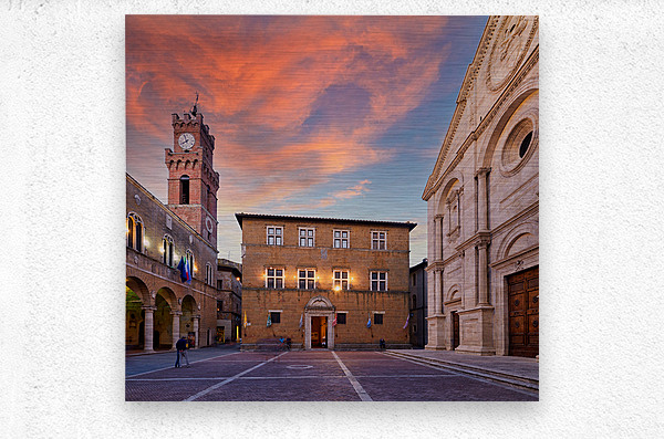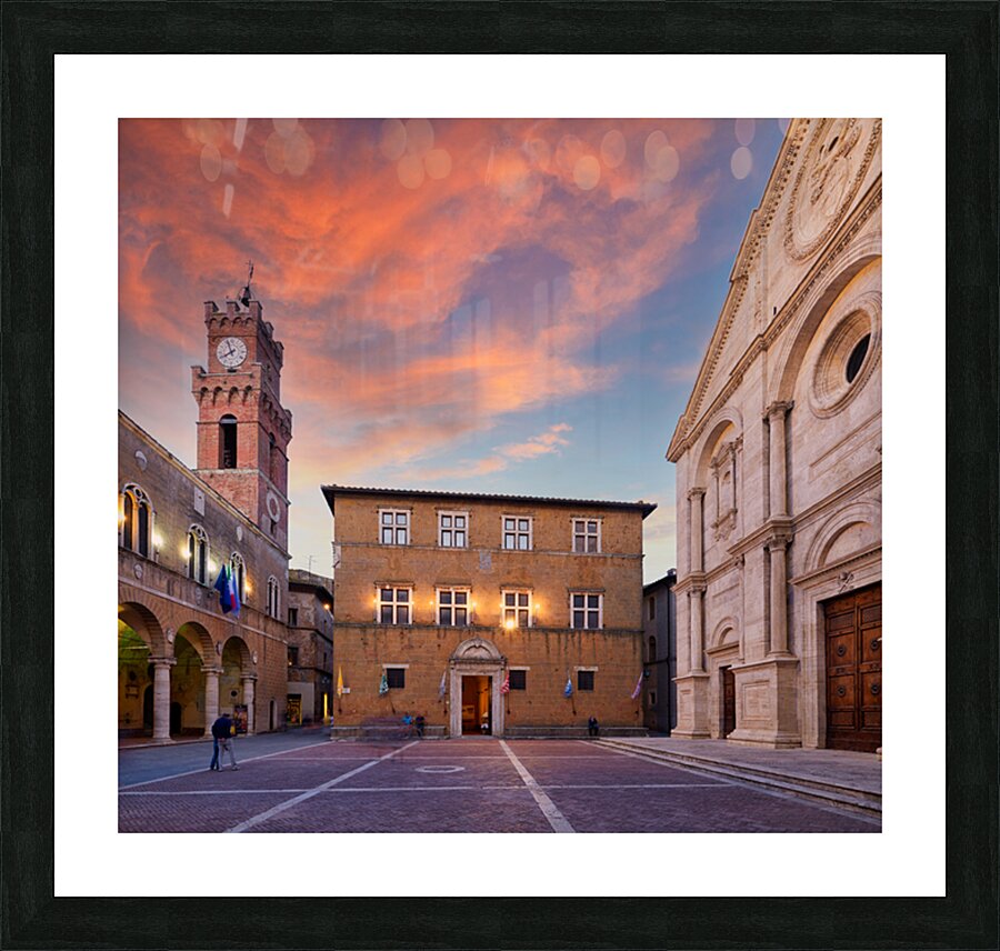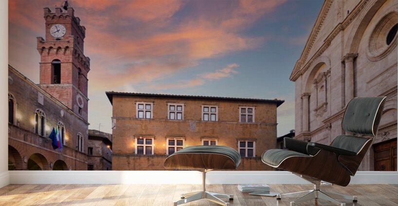Tourists explore Piazza Pio II in Pienza as the sun sets behind the town hall and the sky changes colors.