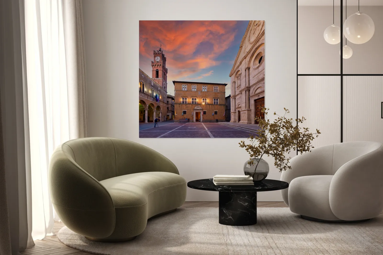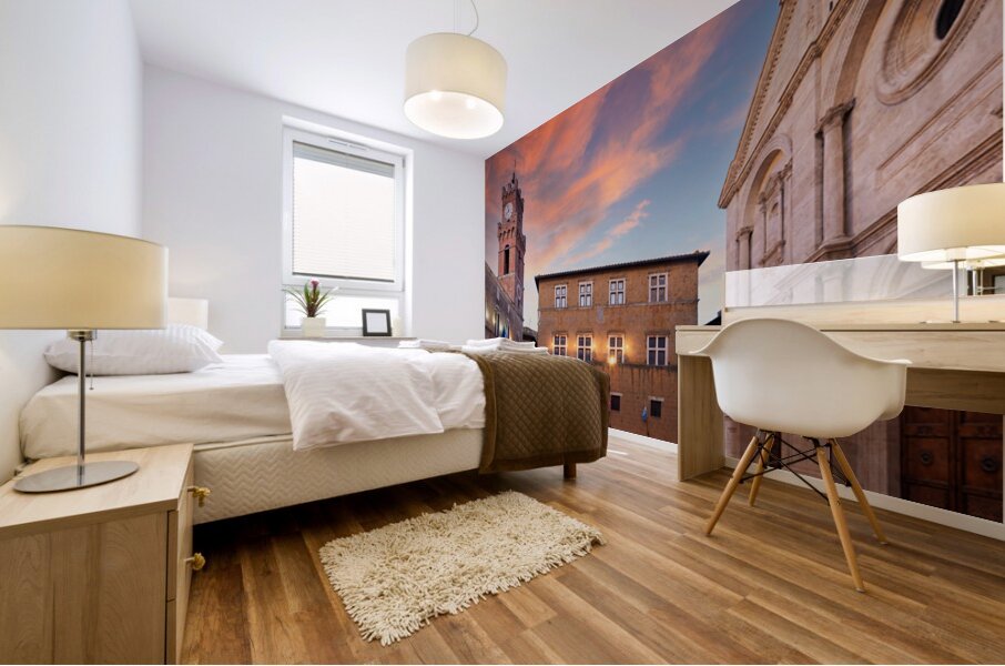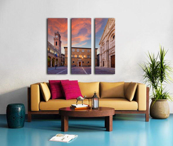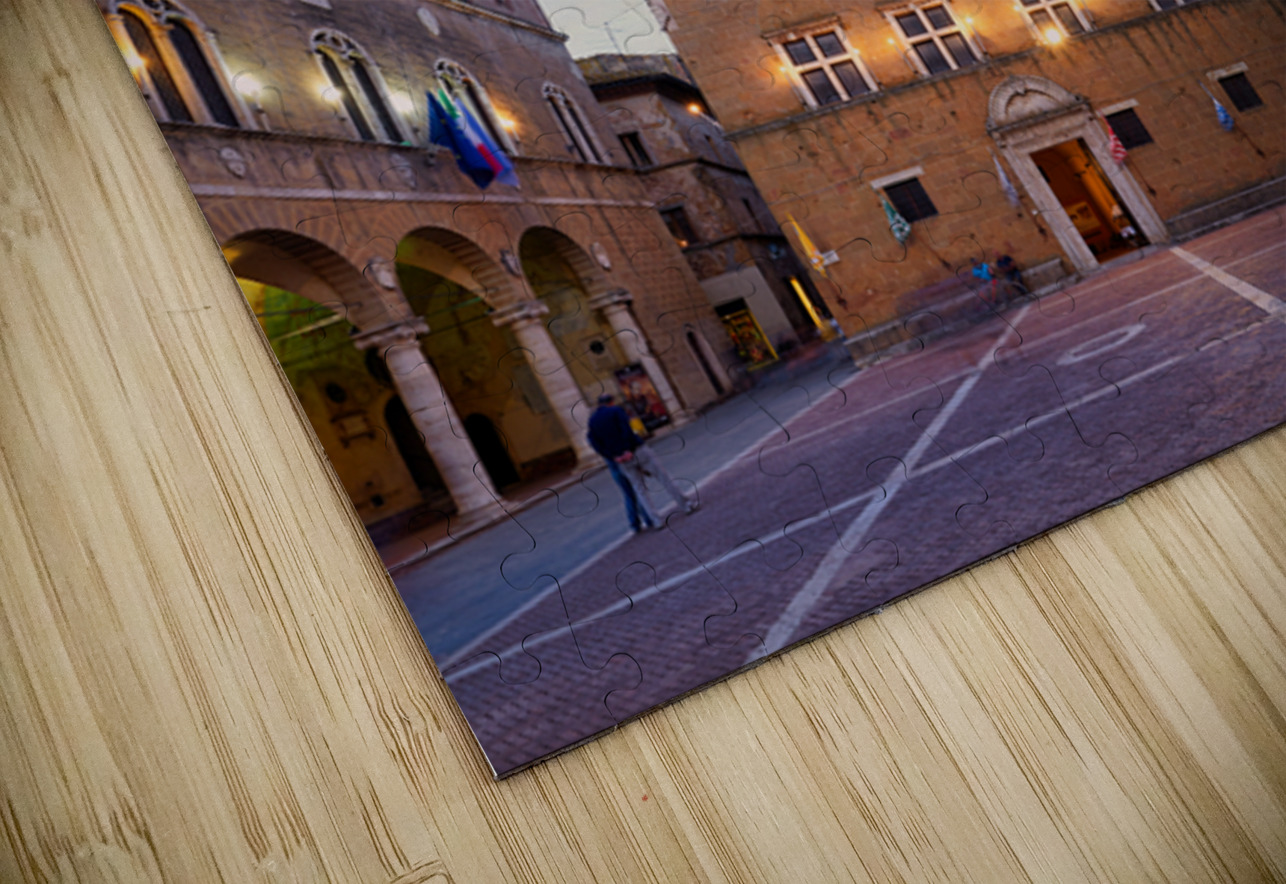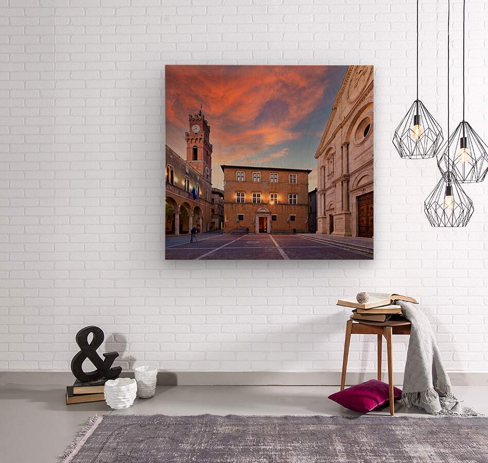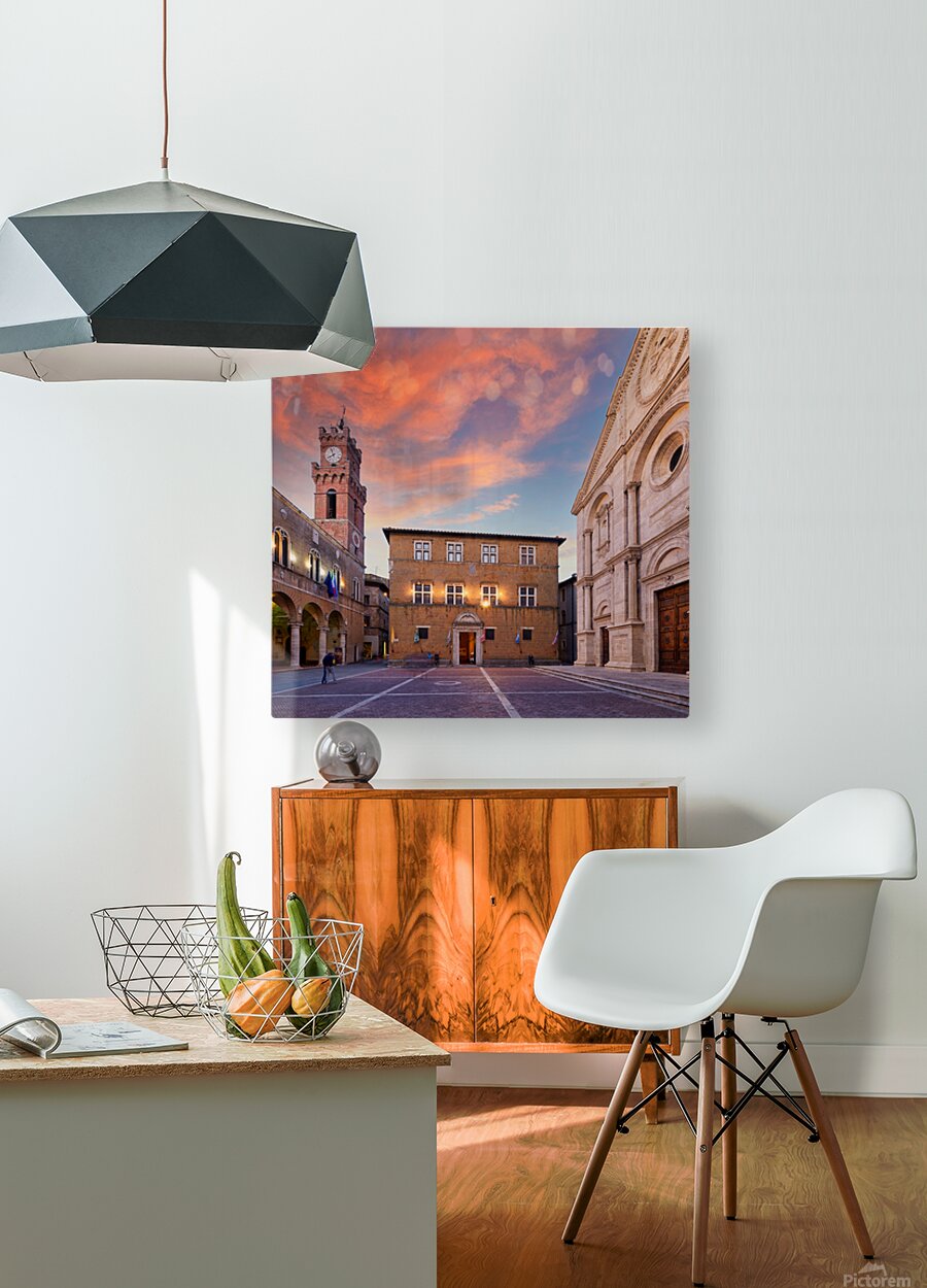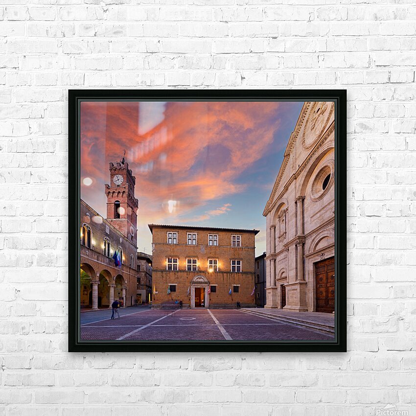 Tourists explore Piazza Pio II in Pienza as the sun sets behind the town hall and the sky changes colors.