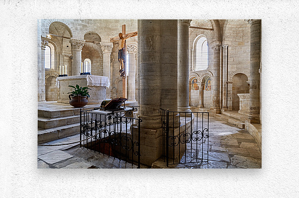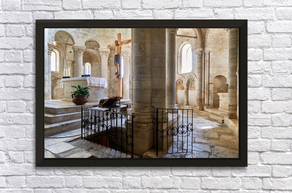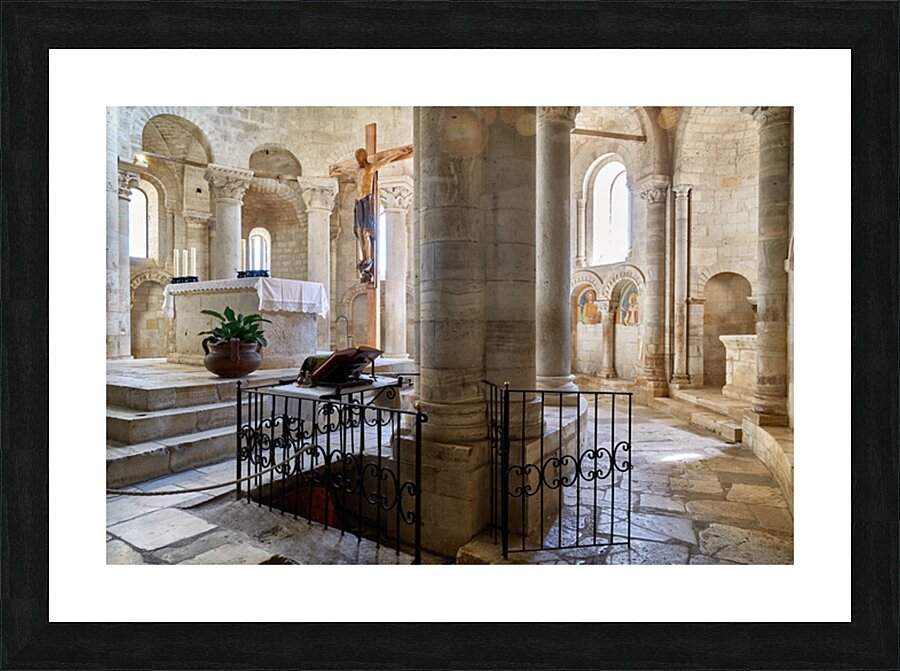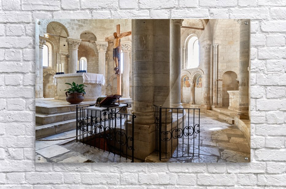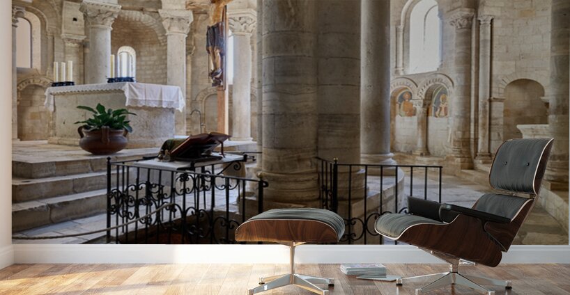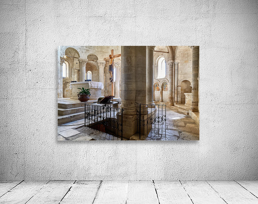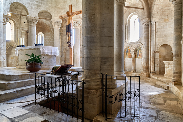 Inside the Abbey of SantAntimo a Benedictine monastery in Val dOrcia visitors explore the stone architecture and religious symbols.
