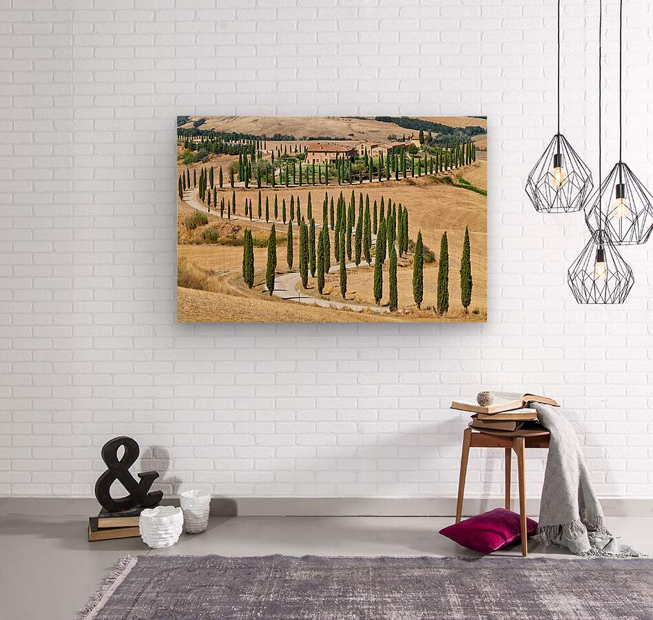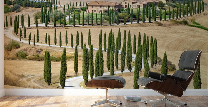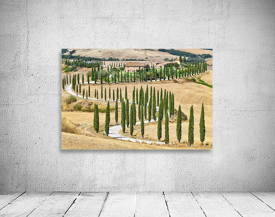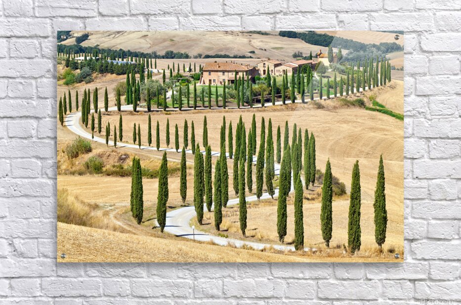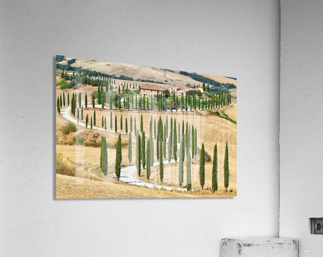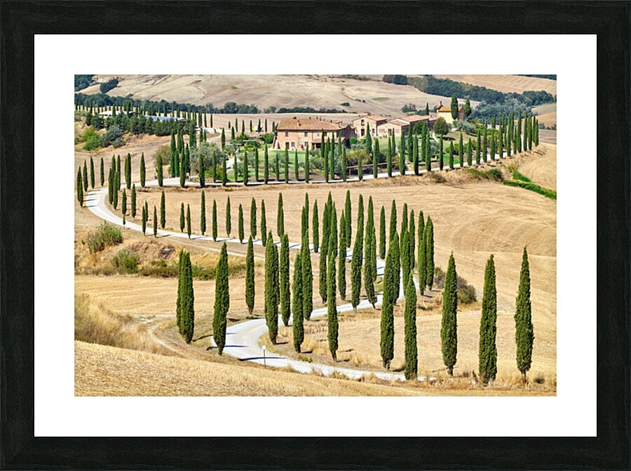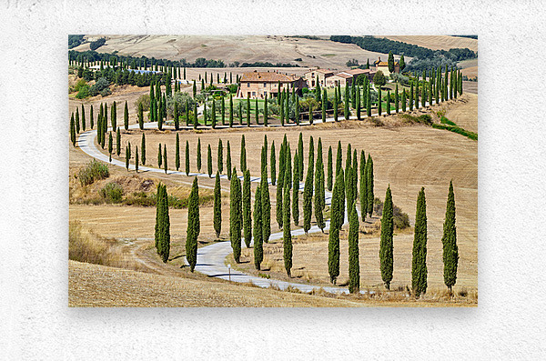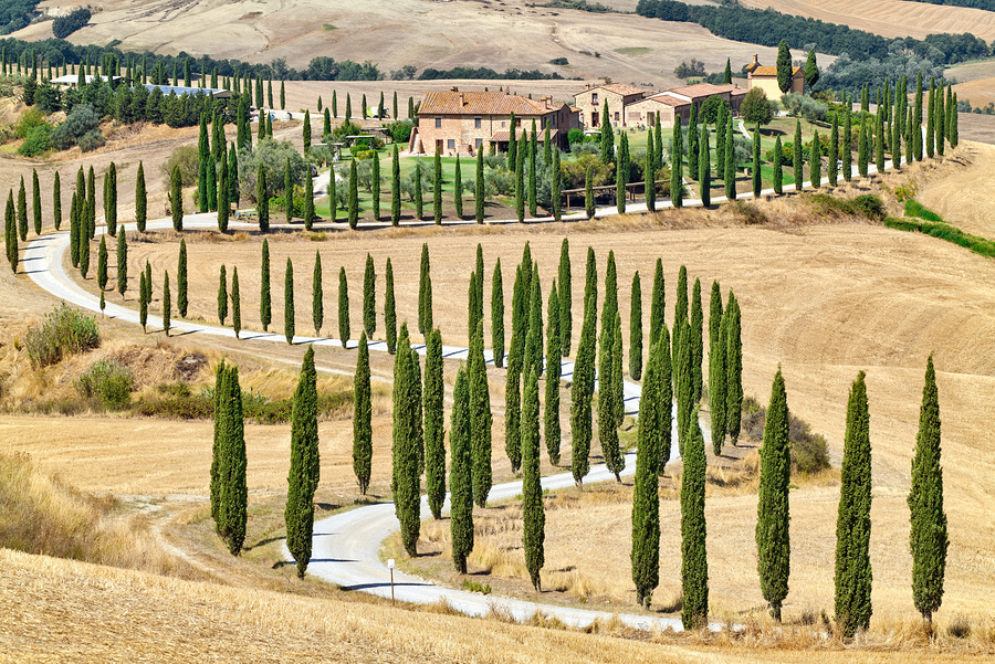 A winding road surrounded by tall cypress trees leads to a farmhouse in Val dOrcia Tuscany. The landscape shows golden fields and hills.