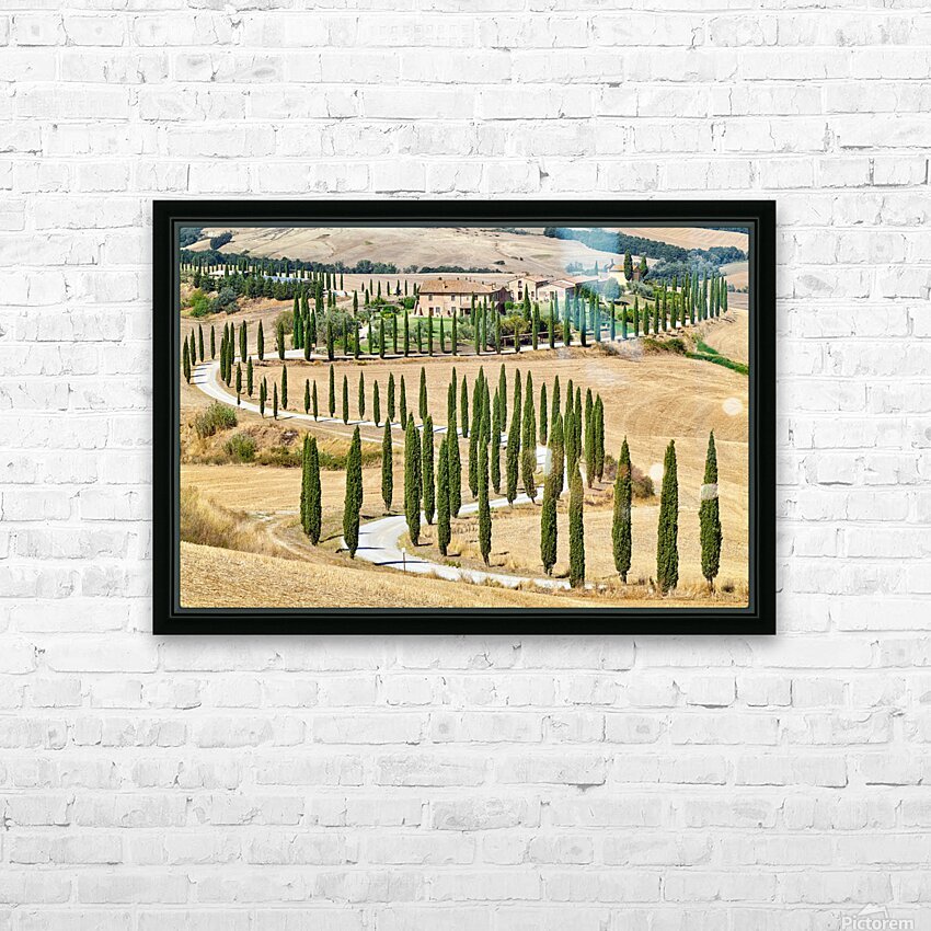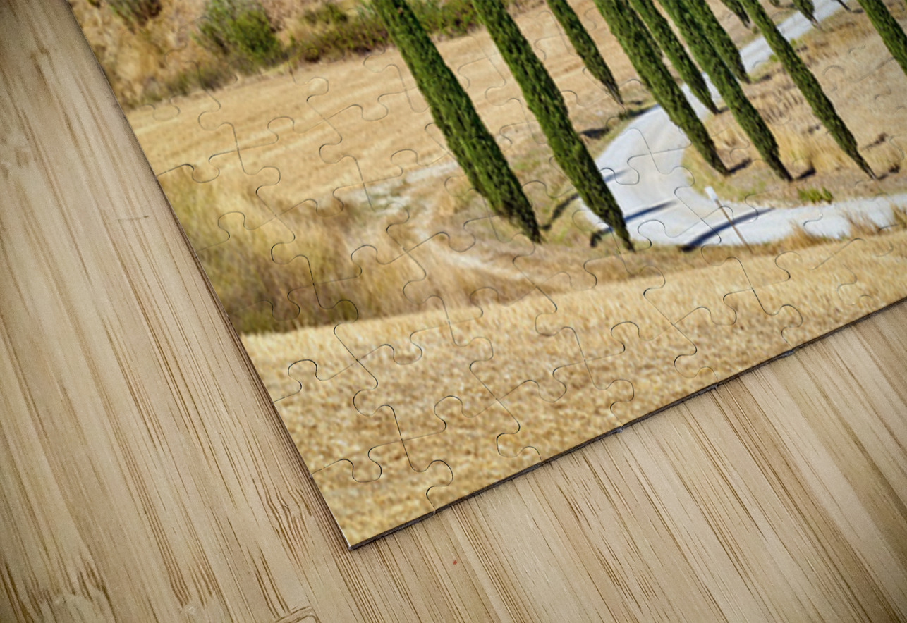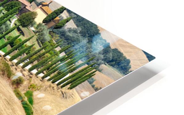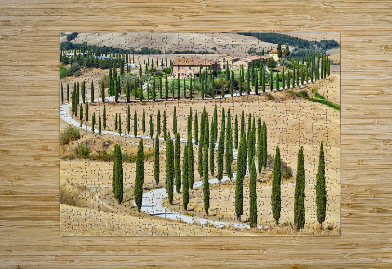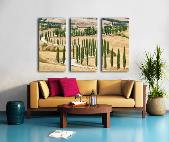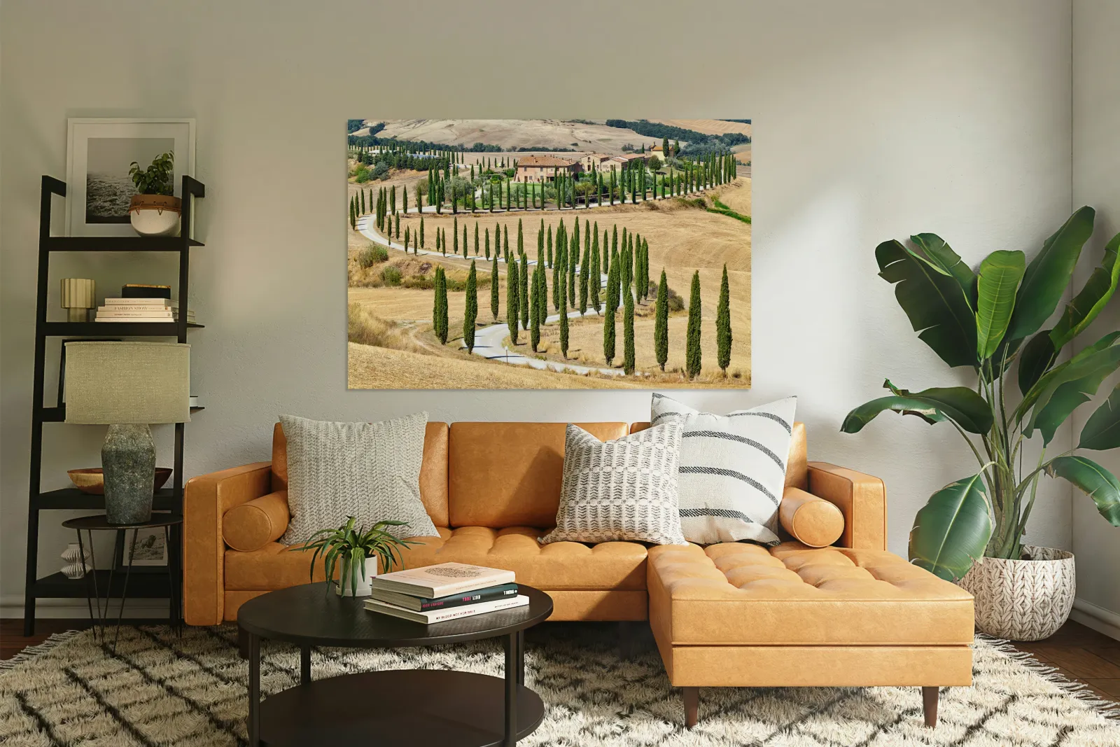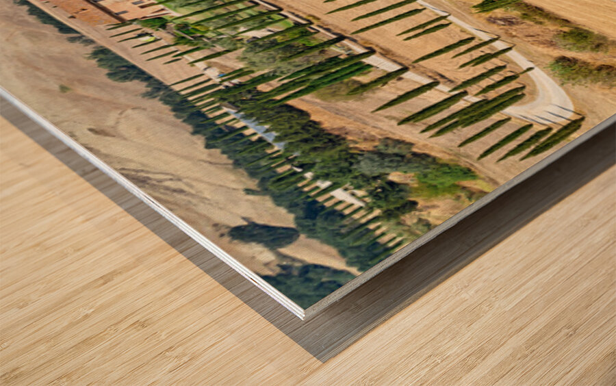 A winding road surrounded by tall cypress trees leads to a farmhouse in Val dOrcia Tuscany. The landscape shows golden fields and hills.