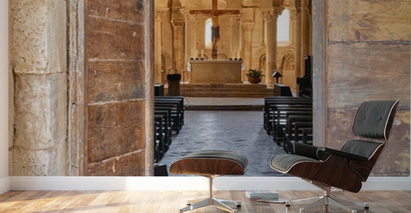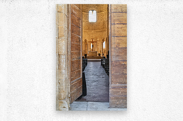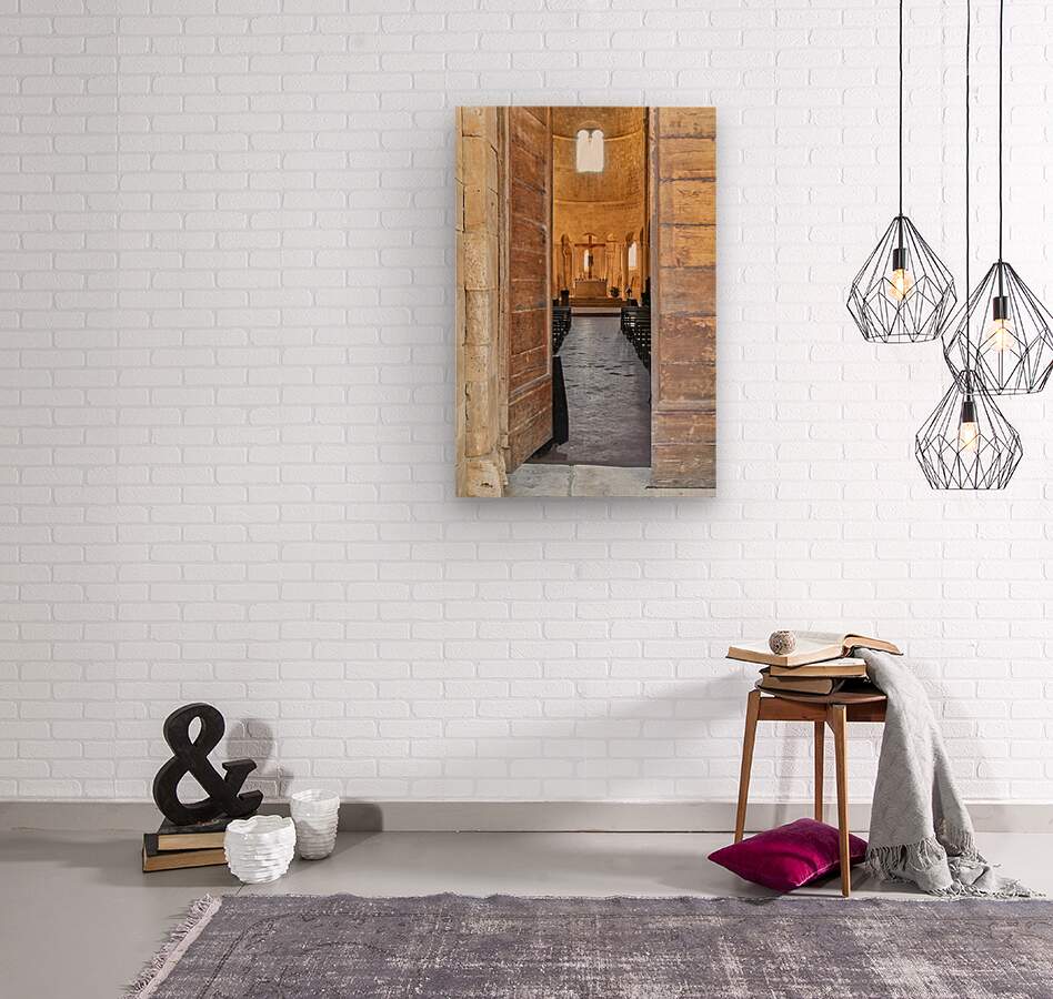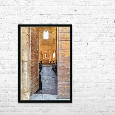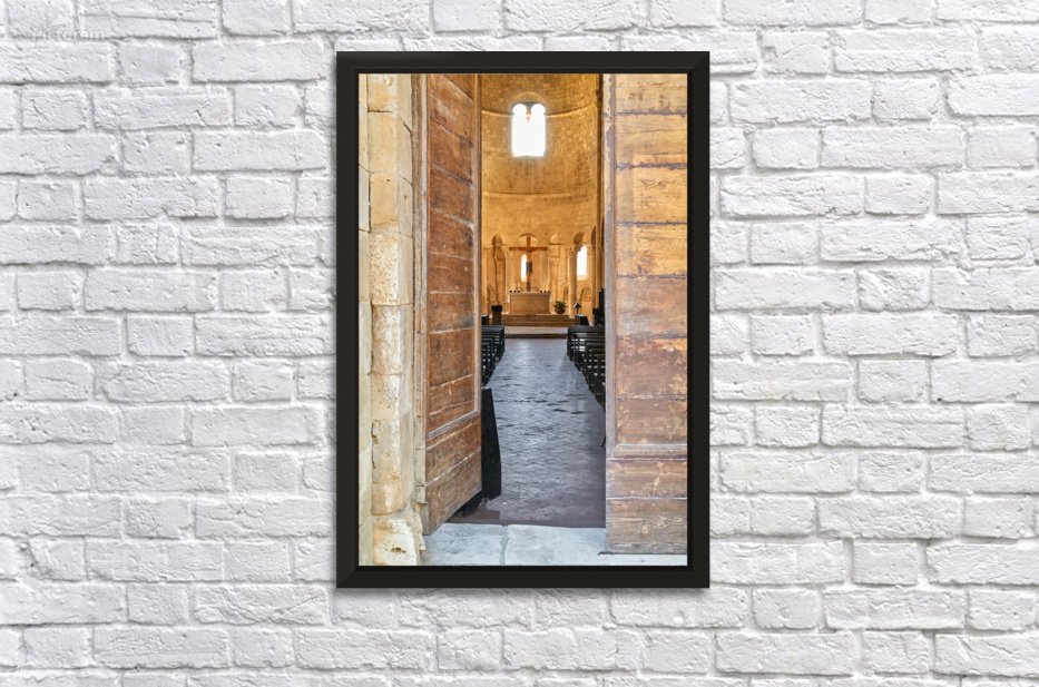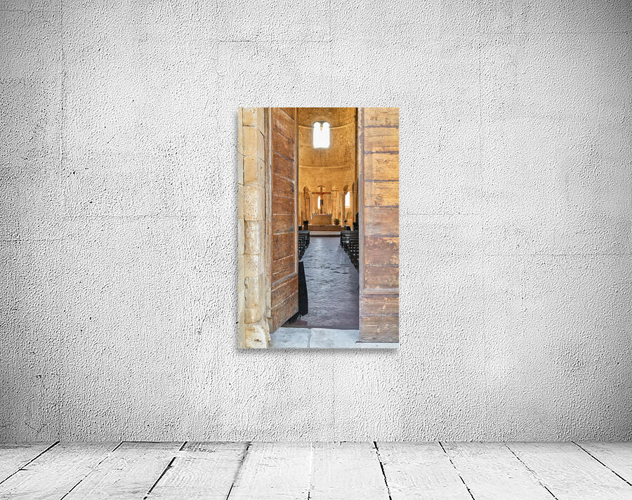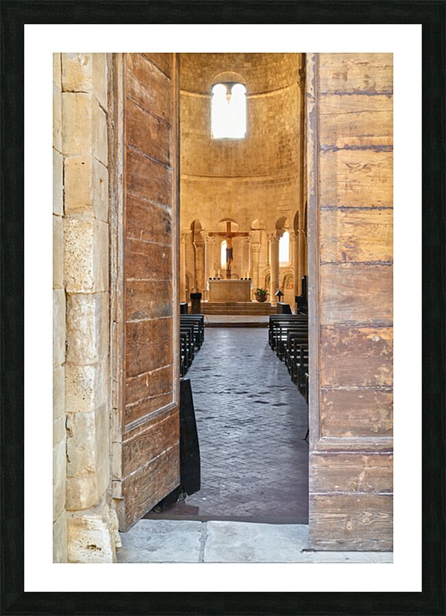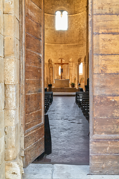 Wooden doors lead to the interior of Abbey of SantAntimo in Val dOrcia. The altar is visible in the distance.