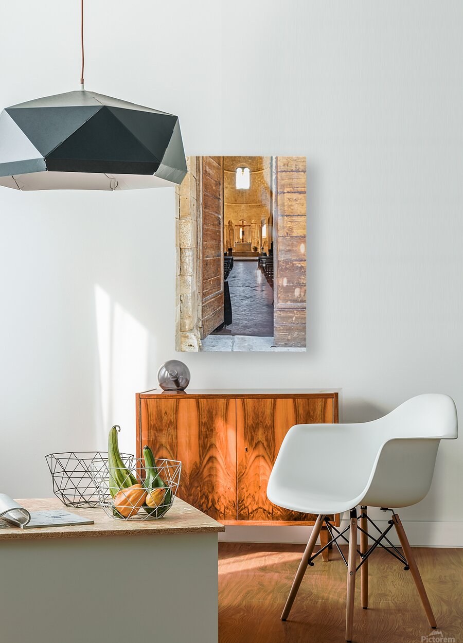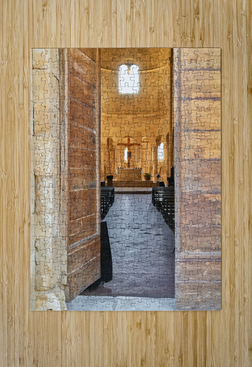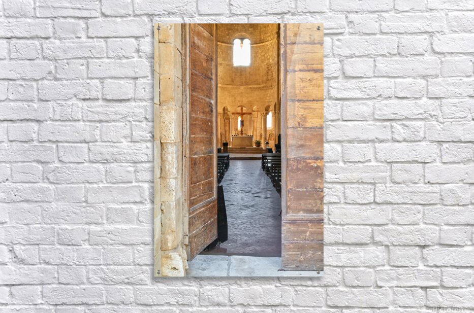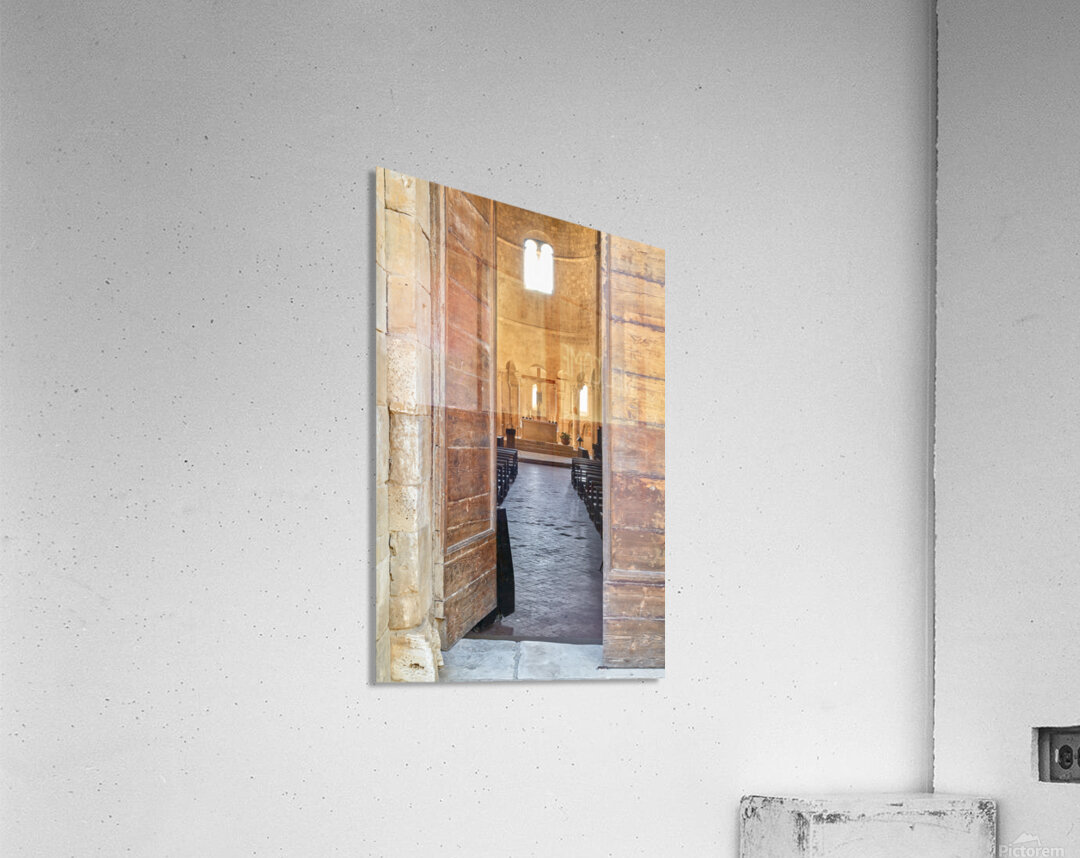 Wooden doors lead to the interior of Abbey of SantAntimo in Val dOrcia. The altar is visible in the distance.