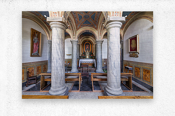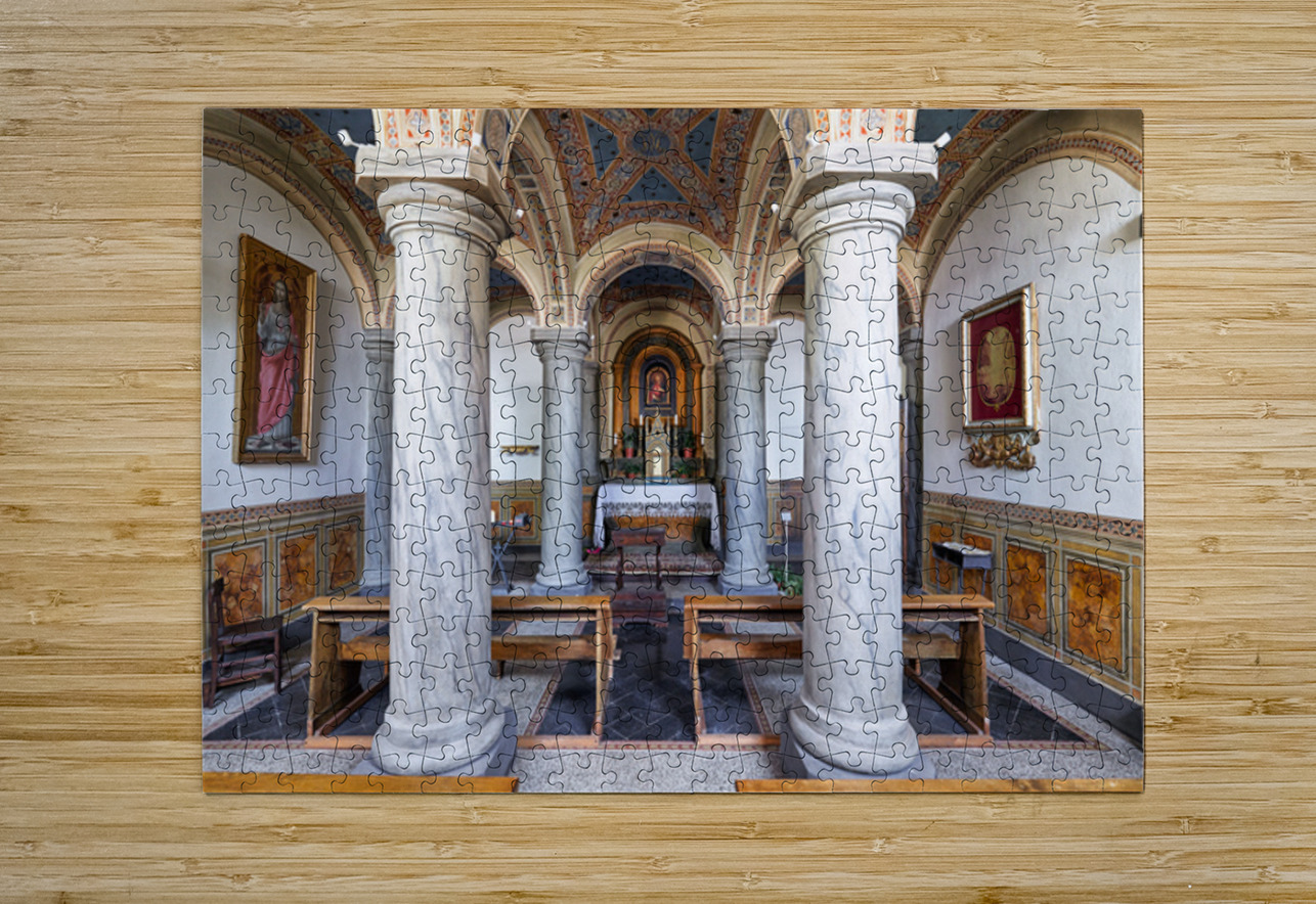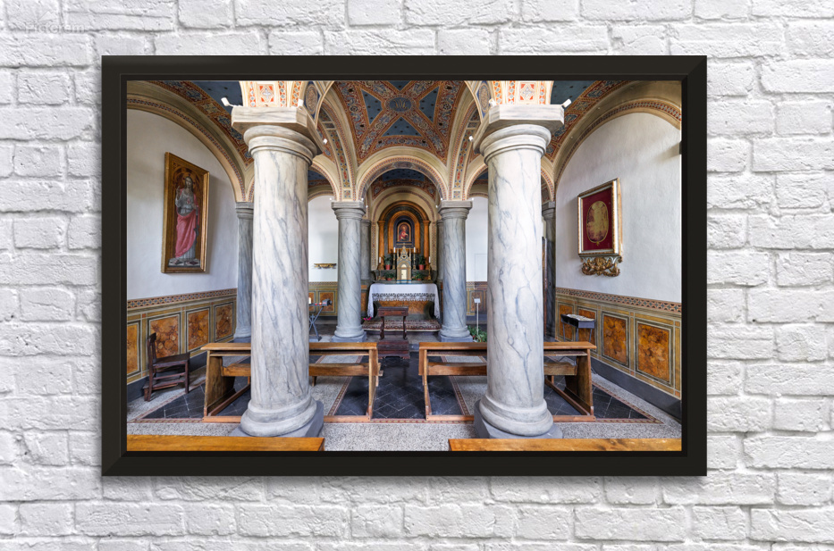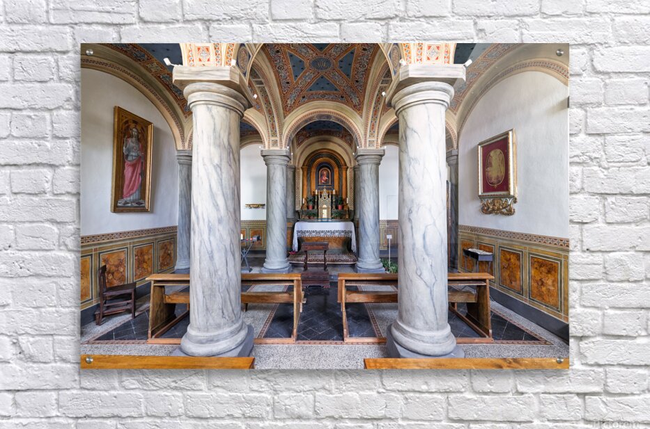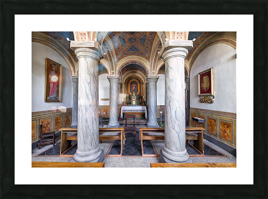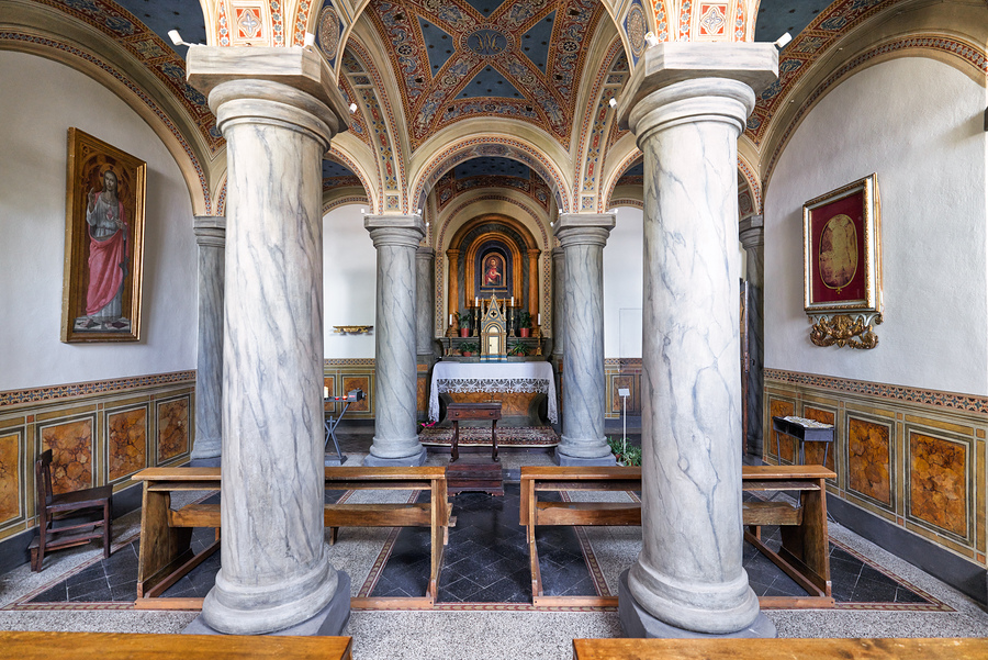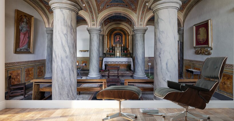 People explore the interior of San Francesco Church in Pienza Val dOrcia Tuscany. The chapel features marble columns and artwork.