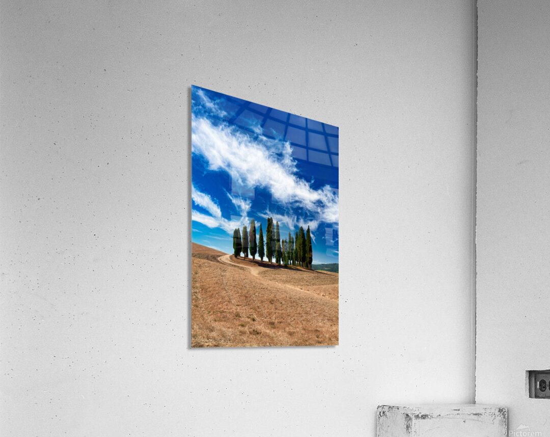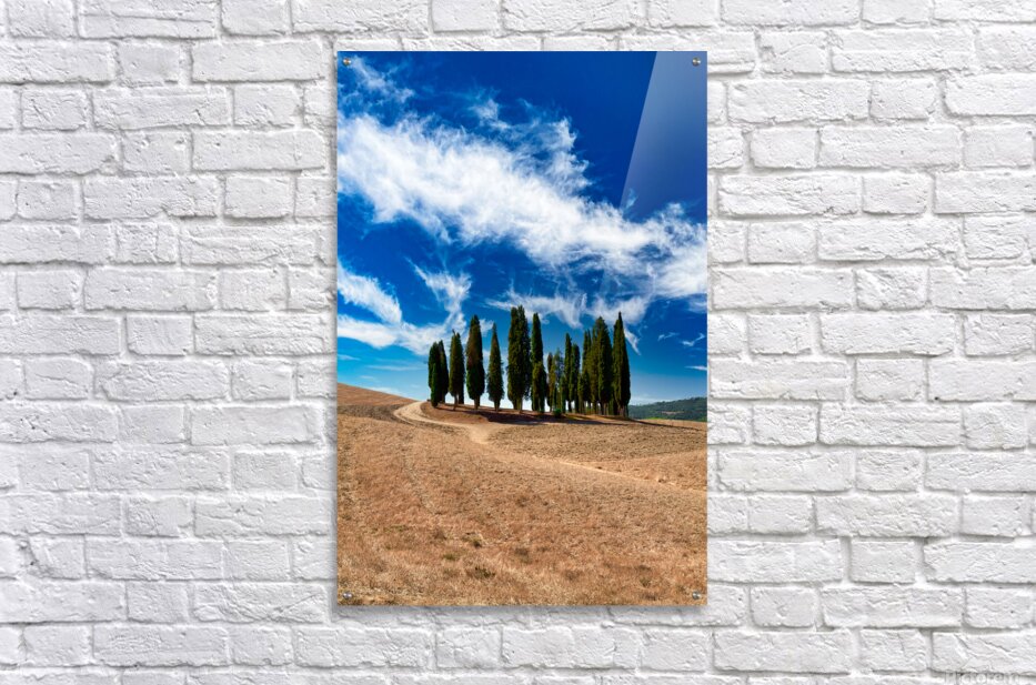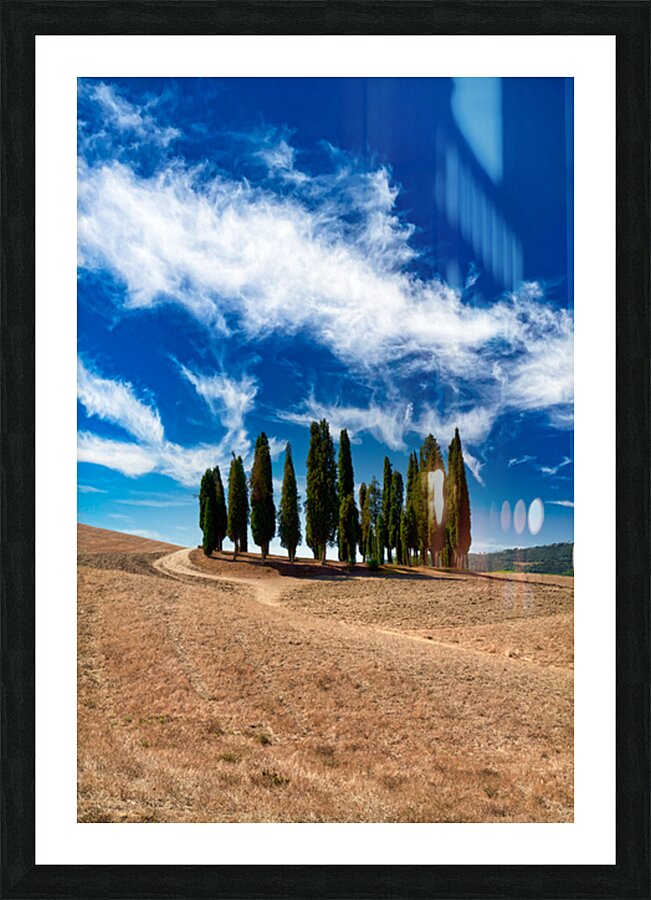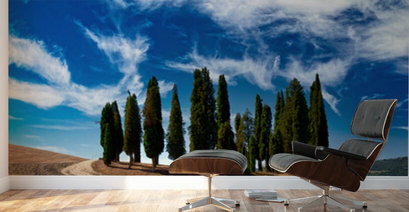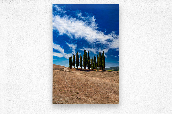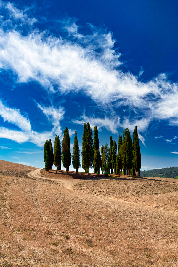Cypress trees grow along a dirt road in San Quirico dOrcia Tuscany. The landscape shows blue sky and rolling hills in the background.