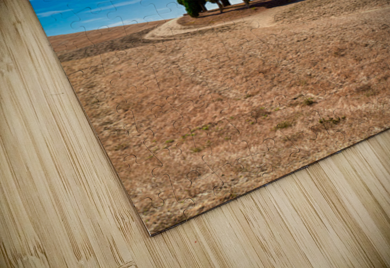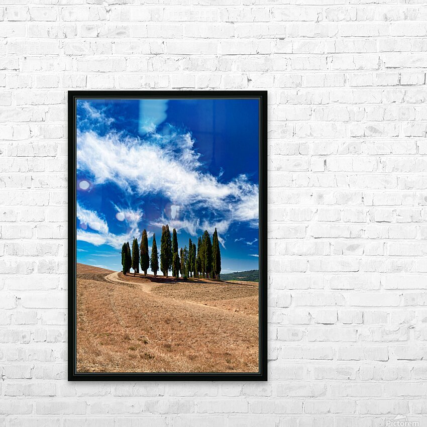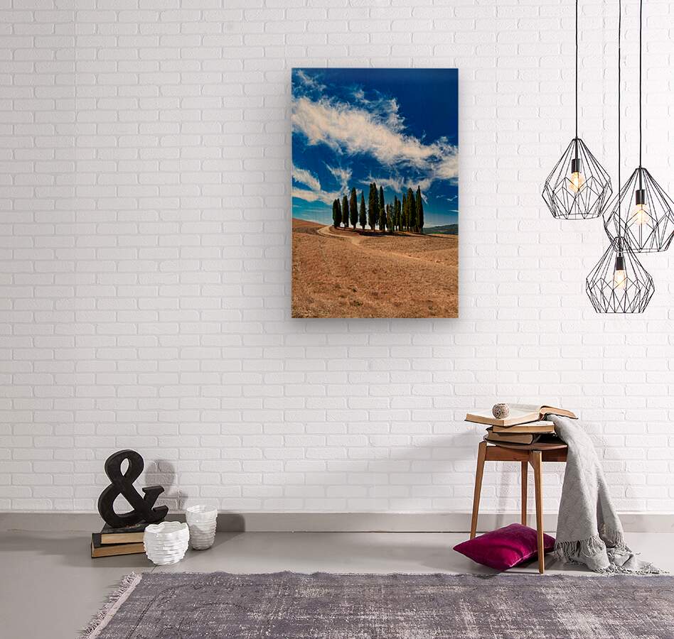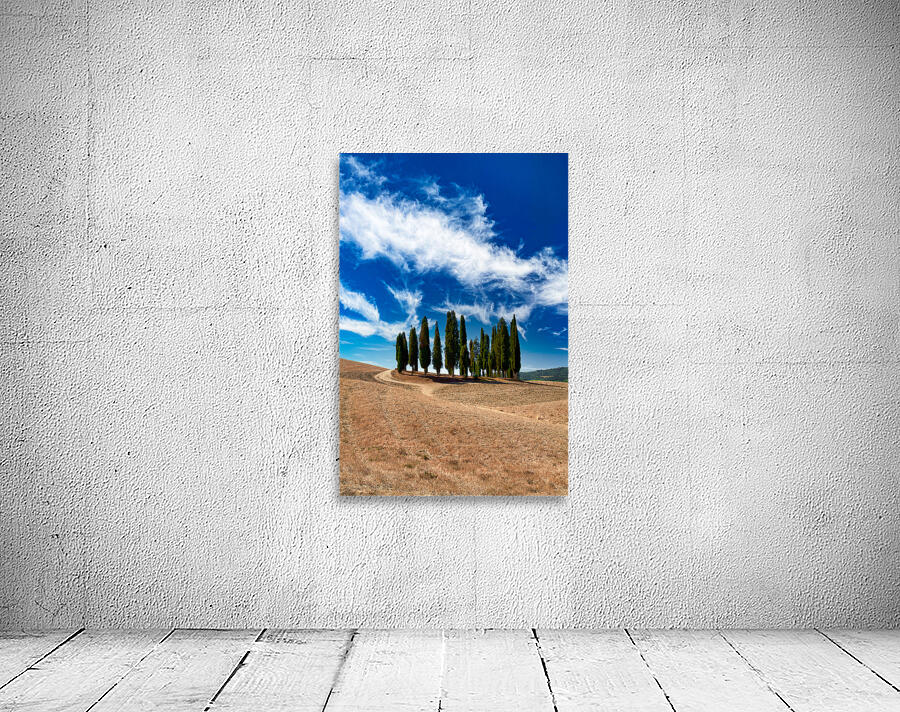 Cypress trees grow along a dirt road in San Quirico dOrcia Tuscany. The landscape shows blue sky and rolling hills in the background.