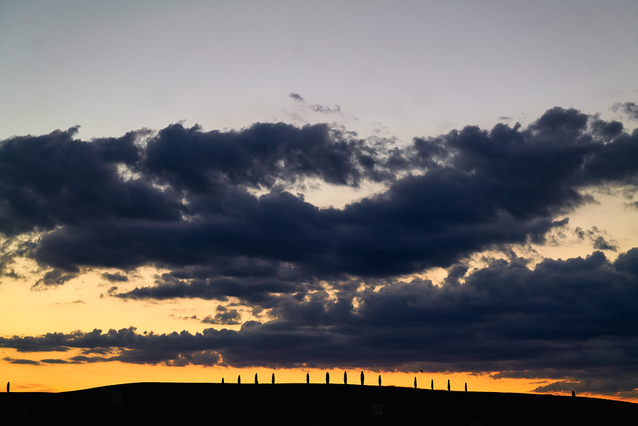 Sunset lights up the sky over Val dOrcia in Tuscany. Cypresses stand silhouetted against colorful clouds and the horizon.