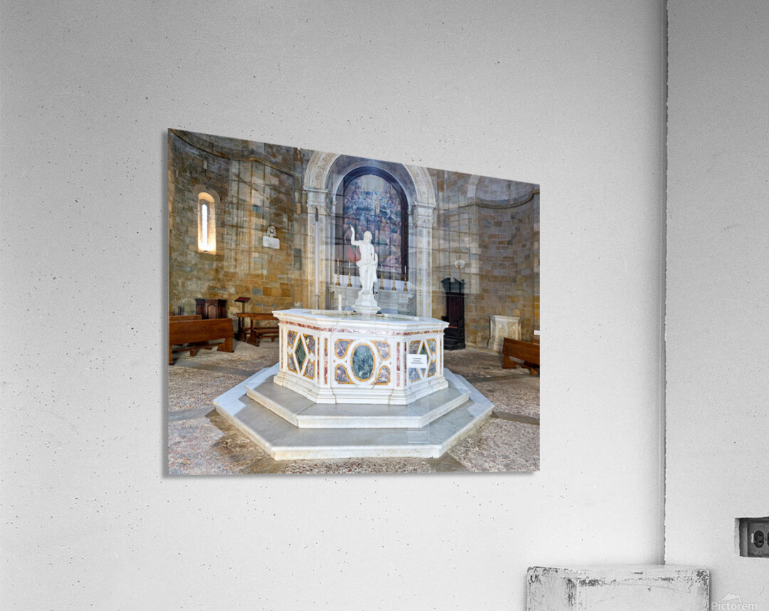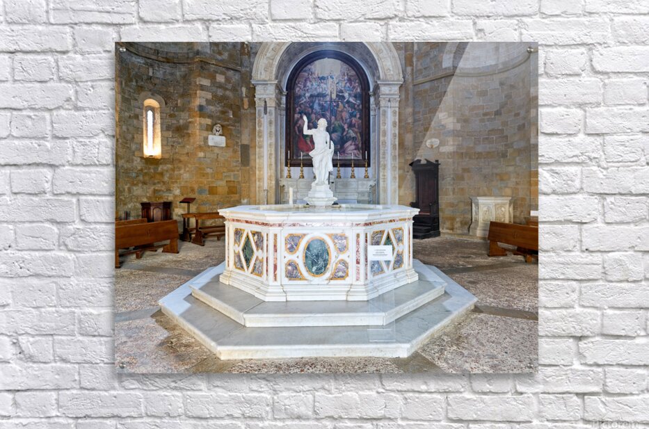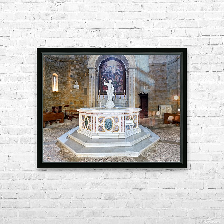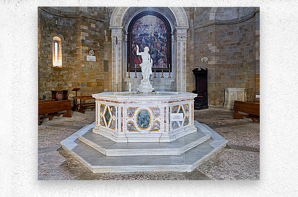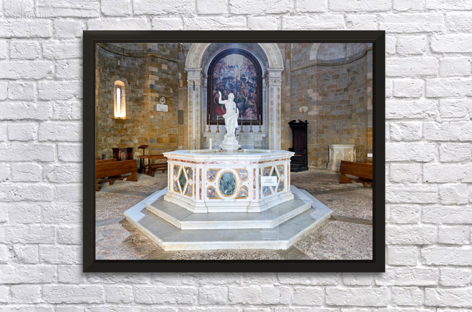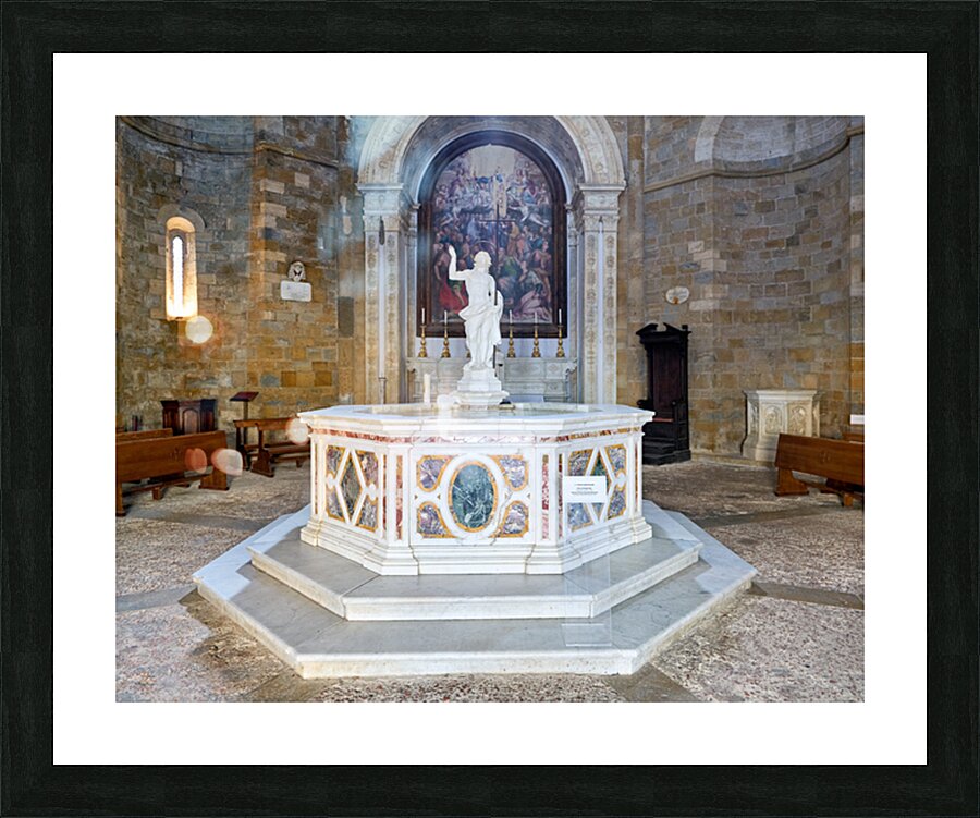 "Exploring the baptistery of san giovanni in volterra tuscany" in a framed print.