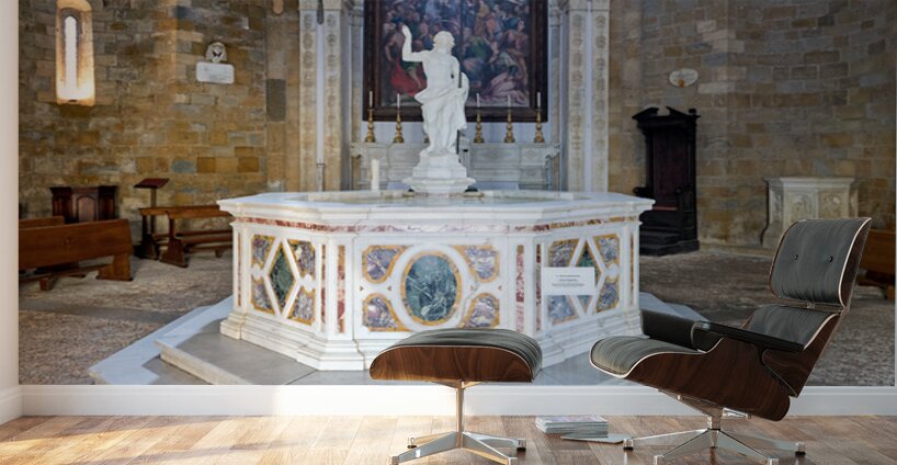 Visitors view the Baptistery of San Giovanni in Volterra Tuscany. Marble and artworks fill the space creating an atmosphere of history.