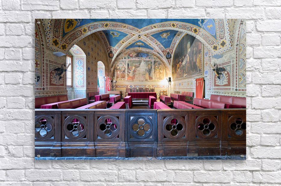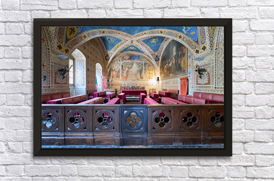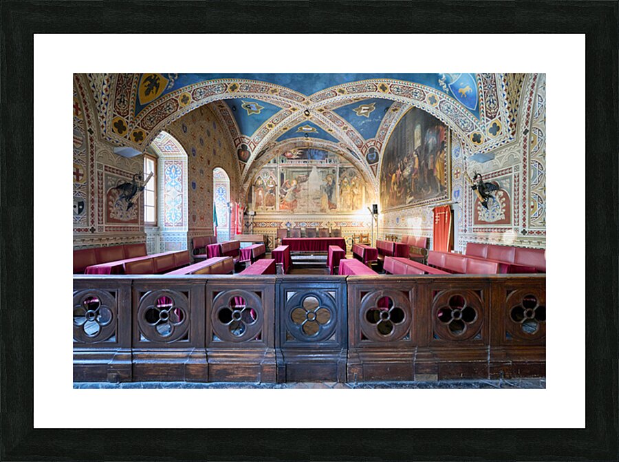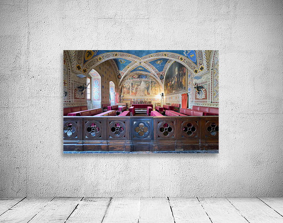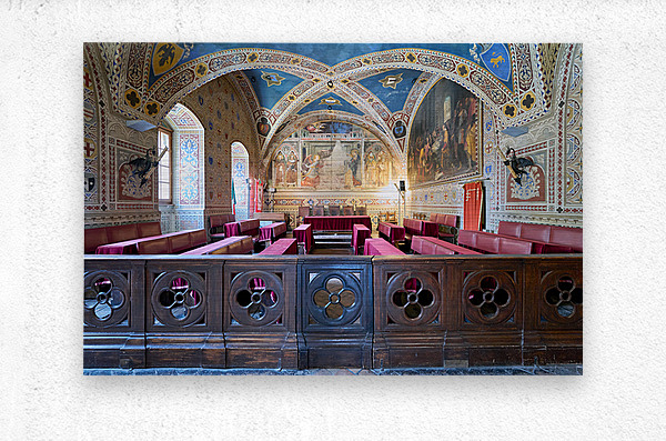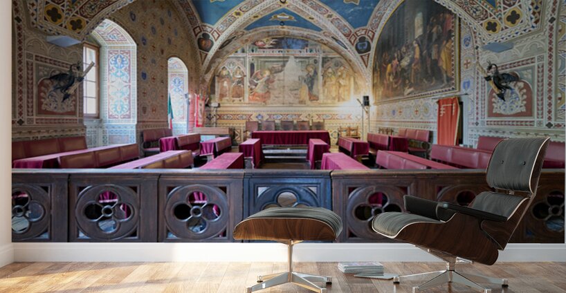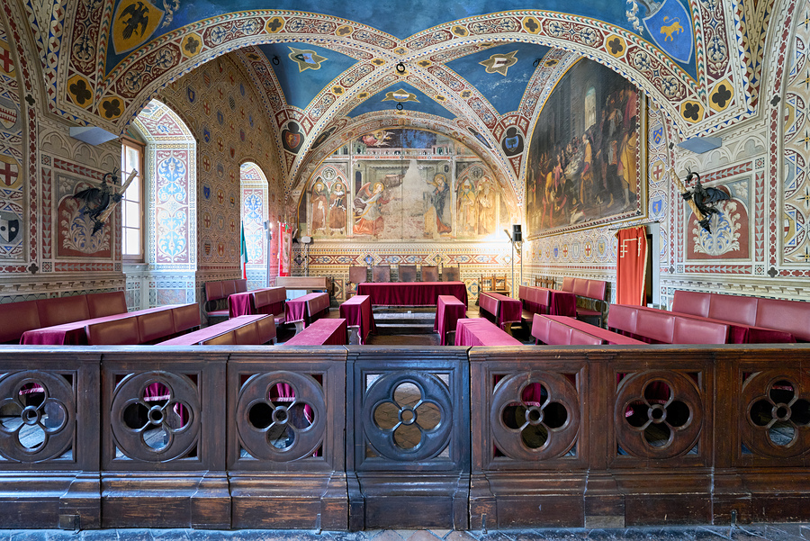 People can explore the frescoed Sala del Consiglio in Palazzo dei Priori a historic town hall in Volterra Tuscany Italy.