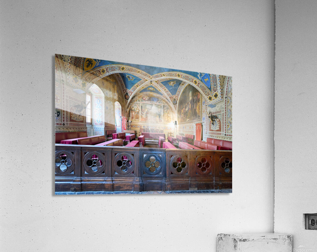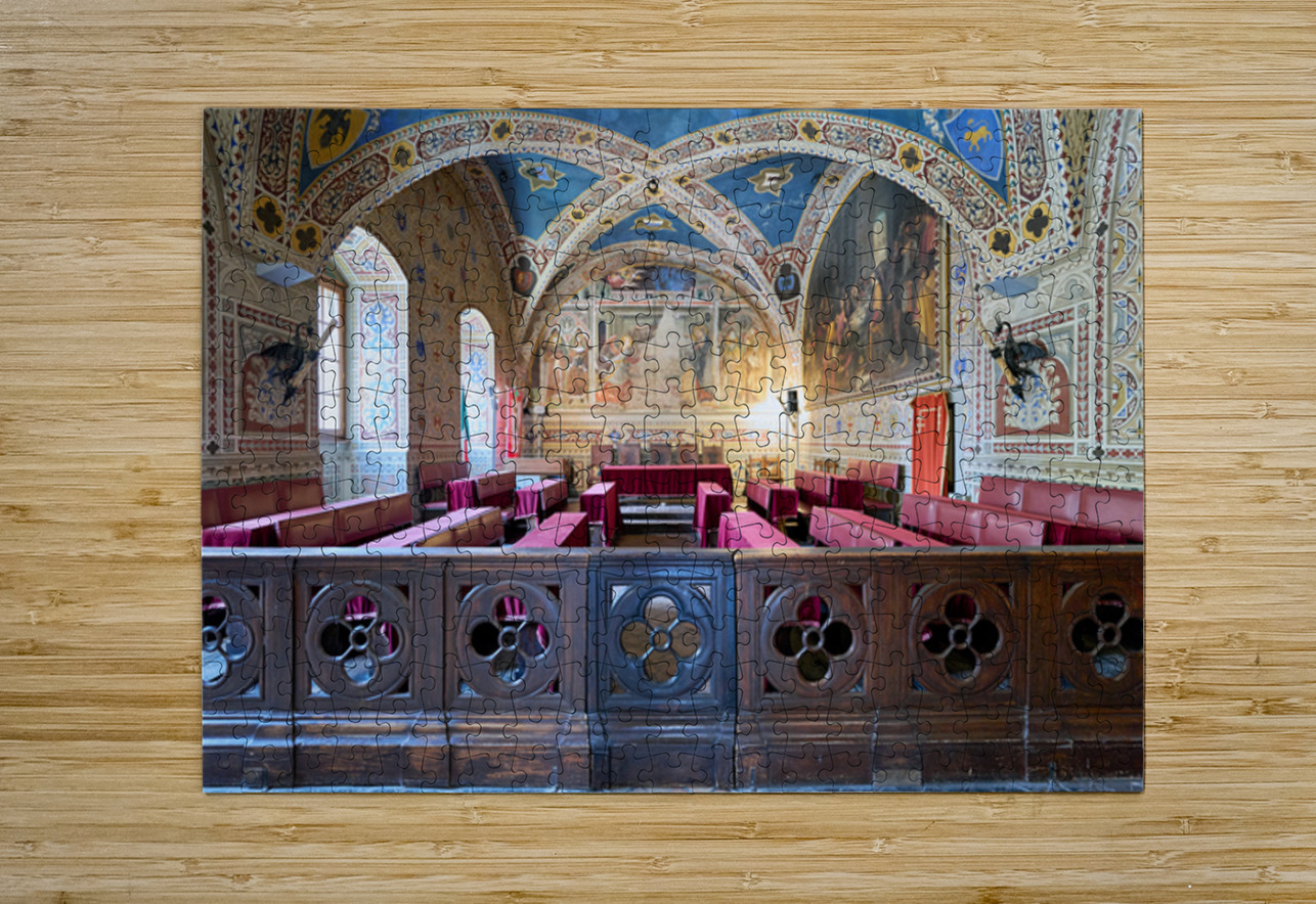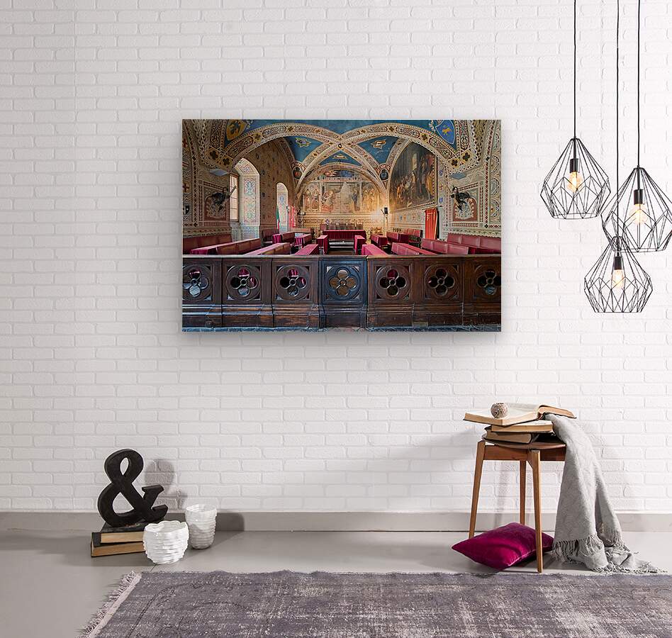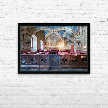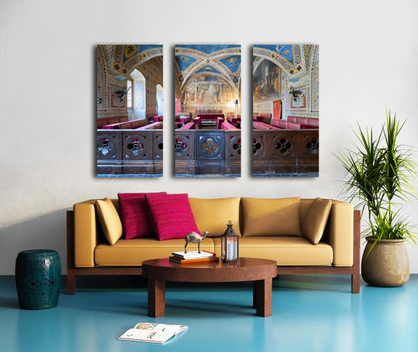 People can explore the frescoed Sala del Consiglio in Palazzo dei Priori a historic town hall in Volterra Tuscany Italy.