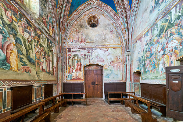 Visitors look at colorful frescos in the Chapel of the Daily Cross in the Church of San Francesco during a sunny day in Tuscany.