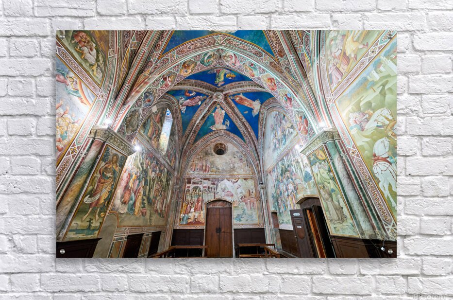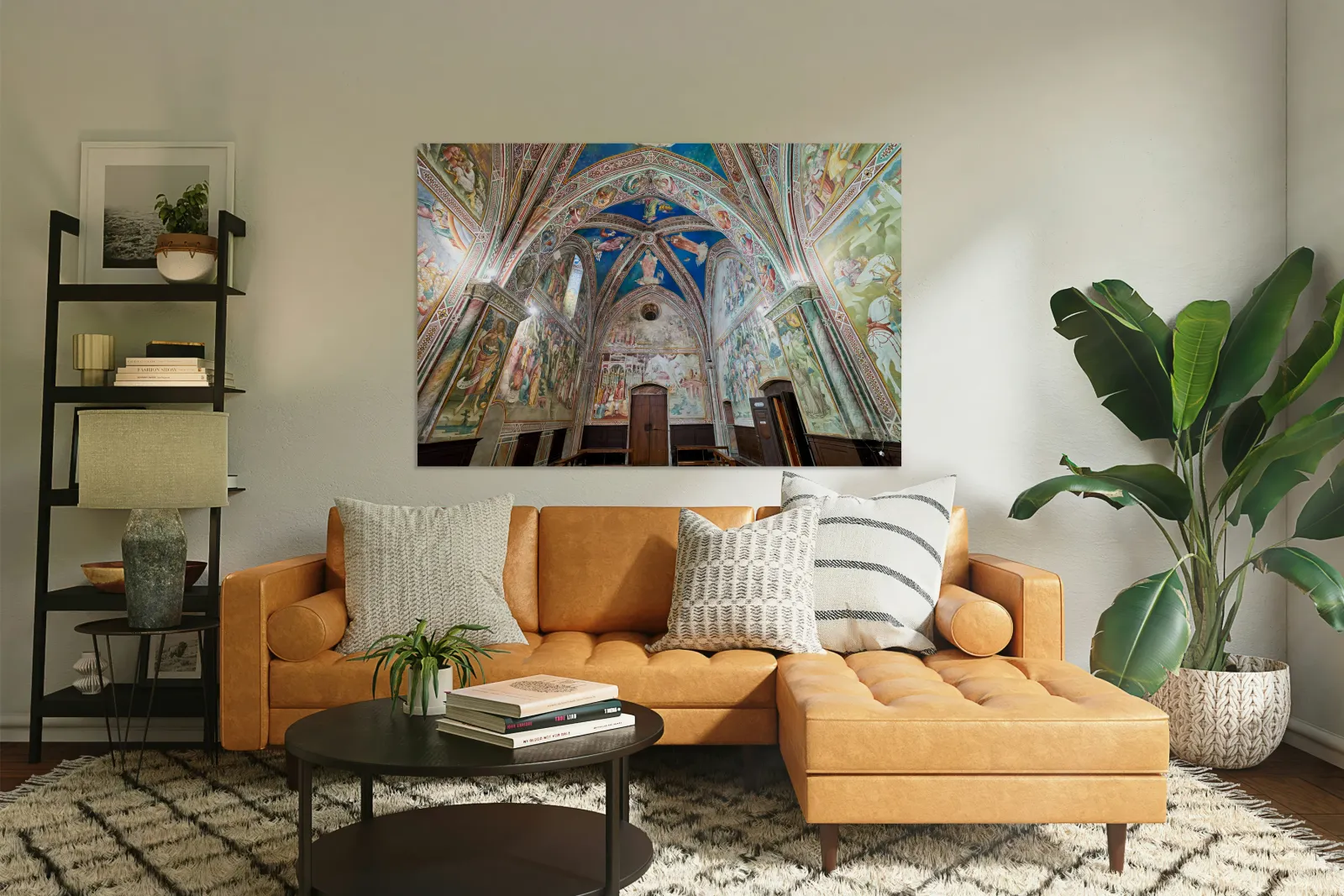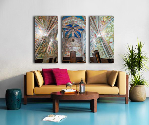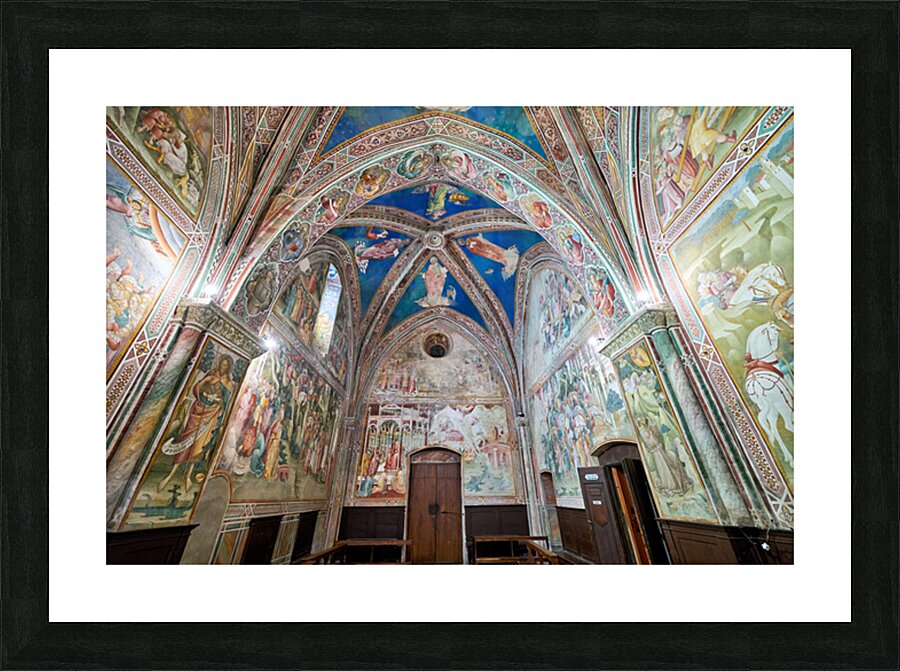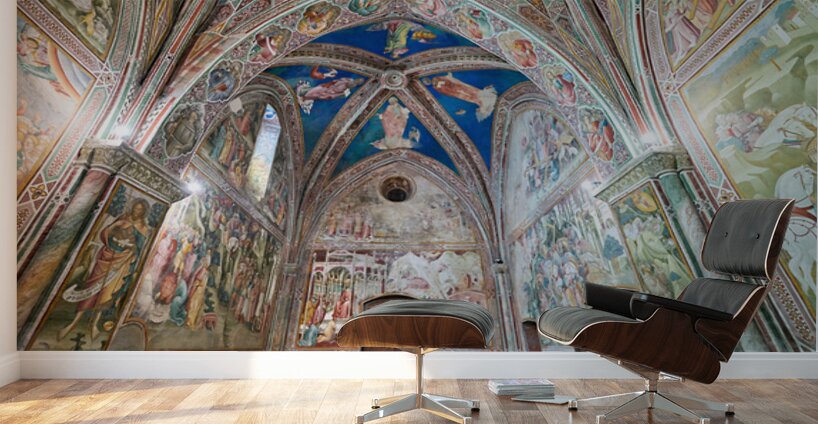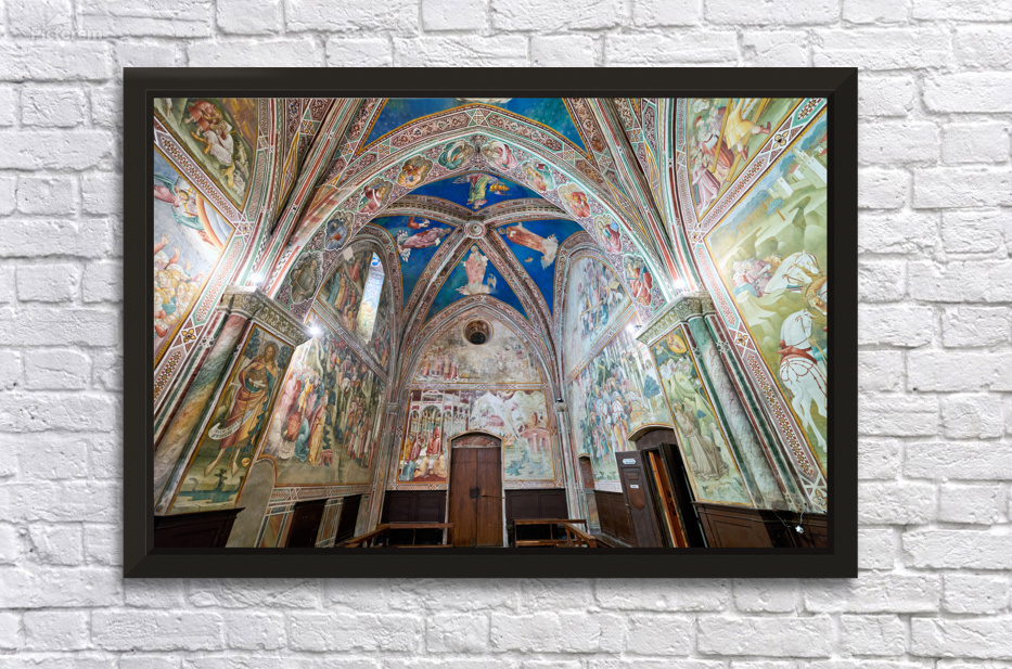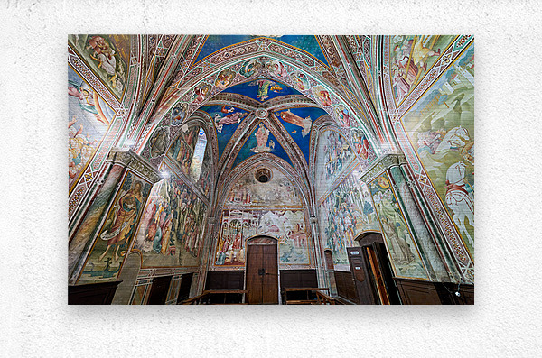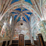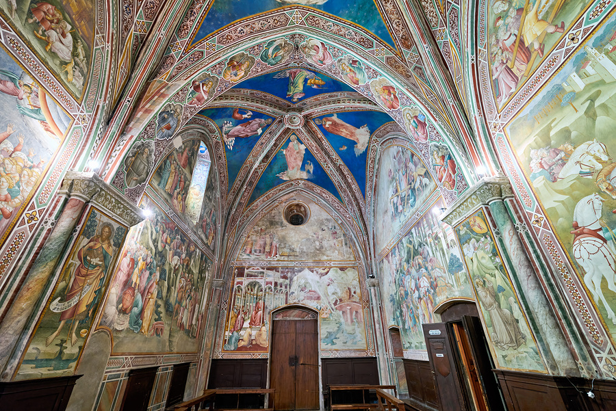 The Chapel of the Daily Cross shows detailed frescos on the walls and ceiling. Visitors can appreciate the artistry and history in Volterra Italy.