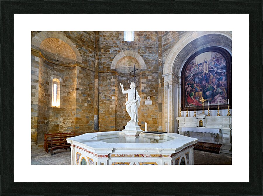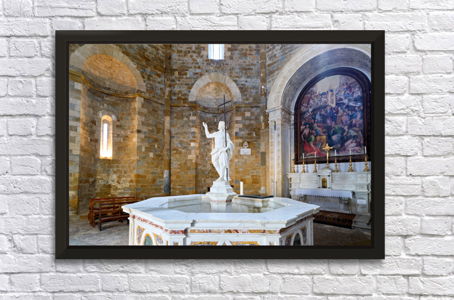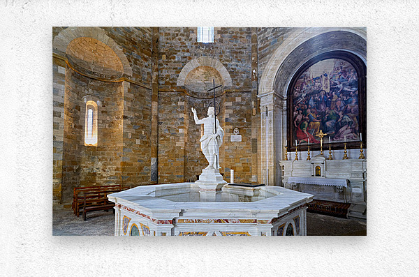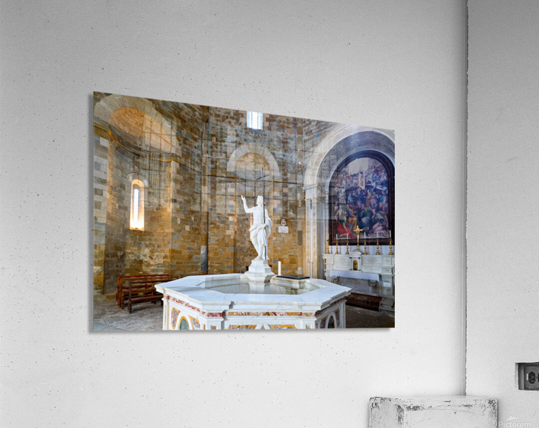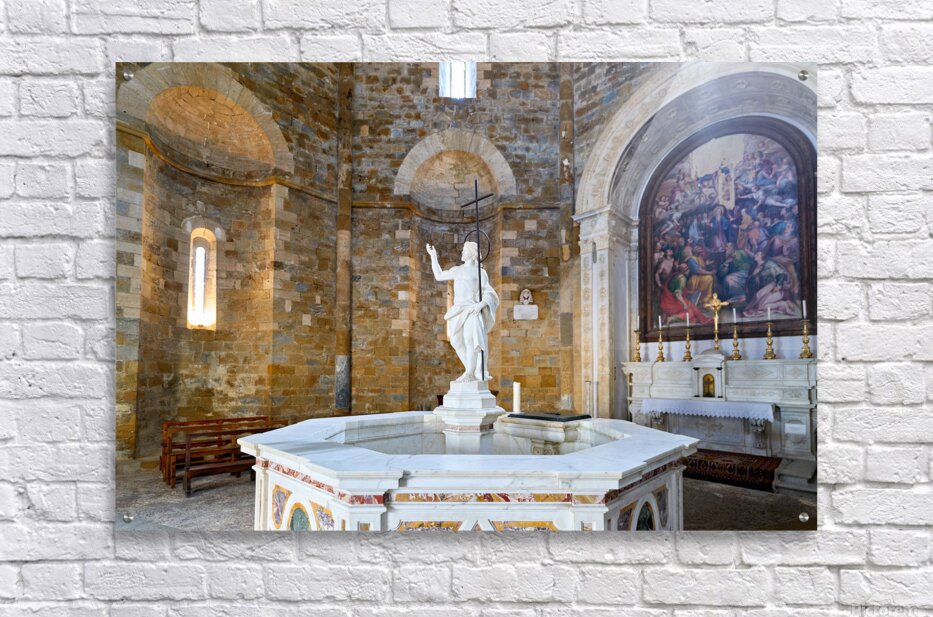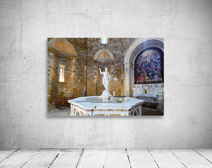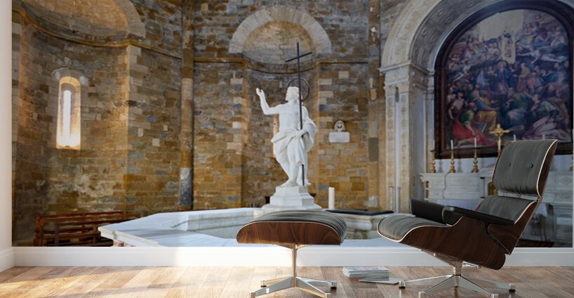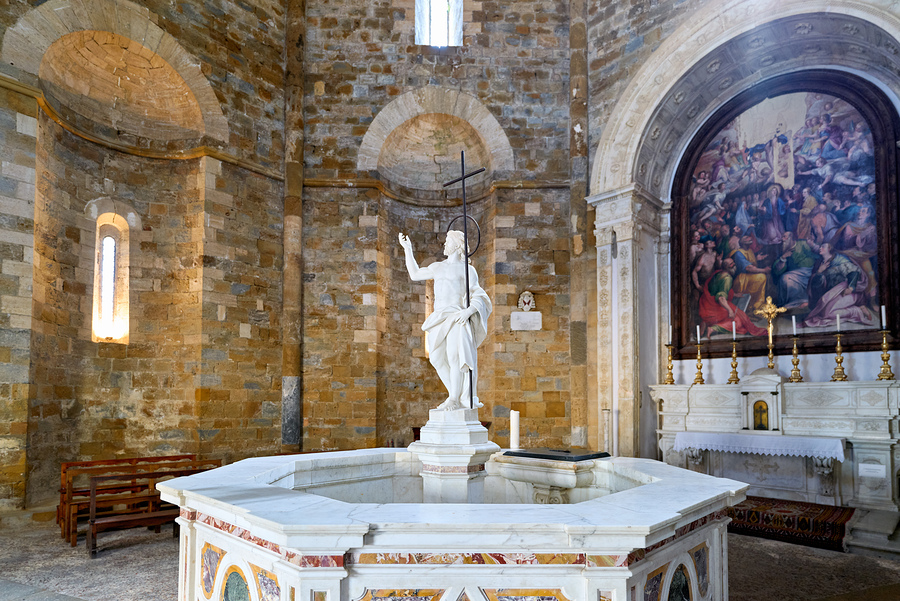 The Baptistery of San Giovanni shows a statue and an altar inside. Visitors can see the old stone walls and stained glass windows.