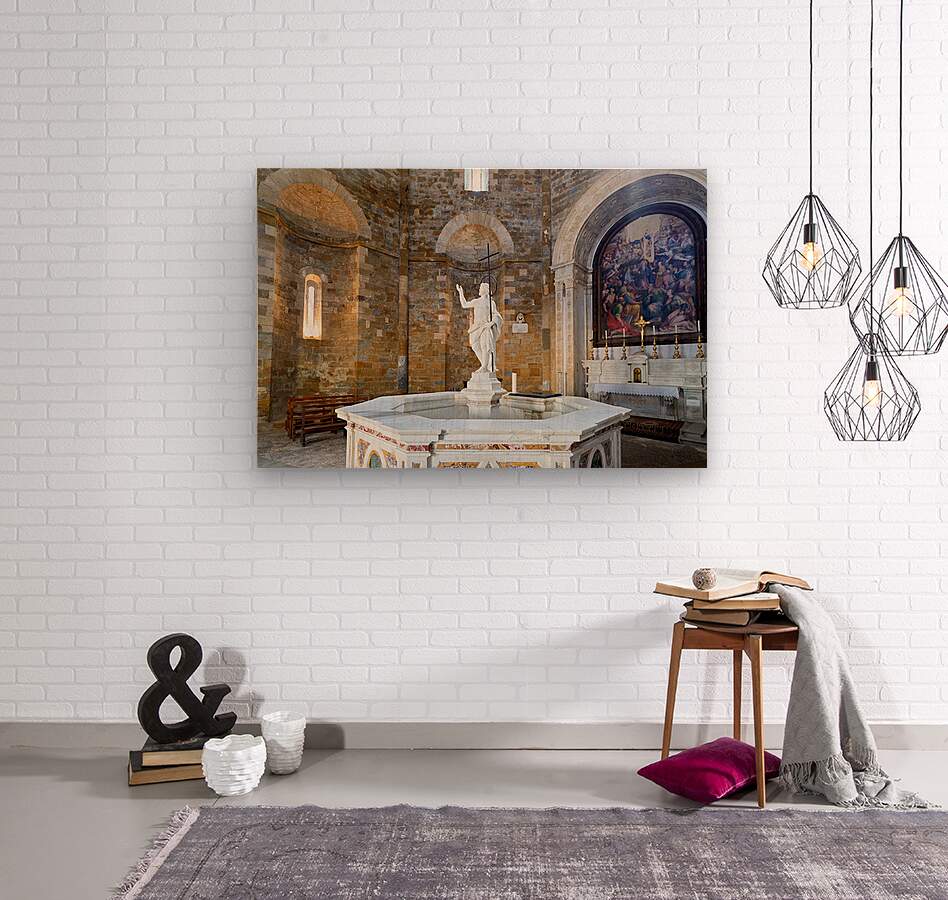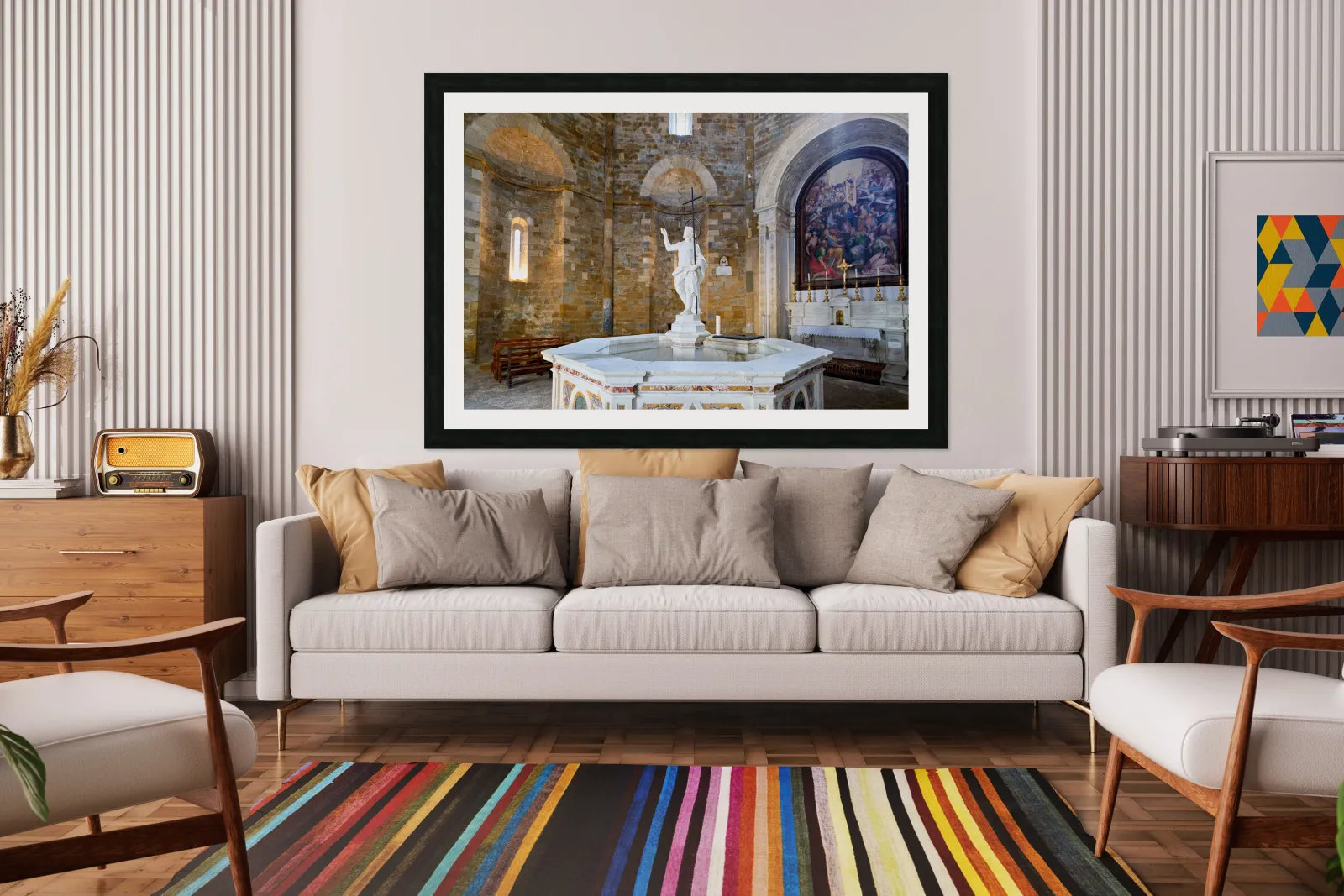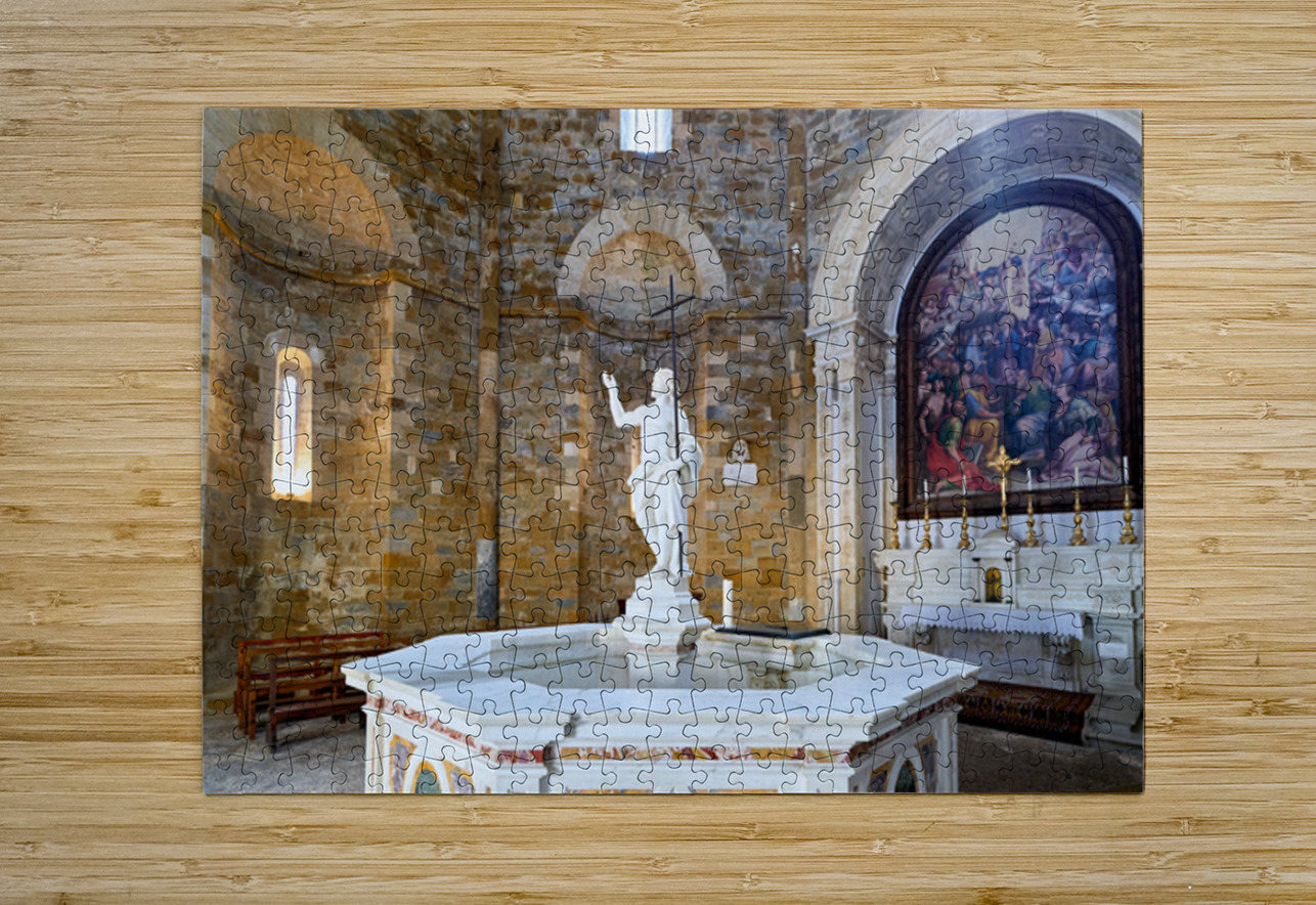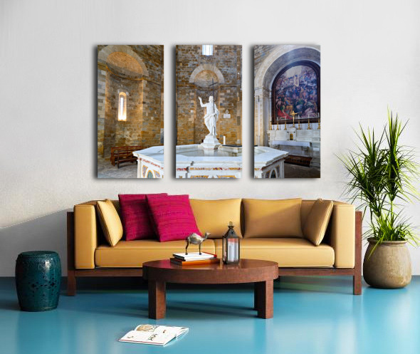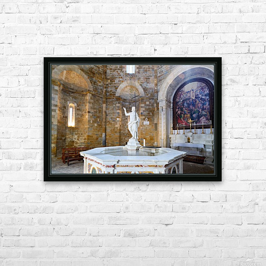 The Baptistery of San Giovanni shows a statue and an altar inside. Visitors can see the old stone walls and stained glass windows.