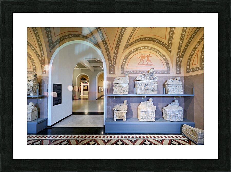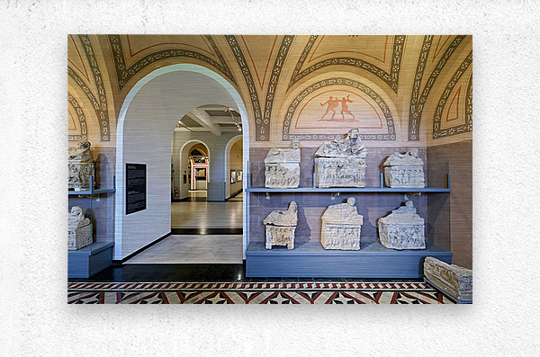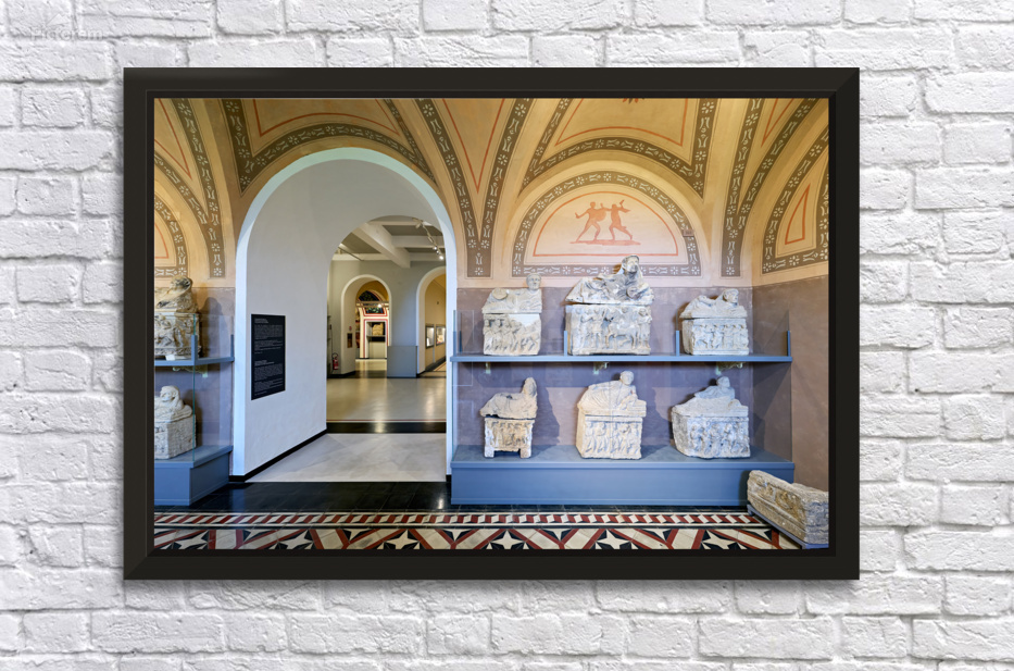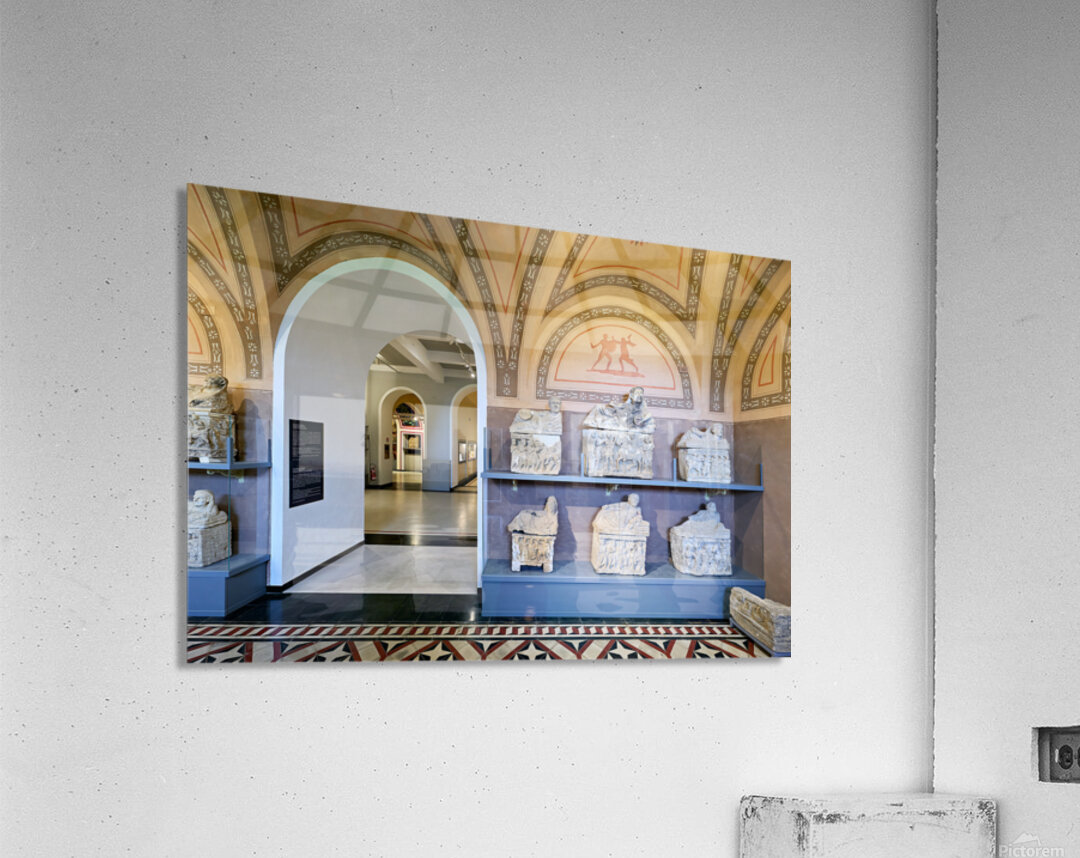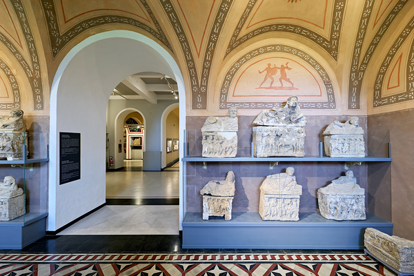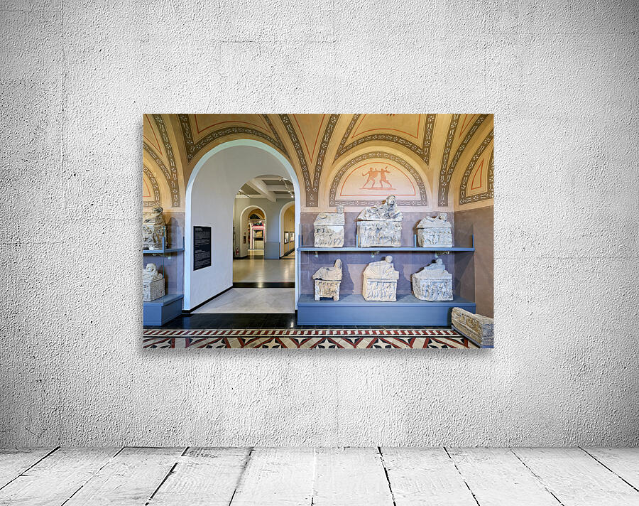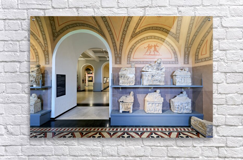 Cinerary urns are arranged on shelves in Guarnacci Museum. Visitors can explore Etruscan artifacts in Volterra Italy.