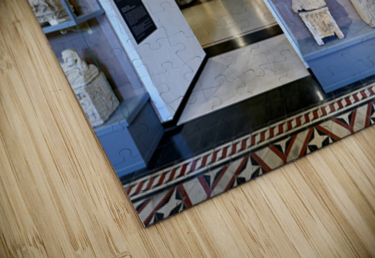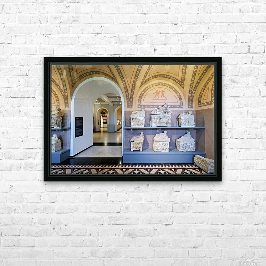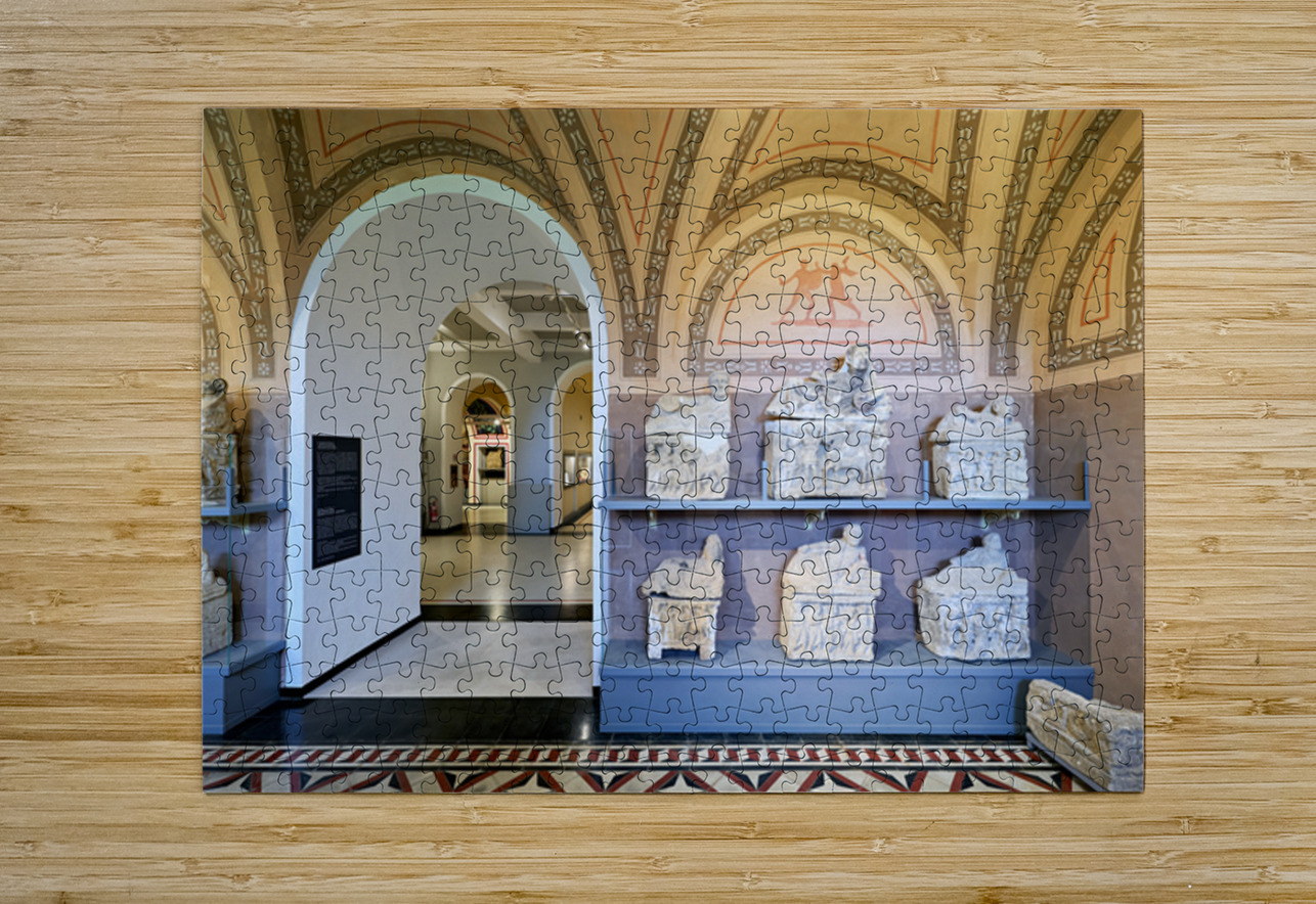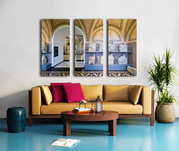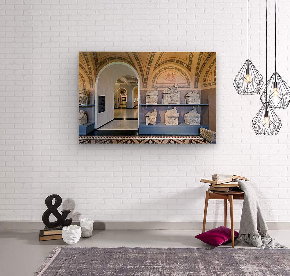 Cinerary urns are arranged on shelves in Guarnacci Museum. Visitors can explore Etruscan artifacts in Volterra Italy.