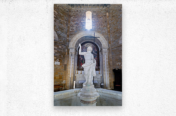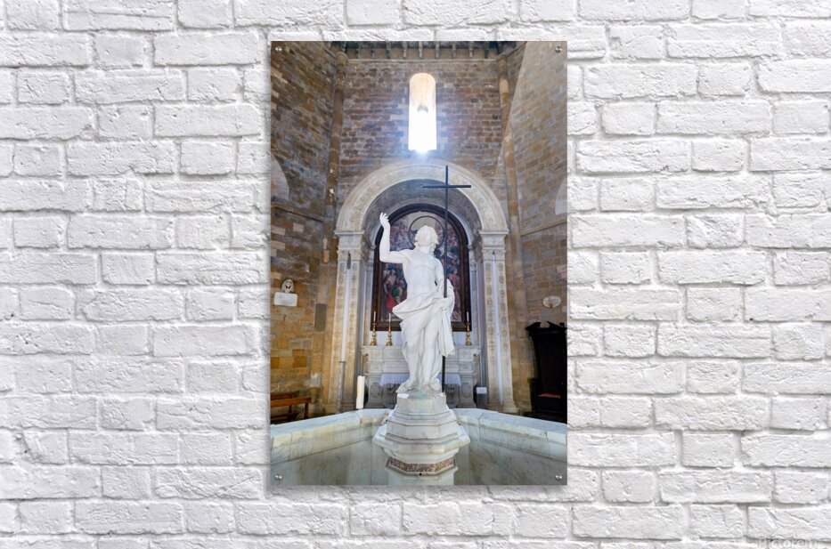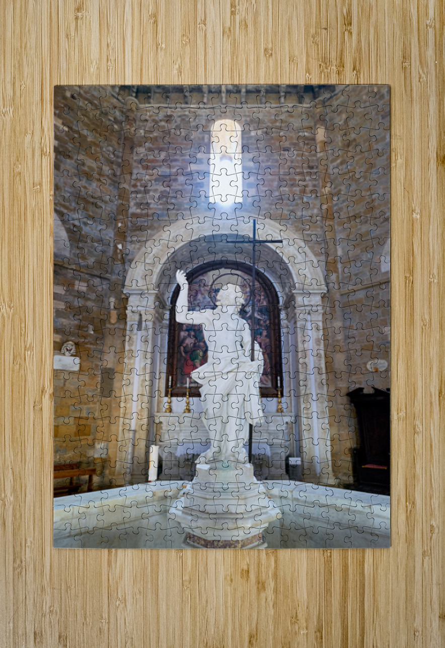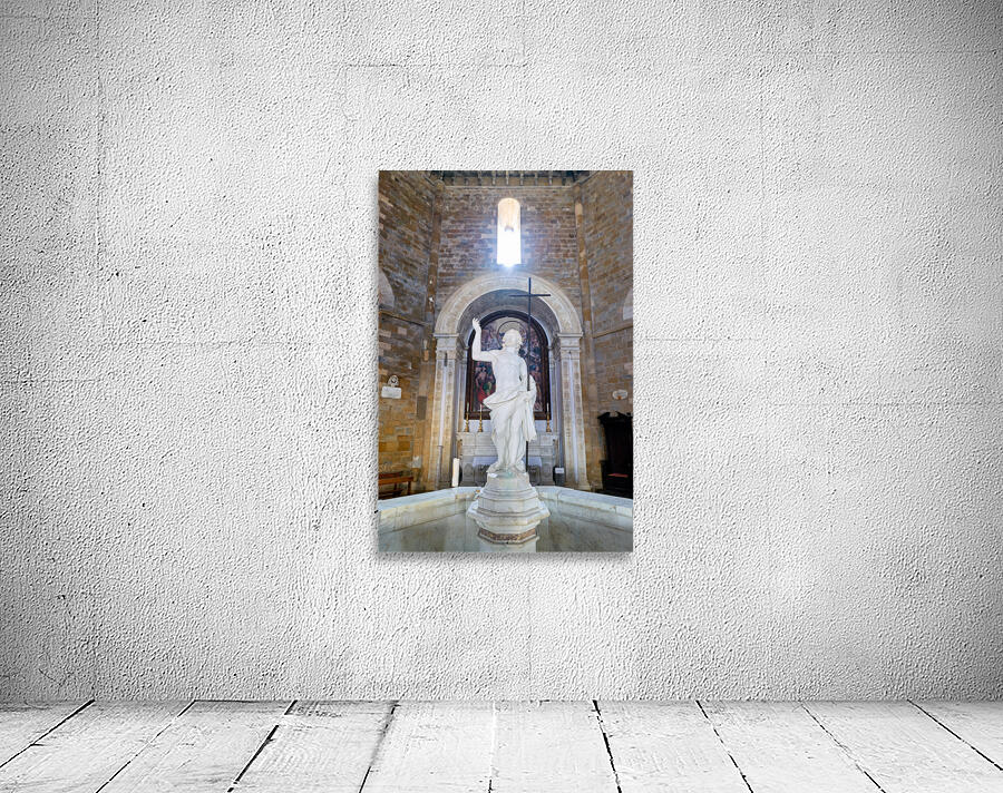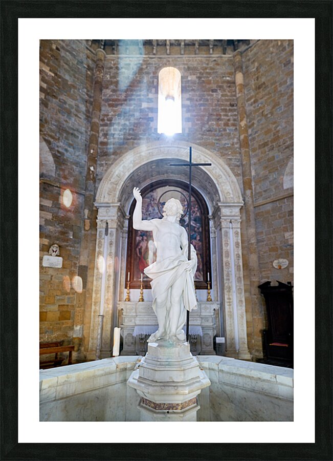 Visitors explore the Baptistery of San Giovanni in Volterra. A statue stands at the center illuminated by natural light.