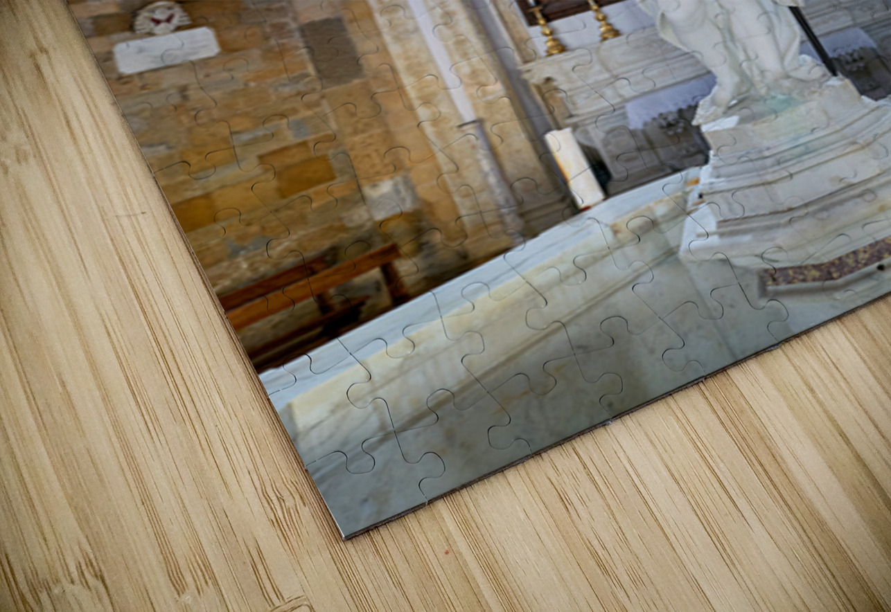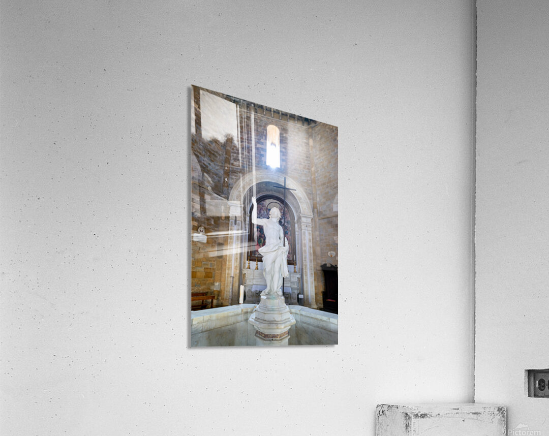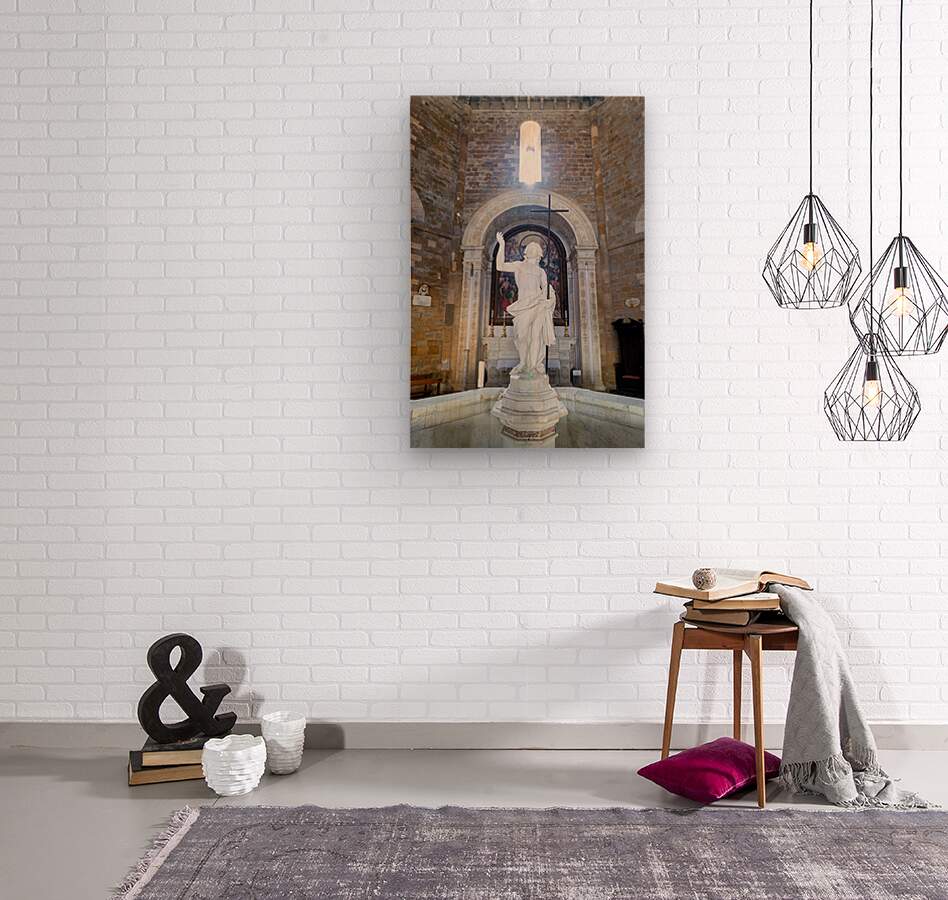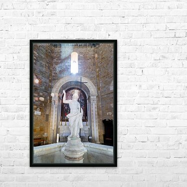 Visitors explore the Baptistery of San Giovanni in Volterra. A statue stands at the center illuminated by natural light.