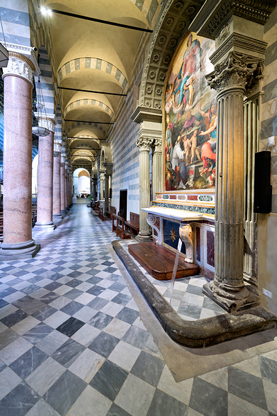 Visitors explore the interior of Cathedral Duomo di Volterra in Tuscany Italy. Details showcase columns and artwork along the hall.