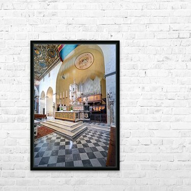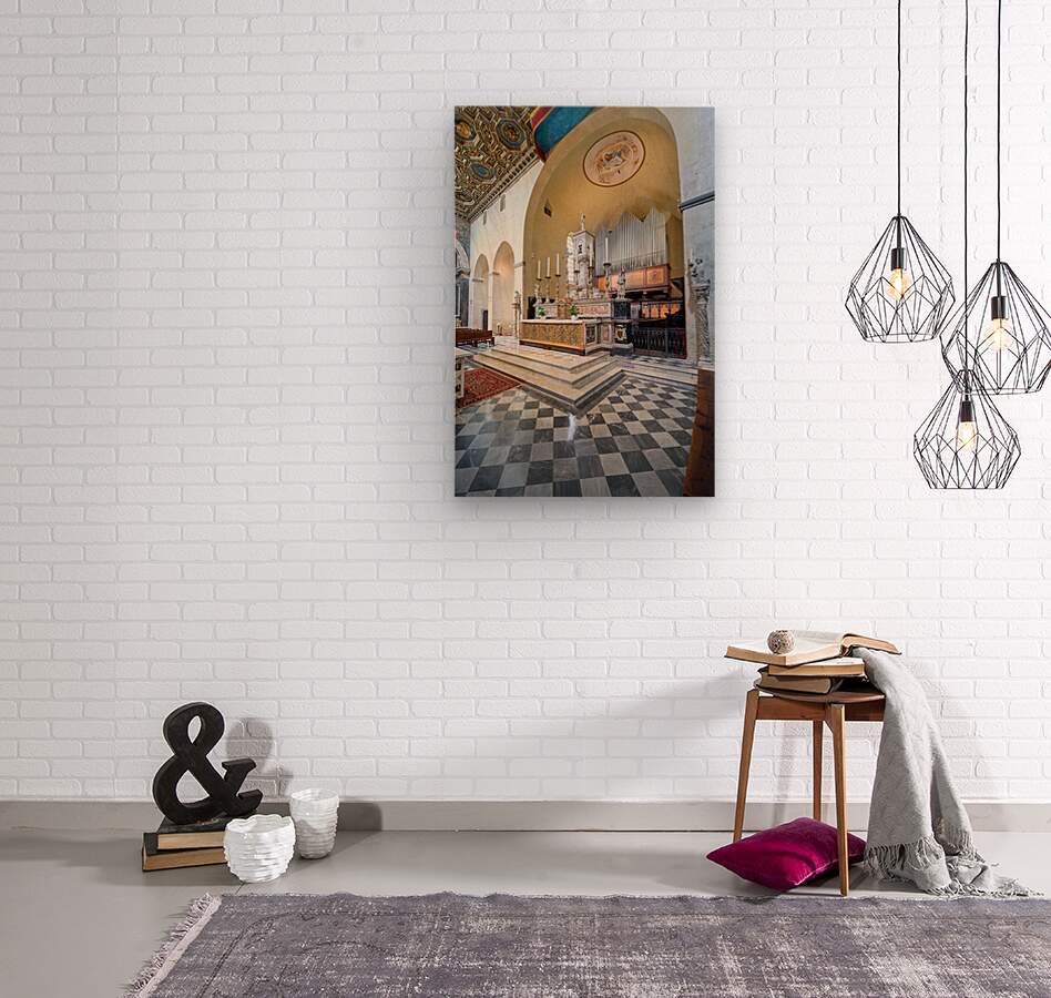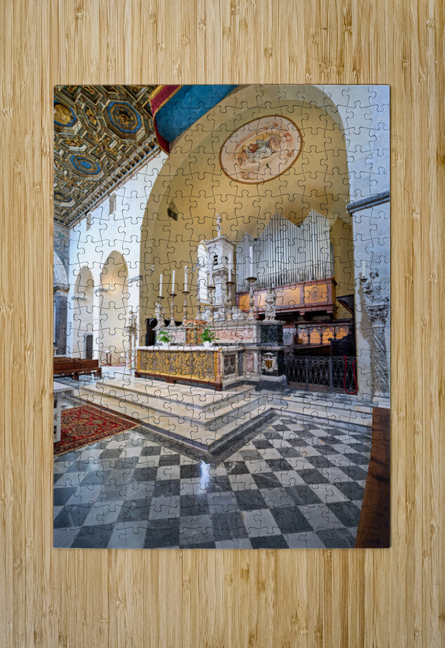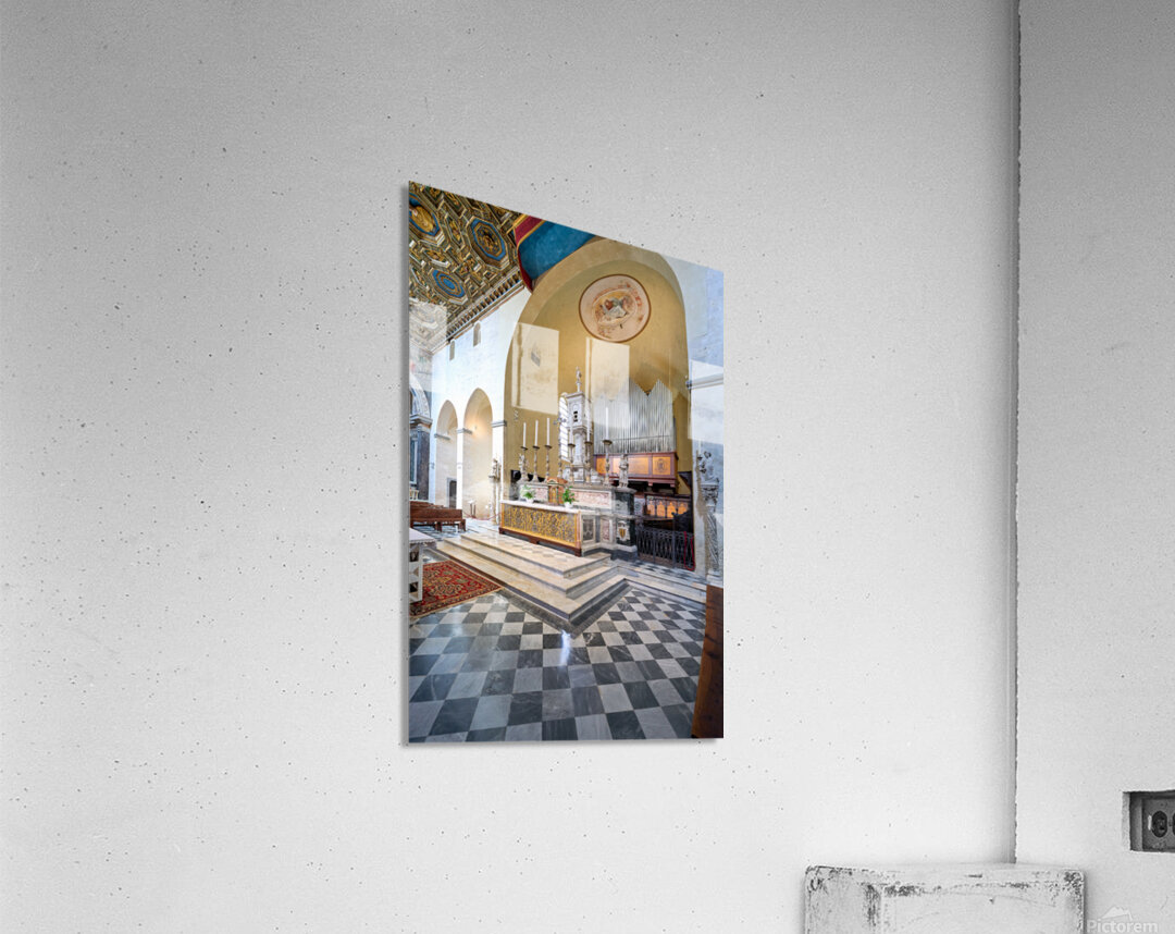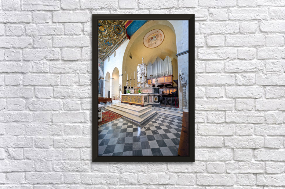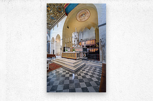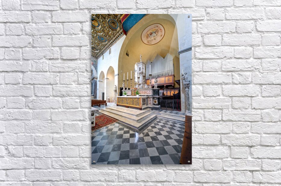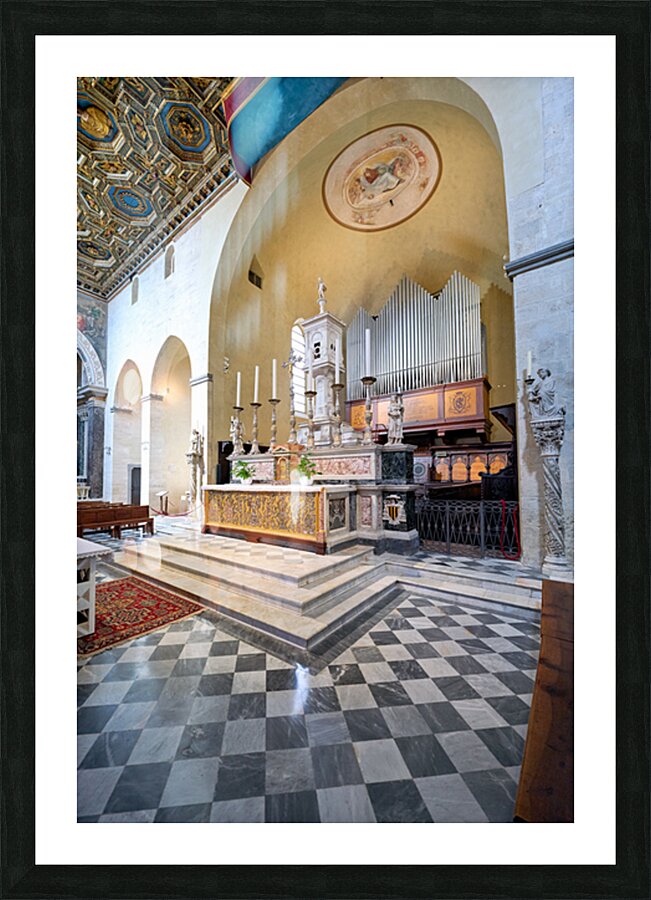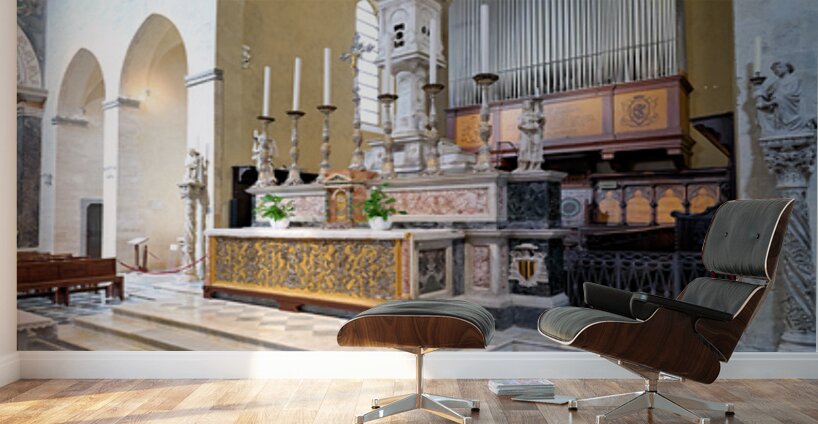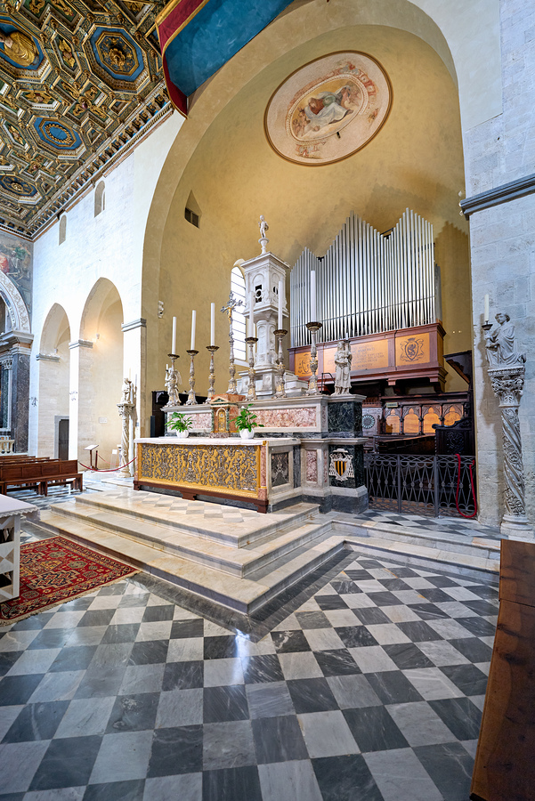 The altar of Duomo di Volterra shows carvings and organ. Sunlight enters through tall windows. Visitors walk around the historic space.