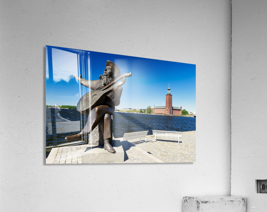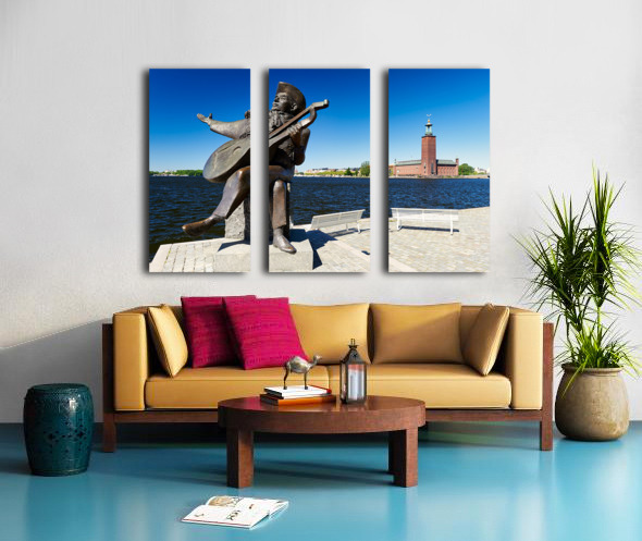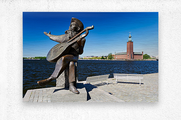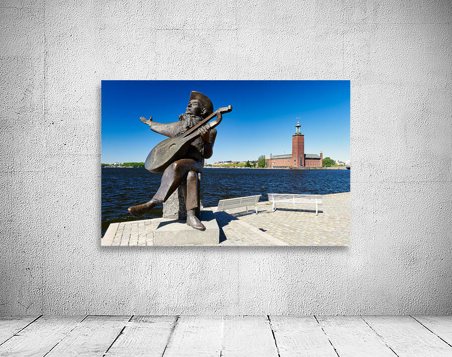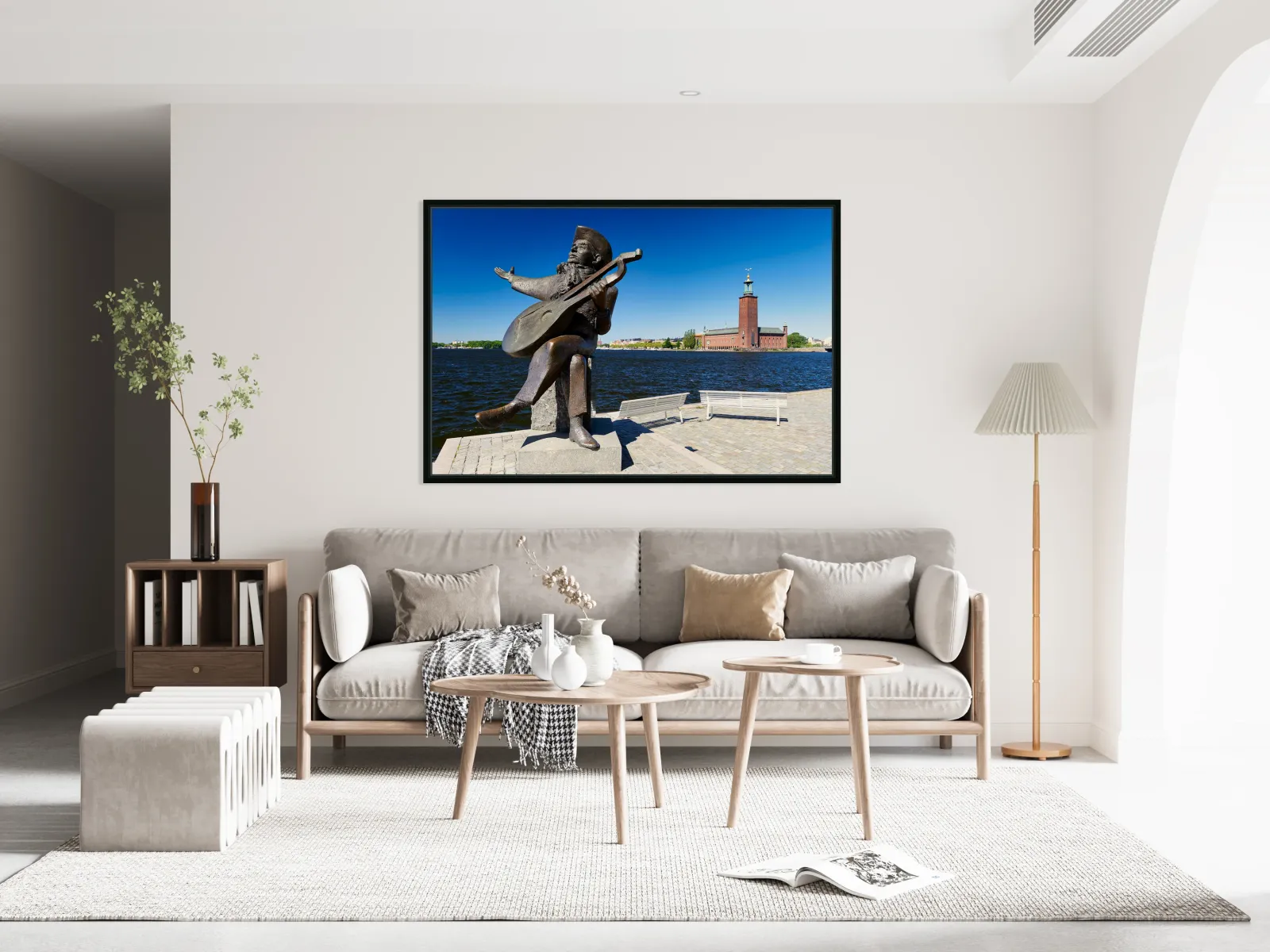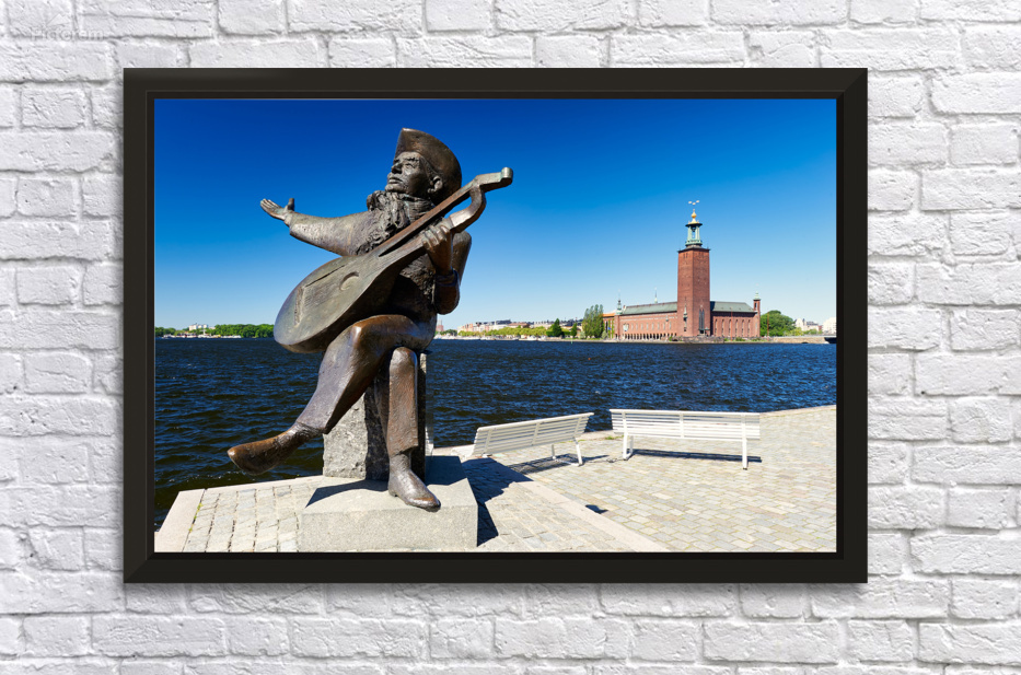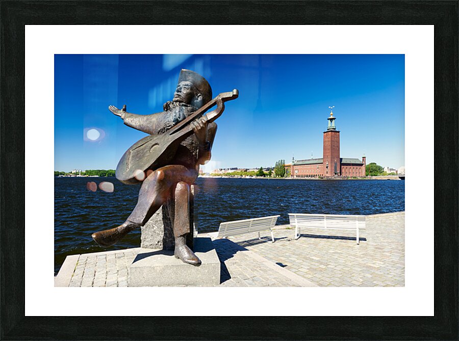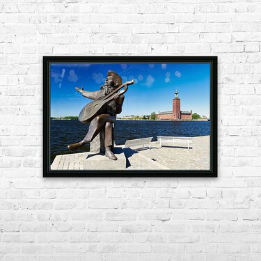 "Evert Taube statue and City Hall by the water in Stockholm" in a framed print.