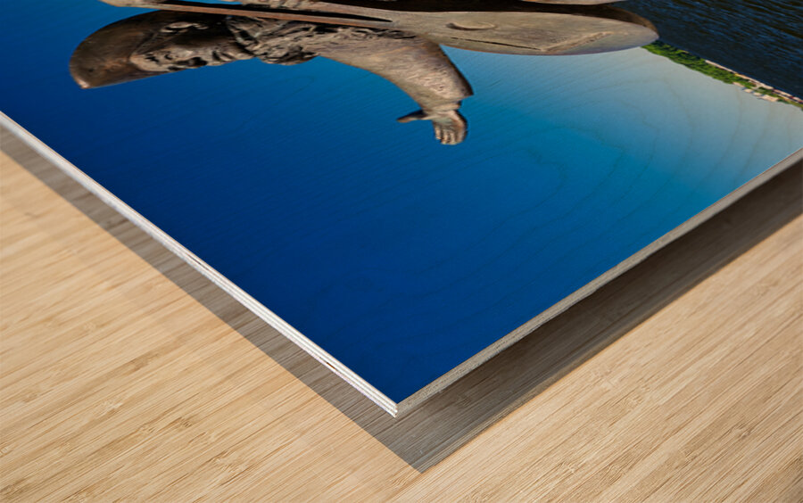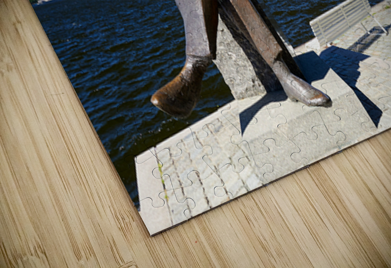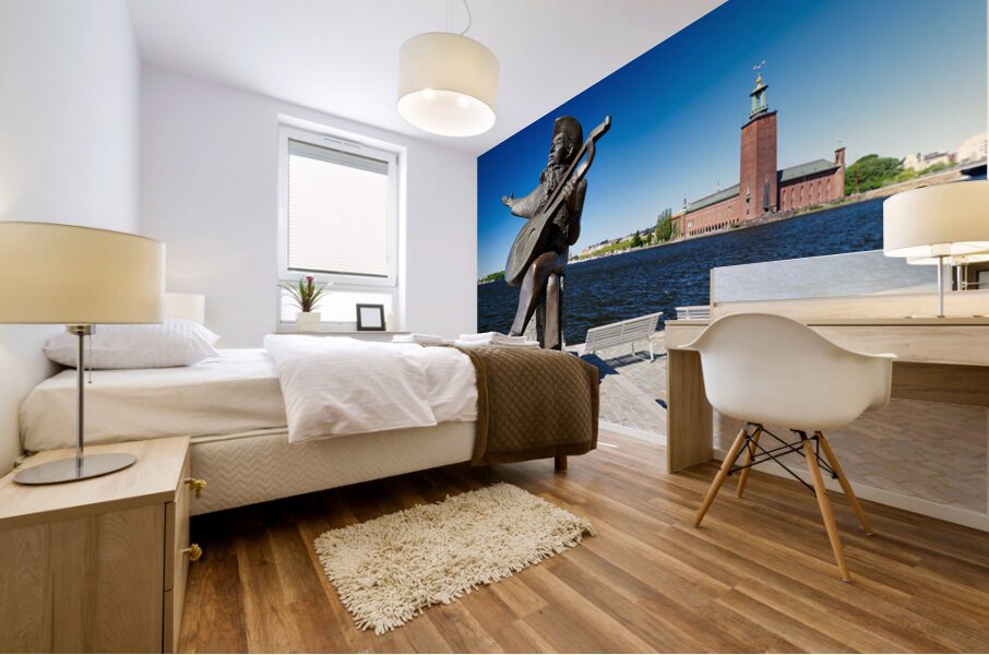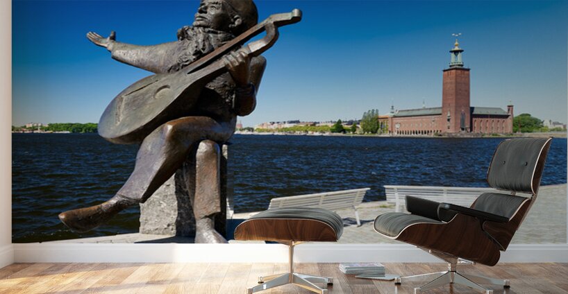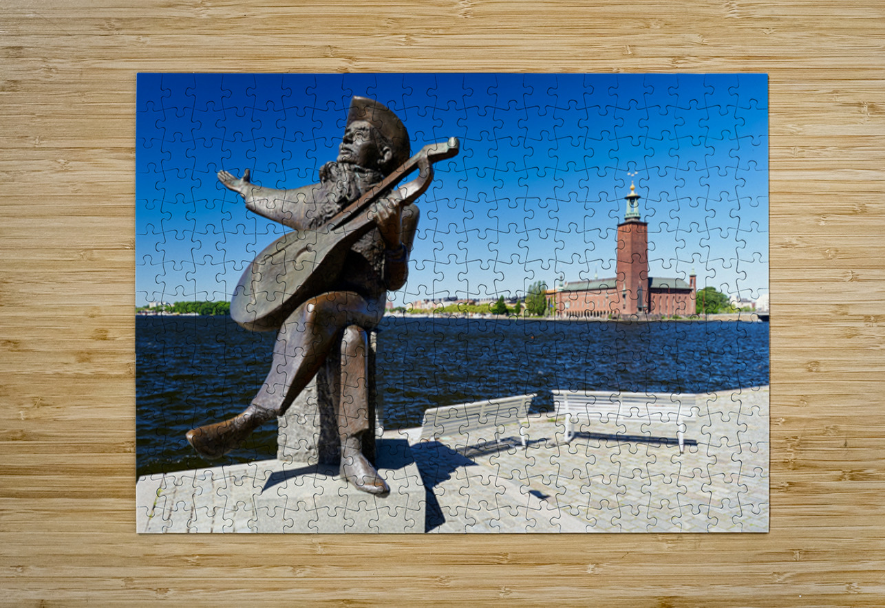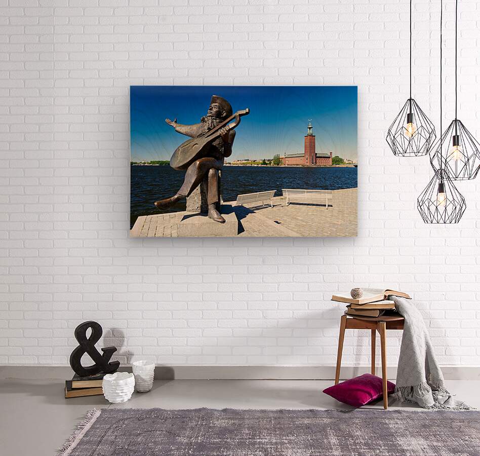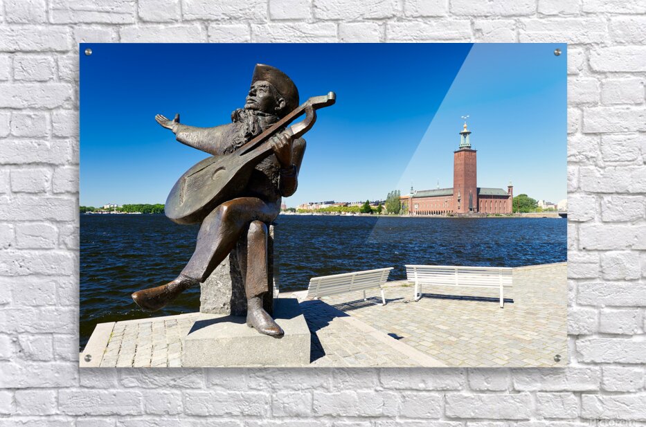 "Evert Taube statue and City Hall by the water in Stockholm" in a framed print.