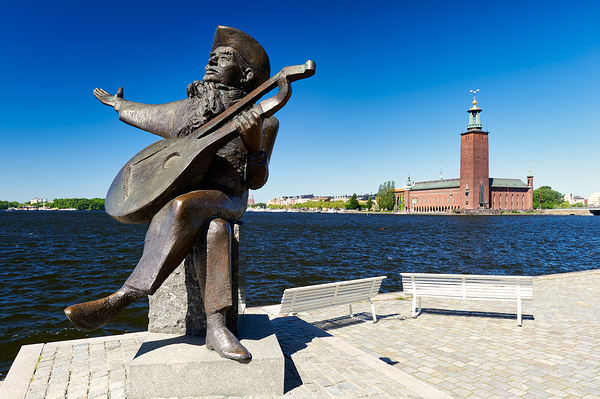 Evert Taube statue sits near the water with City Hall in the background on a clear day in Kungsholmen Stockholm.