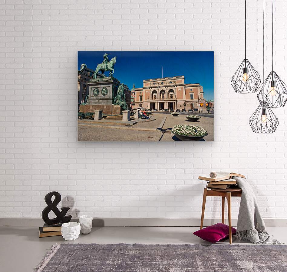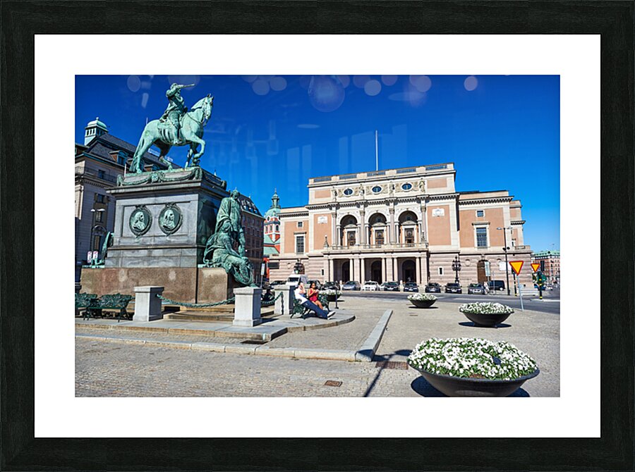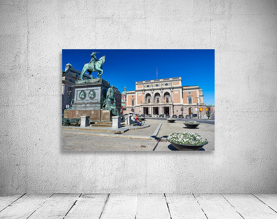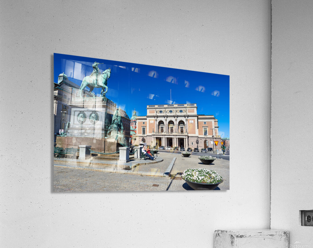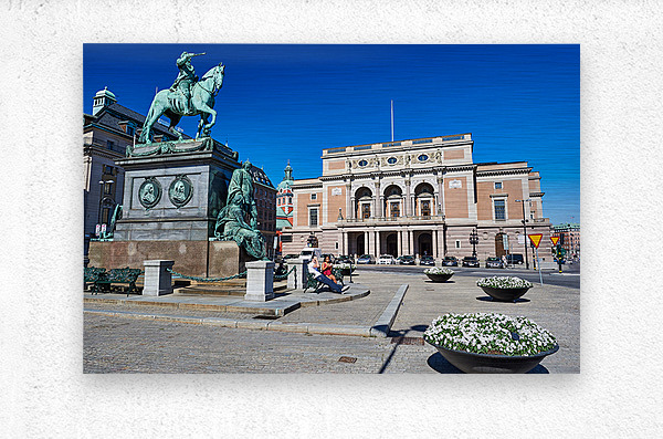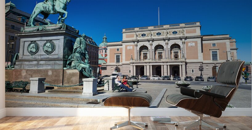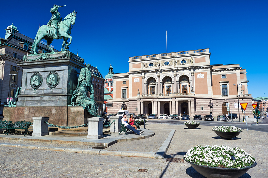 People walk and rest in Gamla Stan Stockholm. The equestrian statue stands tall near the historic building. The sky is clear and bright.