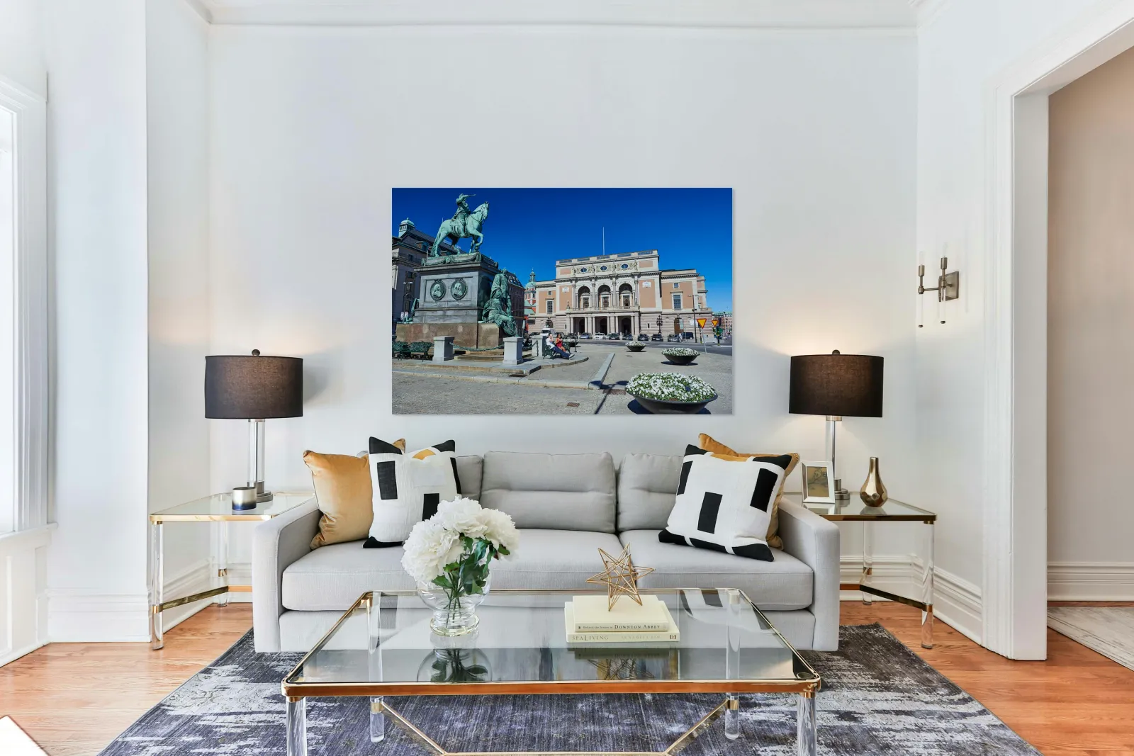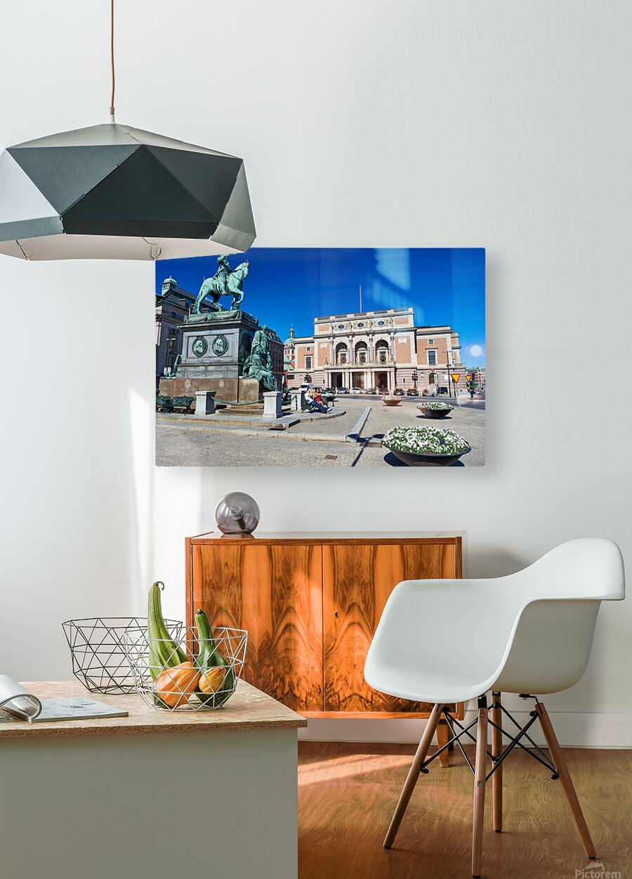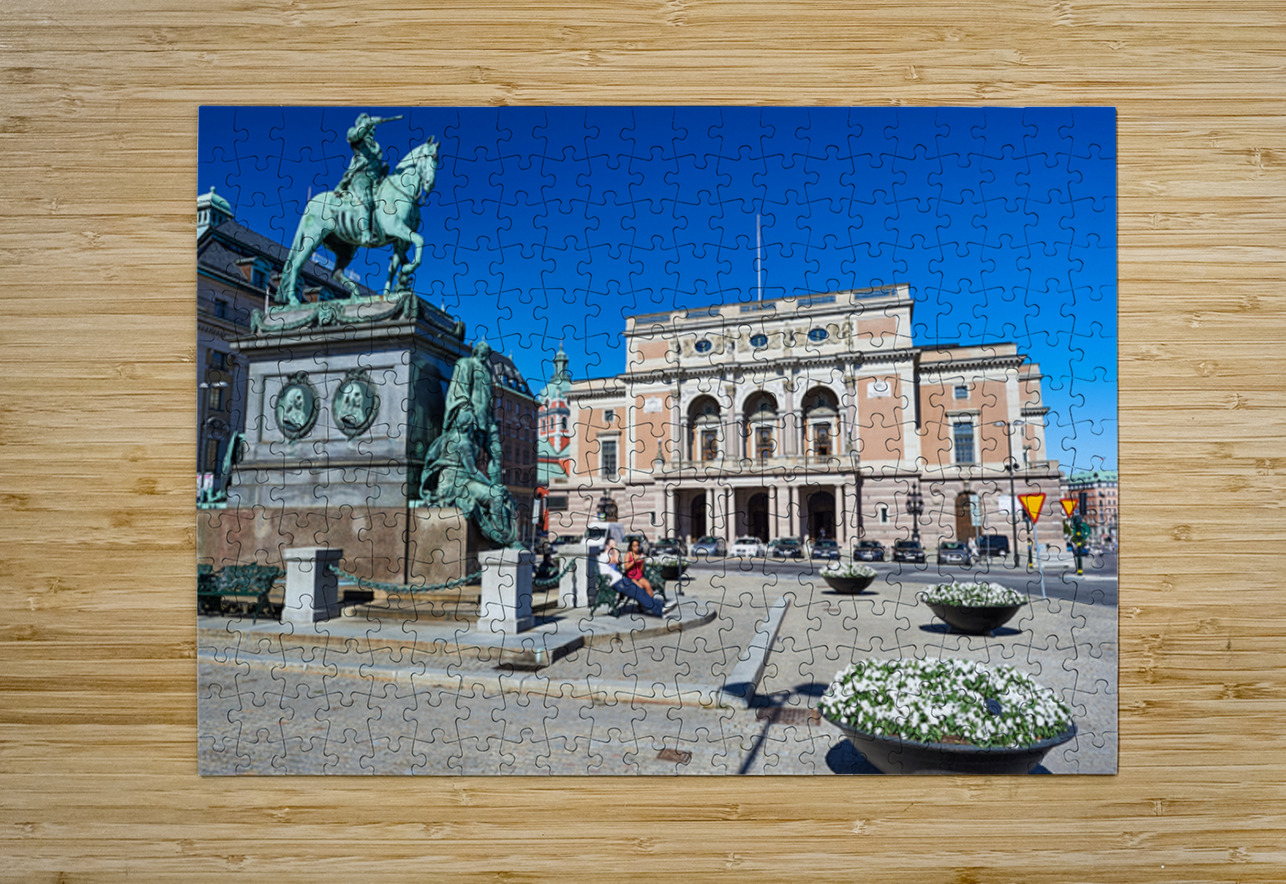 People walk and rest in Gamla Stan Stockholm. The equestrian statue stands tall near the historic building. The sky is clear and bright.