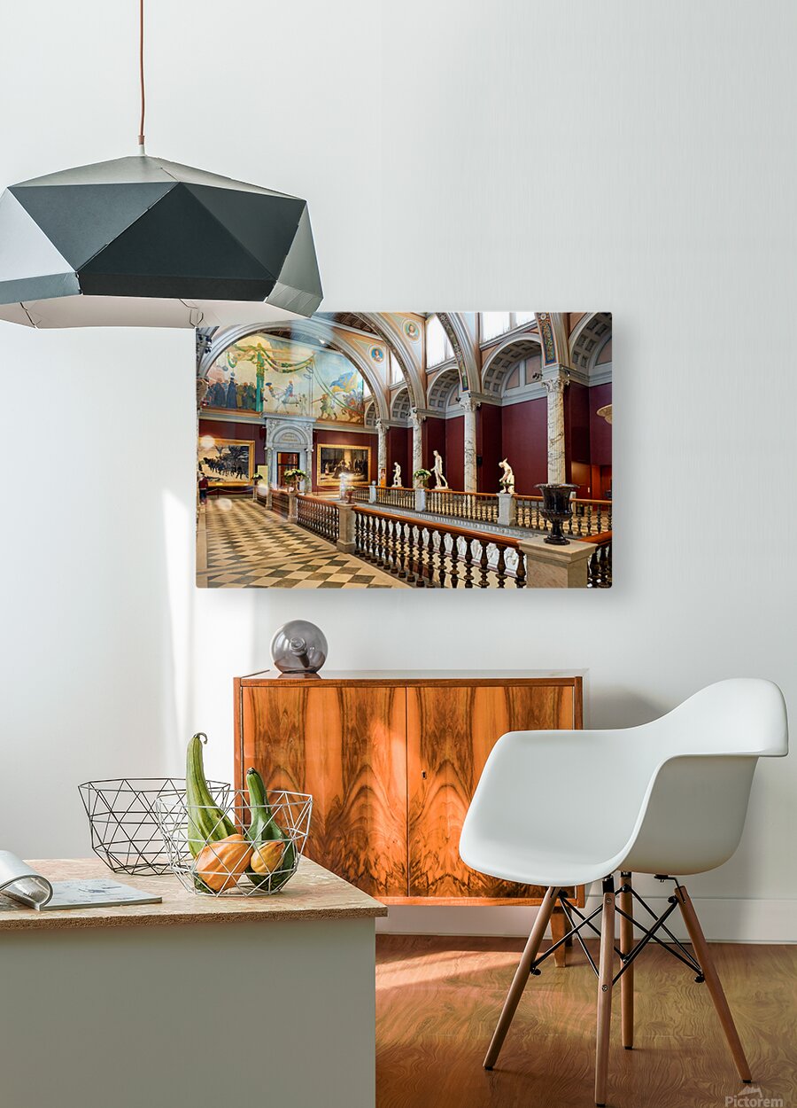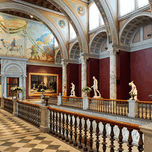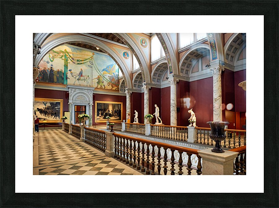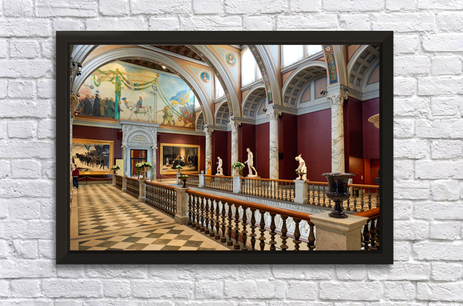 Visitors explore the halls of Stockholm Nationalmuseum. Artwork and sculptures are displayed prominently. The architecture shows historic design.