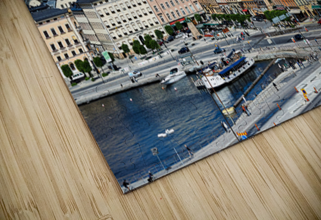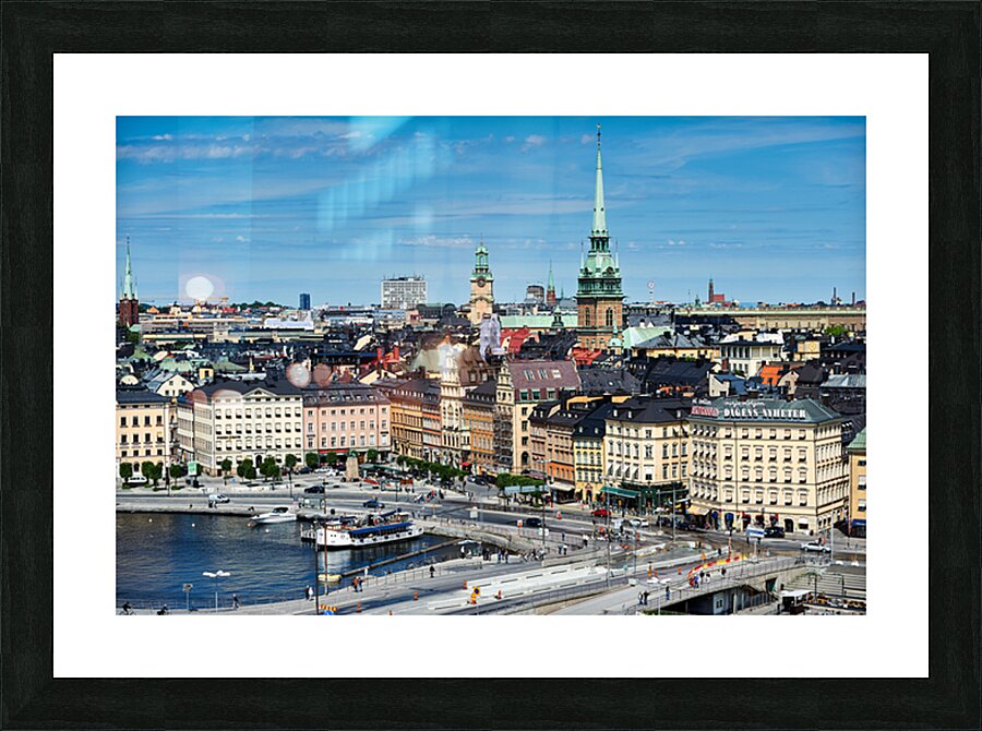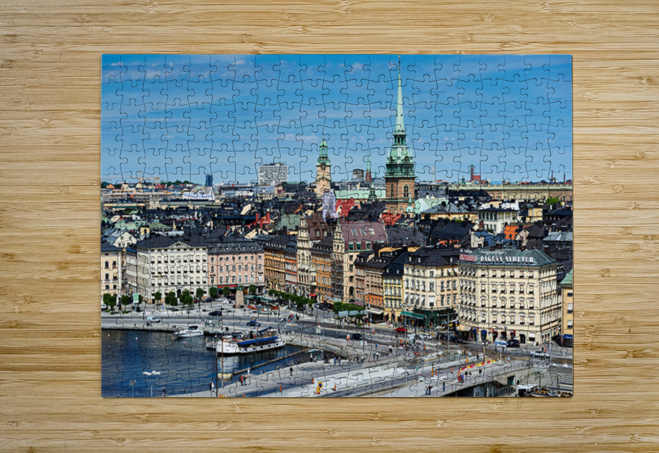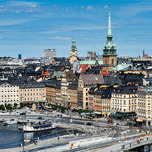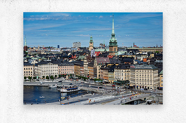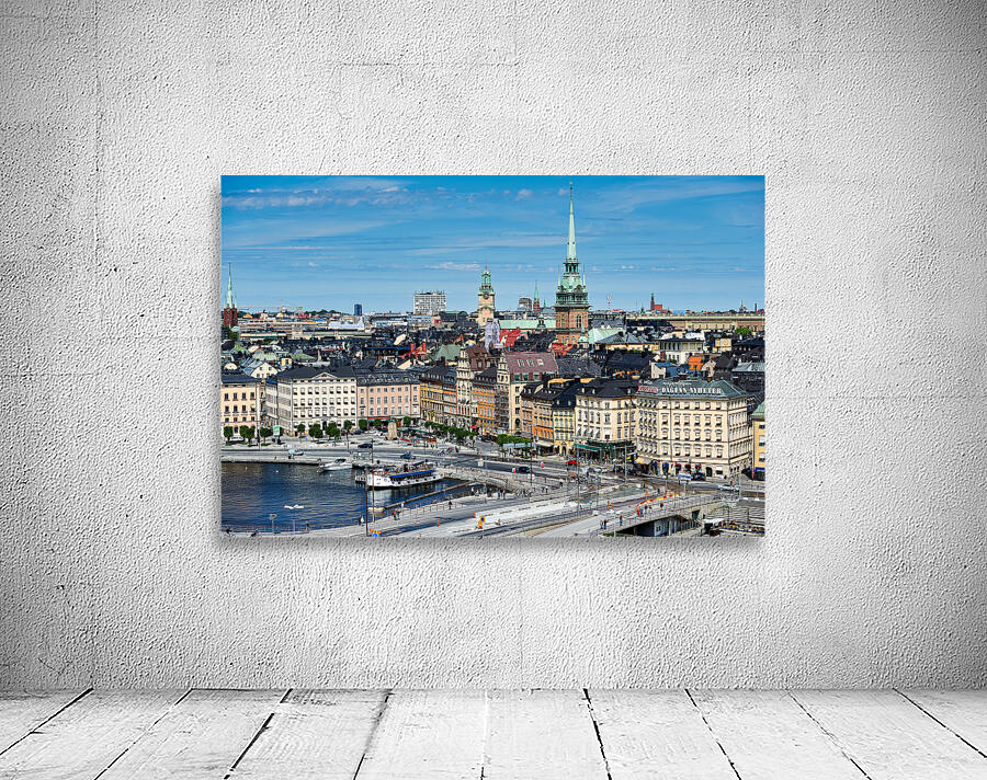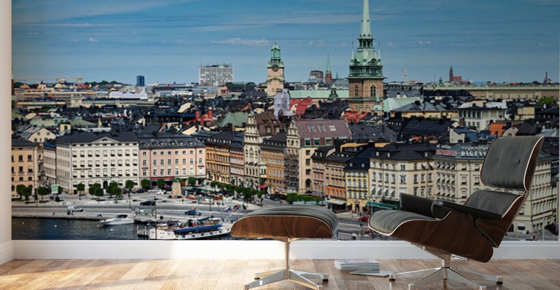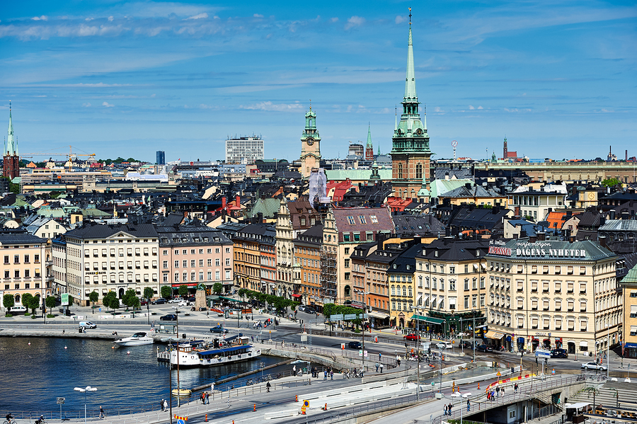 City life unfolds on Riddarholmen Island with buildings water and people enjoying time in Stockholms old town area under a clear sky.